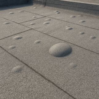 The modified bitumen roof had large blisters visible over a large portion of the roof. Although they may look like a significant issue, blisters do not cause premature failure of the modified bitumen or affect its ability to shed water.