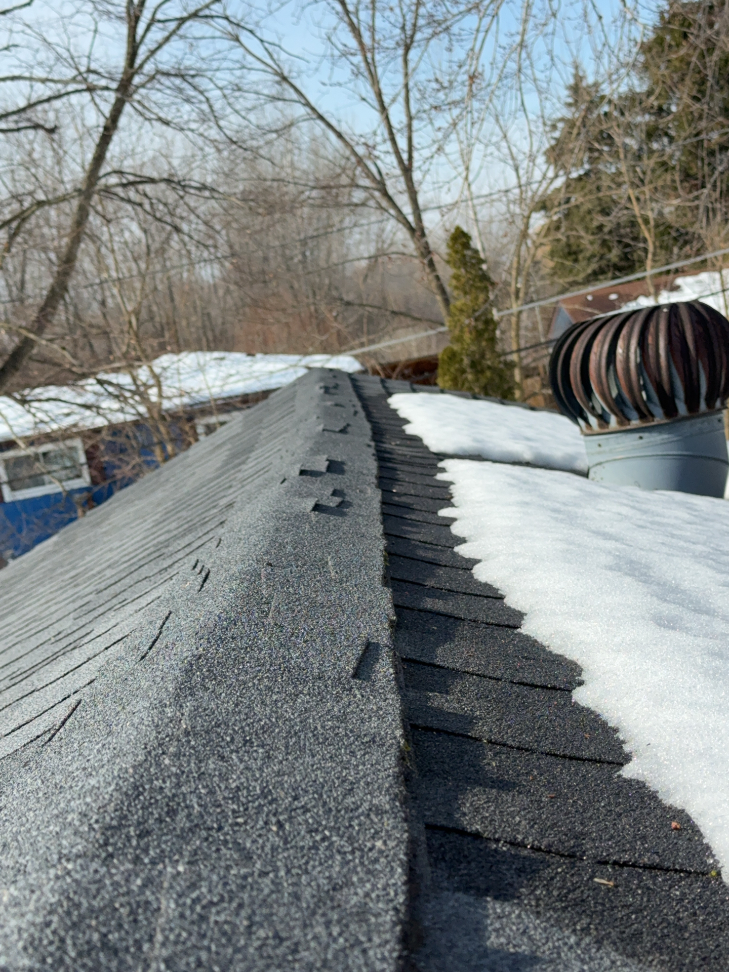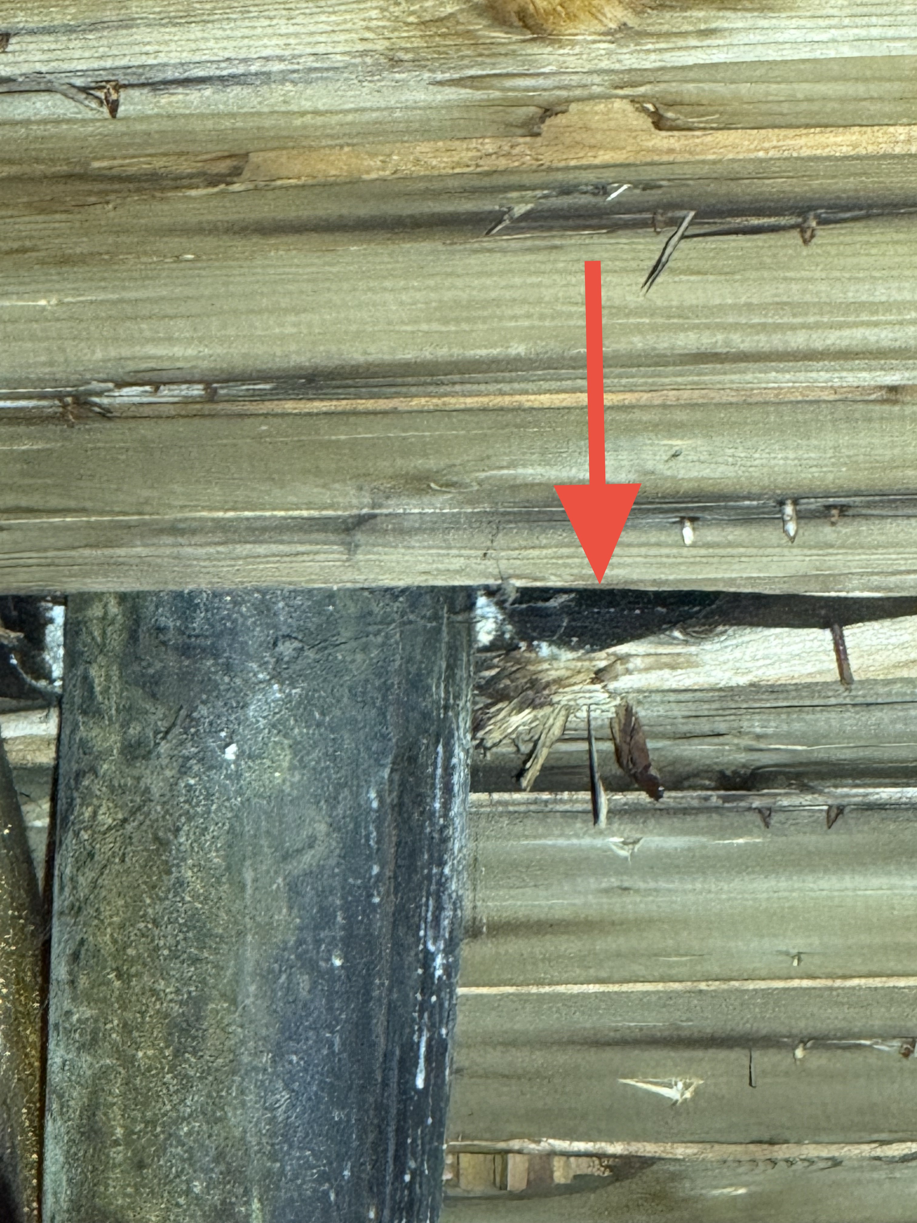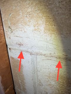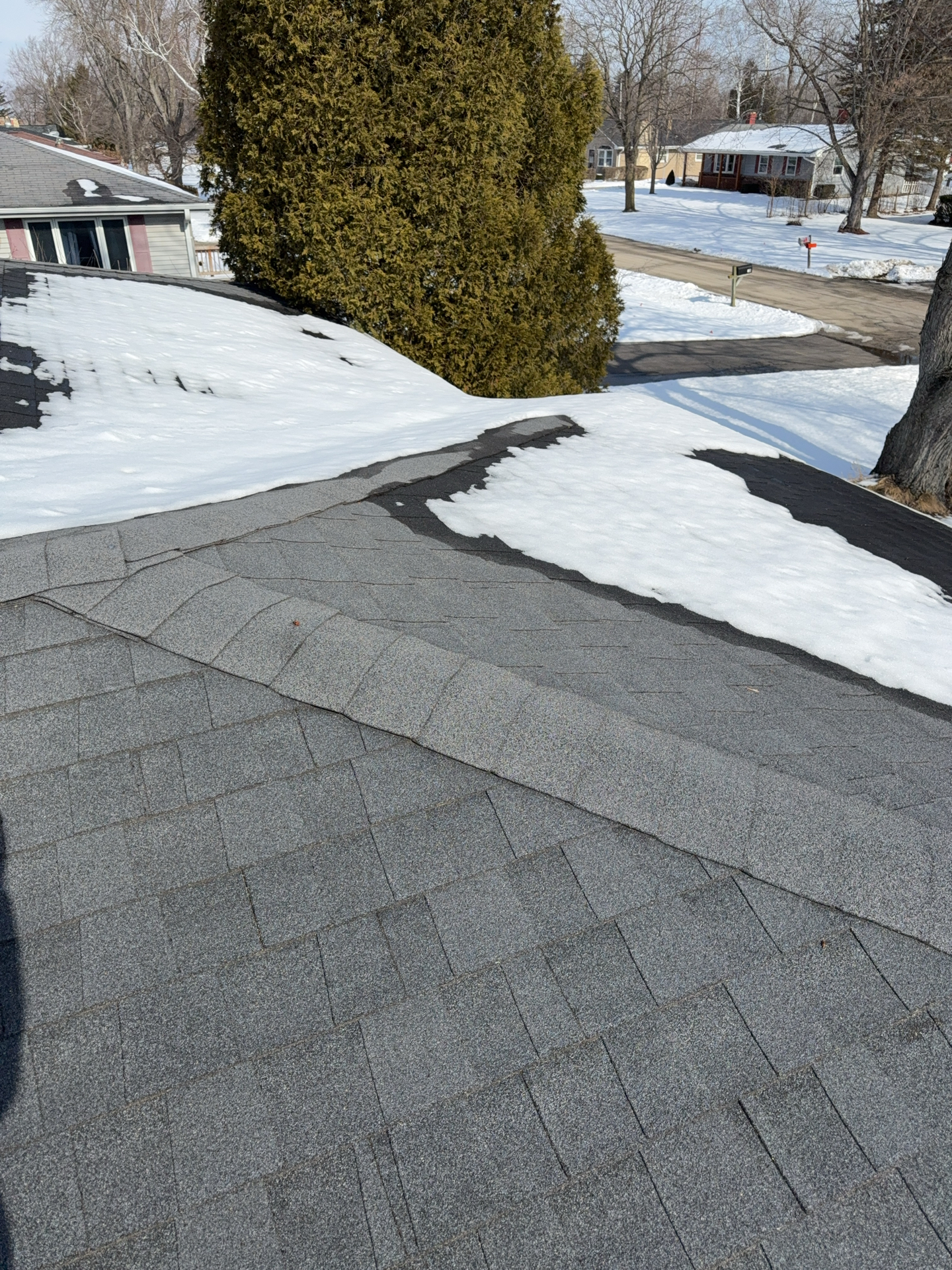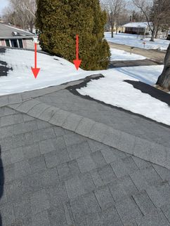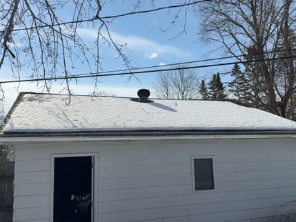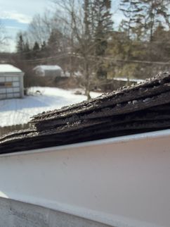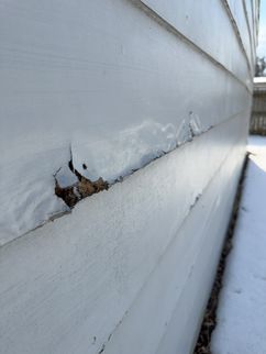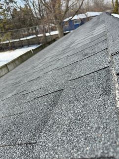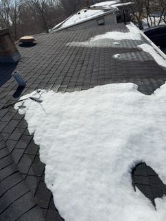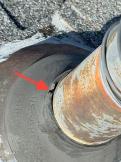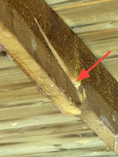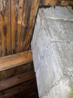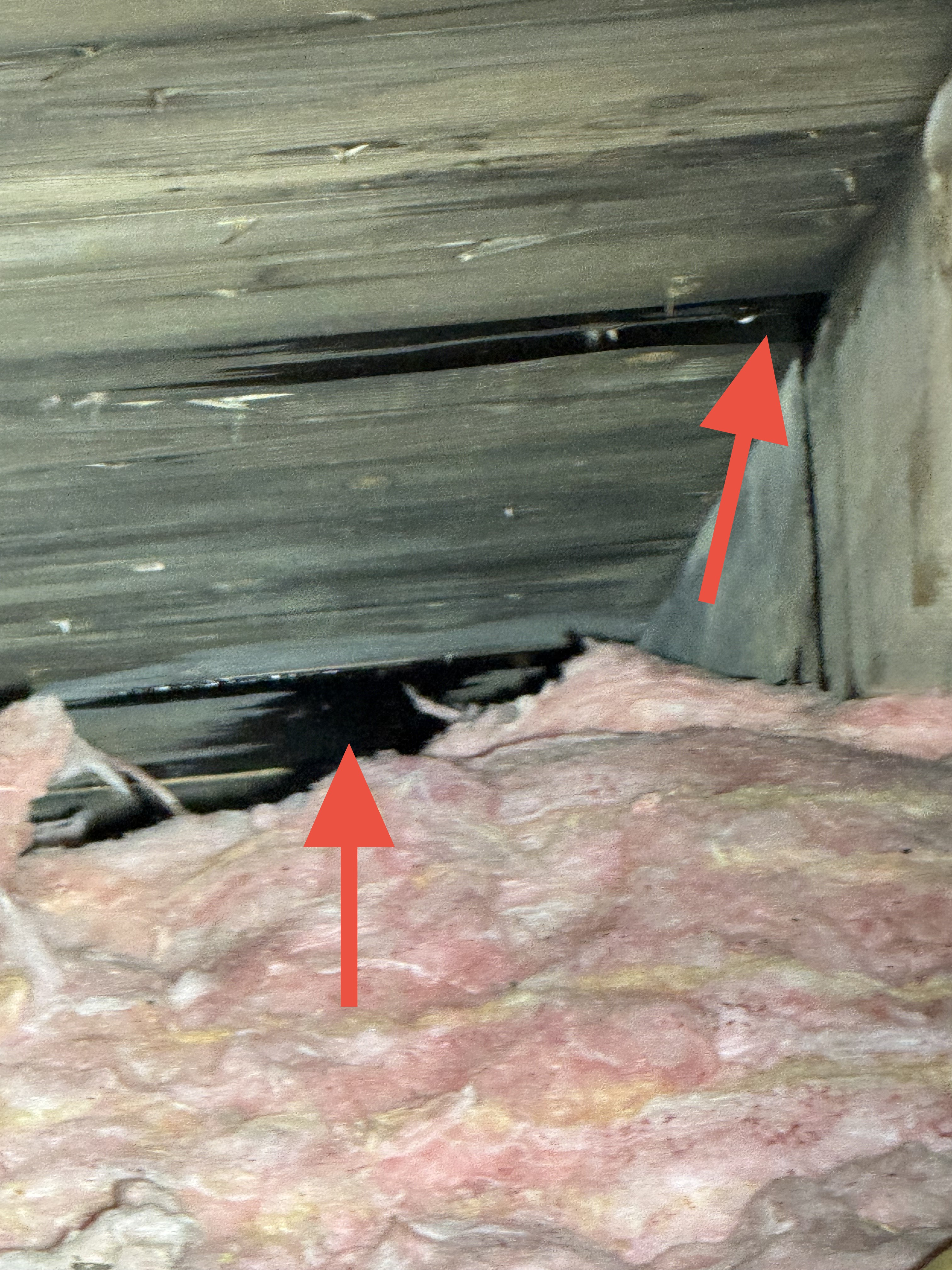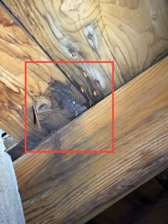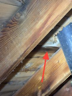 A cracked rafter was observed on the South roof plane, with visible signs of separation. Additionally, the roof framing lacked recommended collar ties that provide supplemental structural support. The presence of two layers of roofing materials, combined with seasonal snow loading, may increase structural demands on the framing and contribute to the need for additional stabilization.