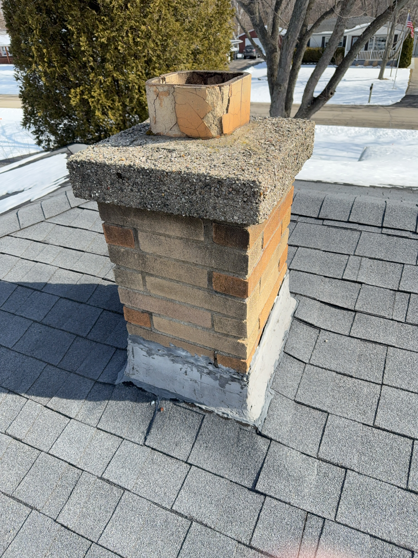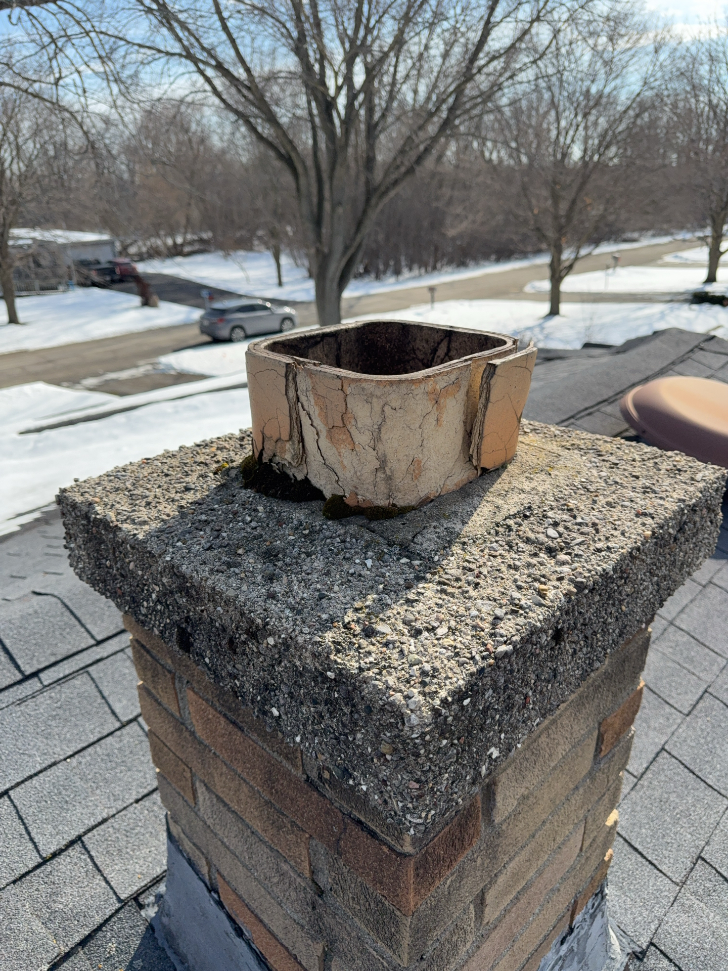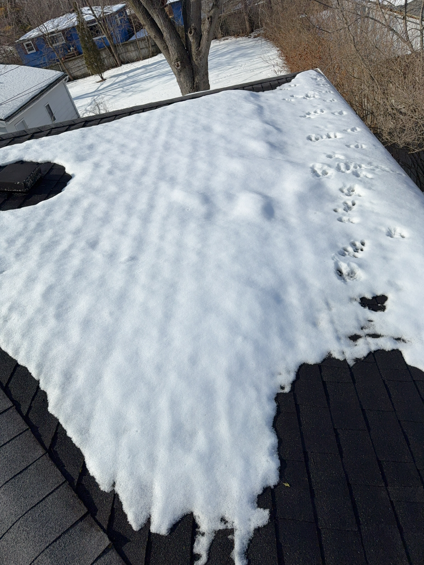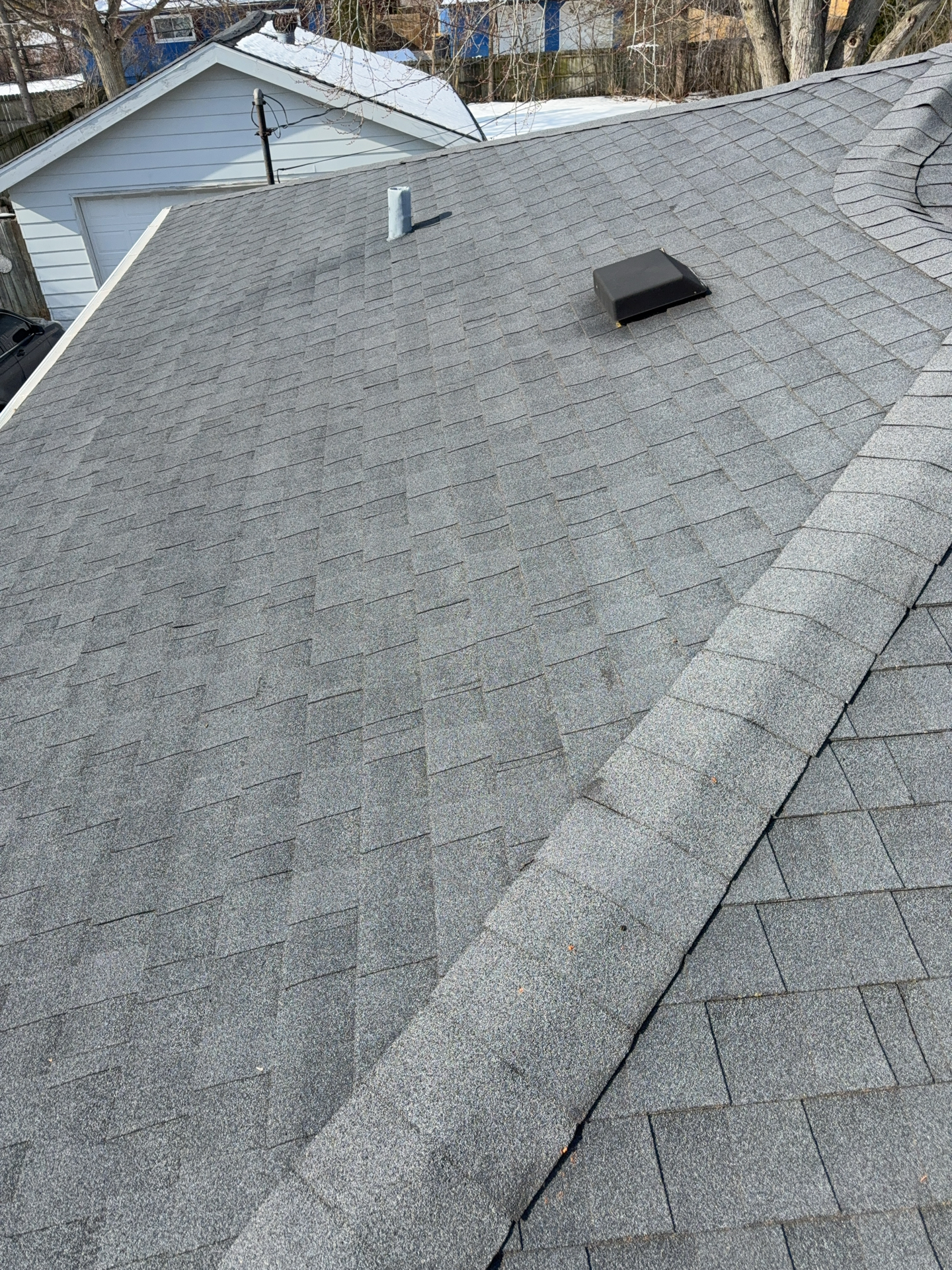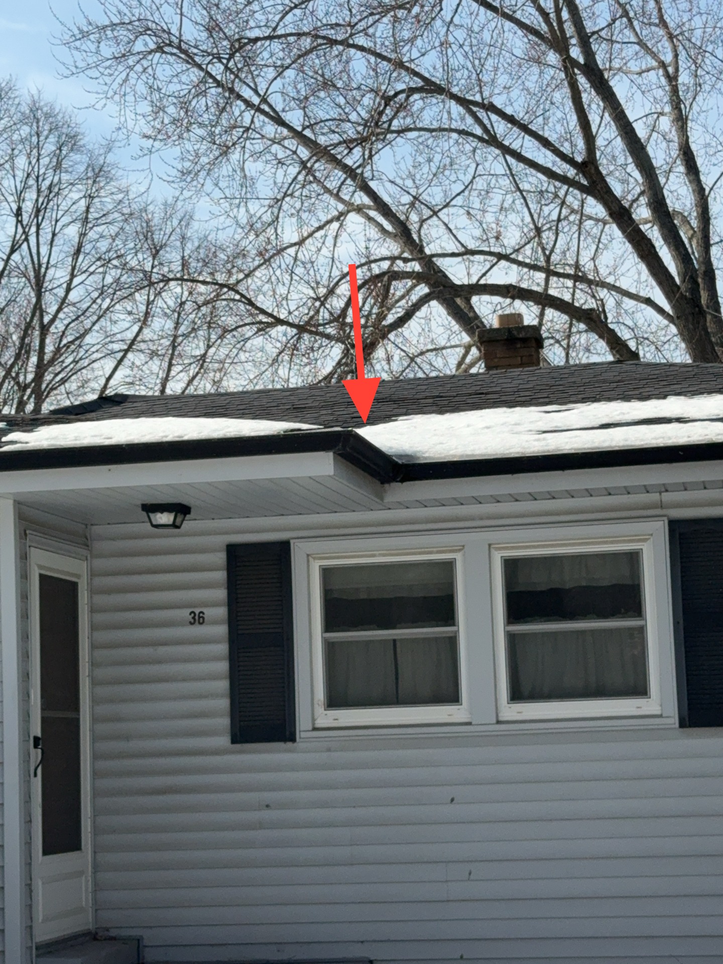 A cracked rafter was observed on the South roof plane, with visible signs of separation. Additionally, the roof framing lacked recommended collar ties that provide supplemental structural support. The presence of two layers of roofing materials, combined with seasonal snow loading, may increase structural demands on the framing and contribute to the need for additional stabilization.