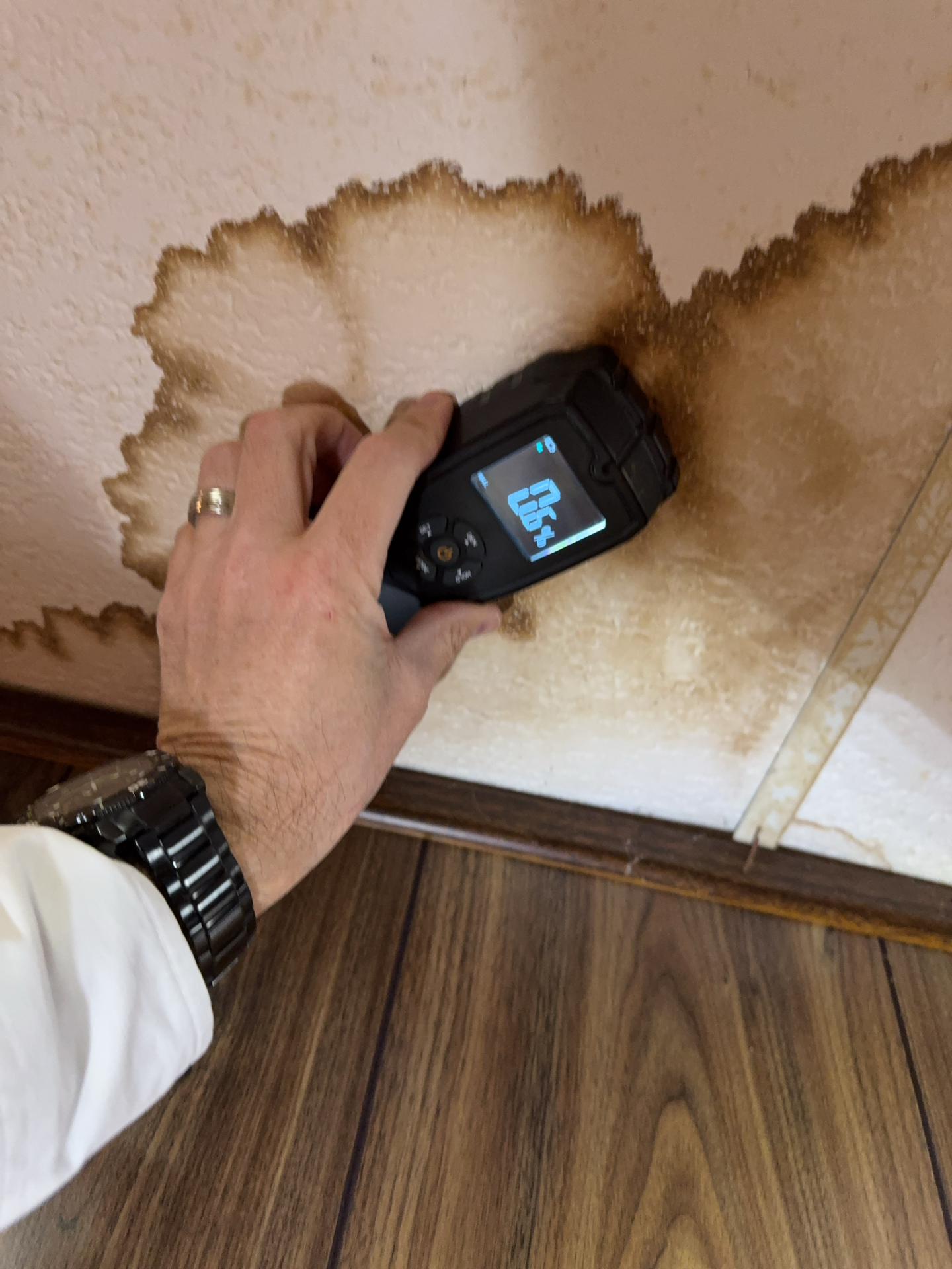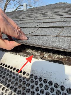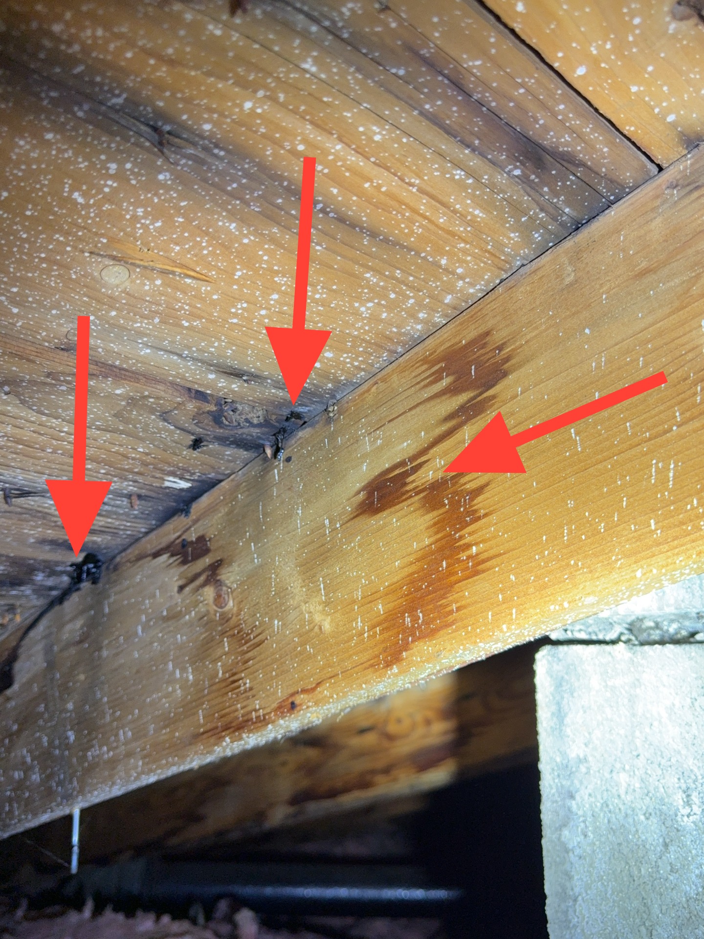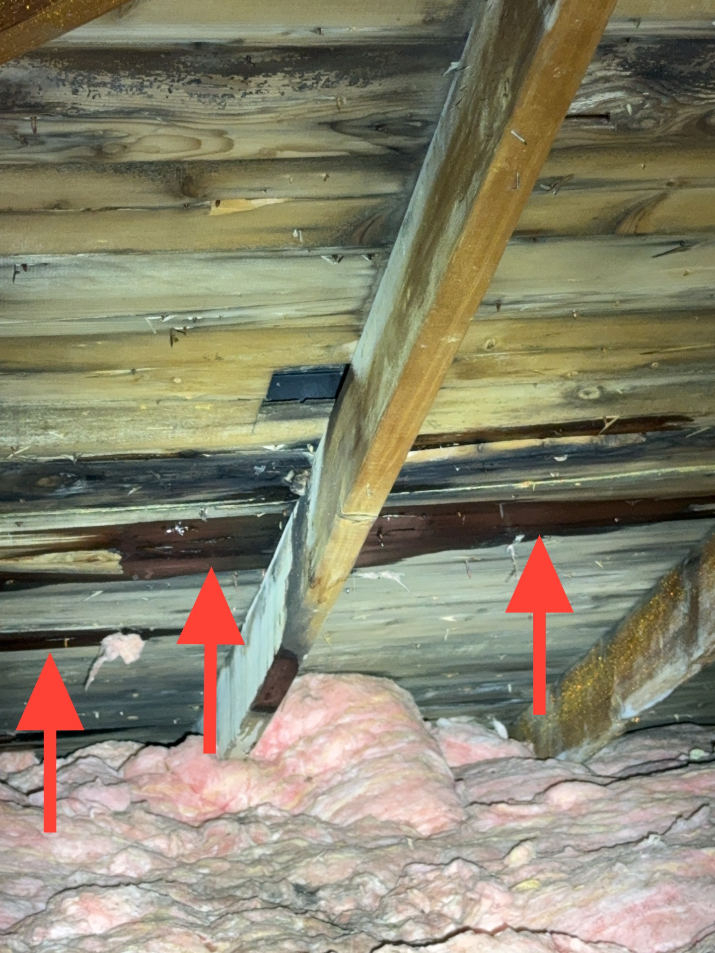 On the North roof plane, several areas of roof decking showed evidence consistent with active or prior leakage. The roof covering consists of two layers of shingles, which can complicate localized repairs and limit the ability to properly address flashing and underlayment conditions. In some cases, a full re-roof may be necessary to correct concealed flashing issues, evaluate the condition of the roof decking, and implement ventilation improvements.