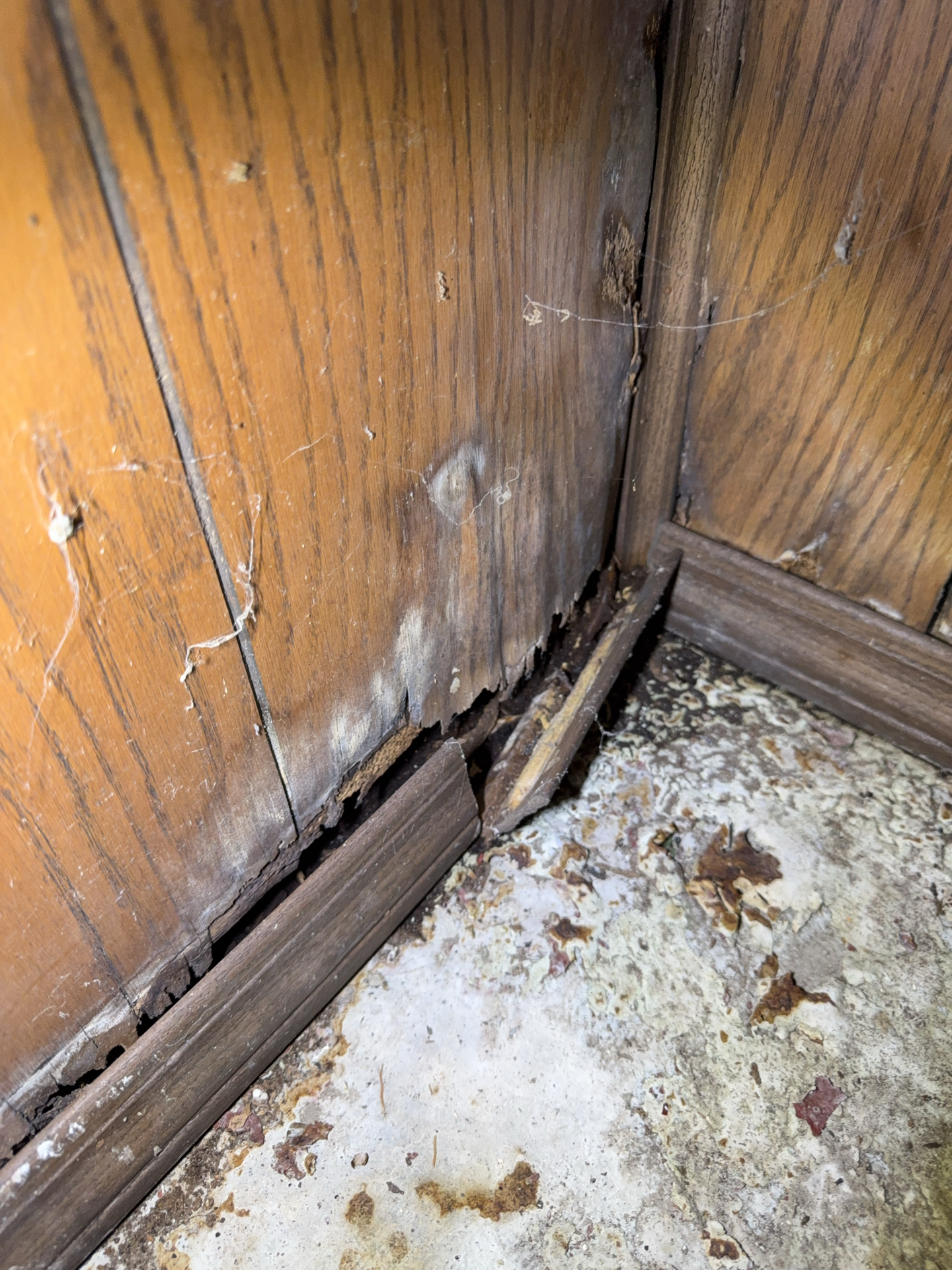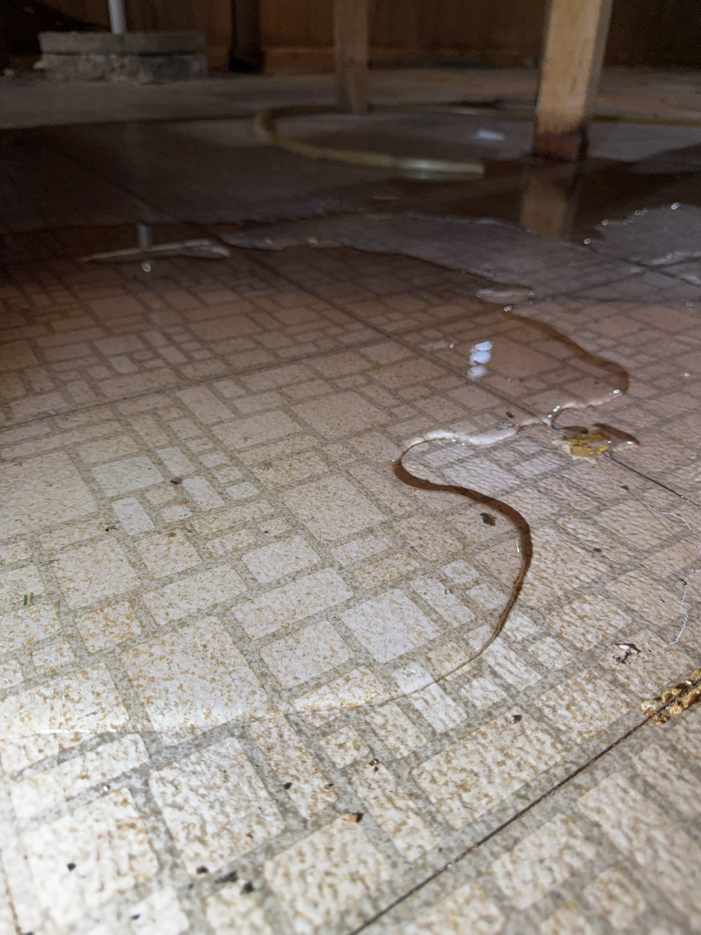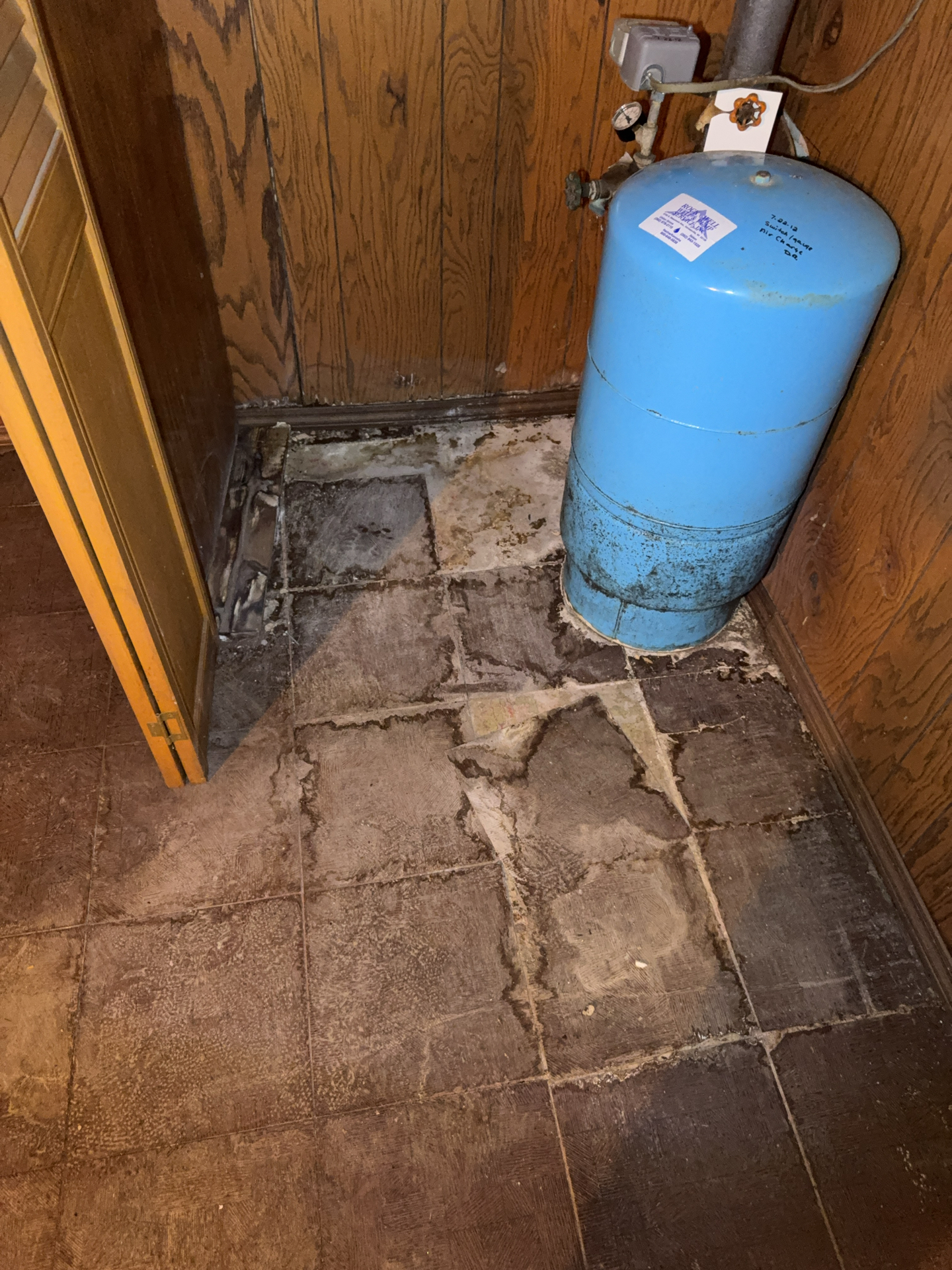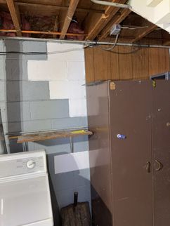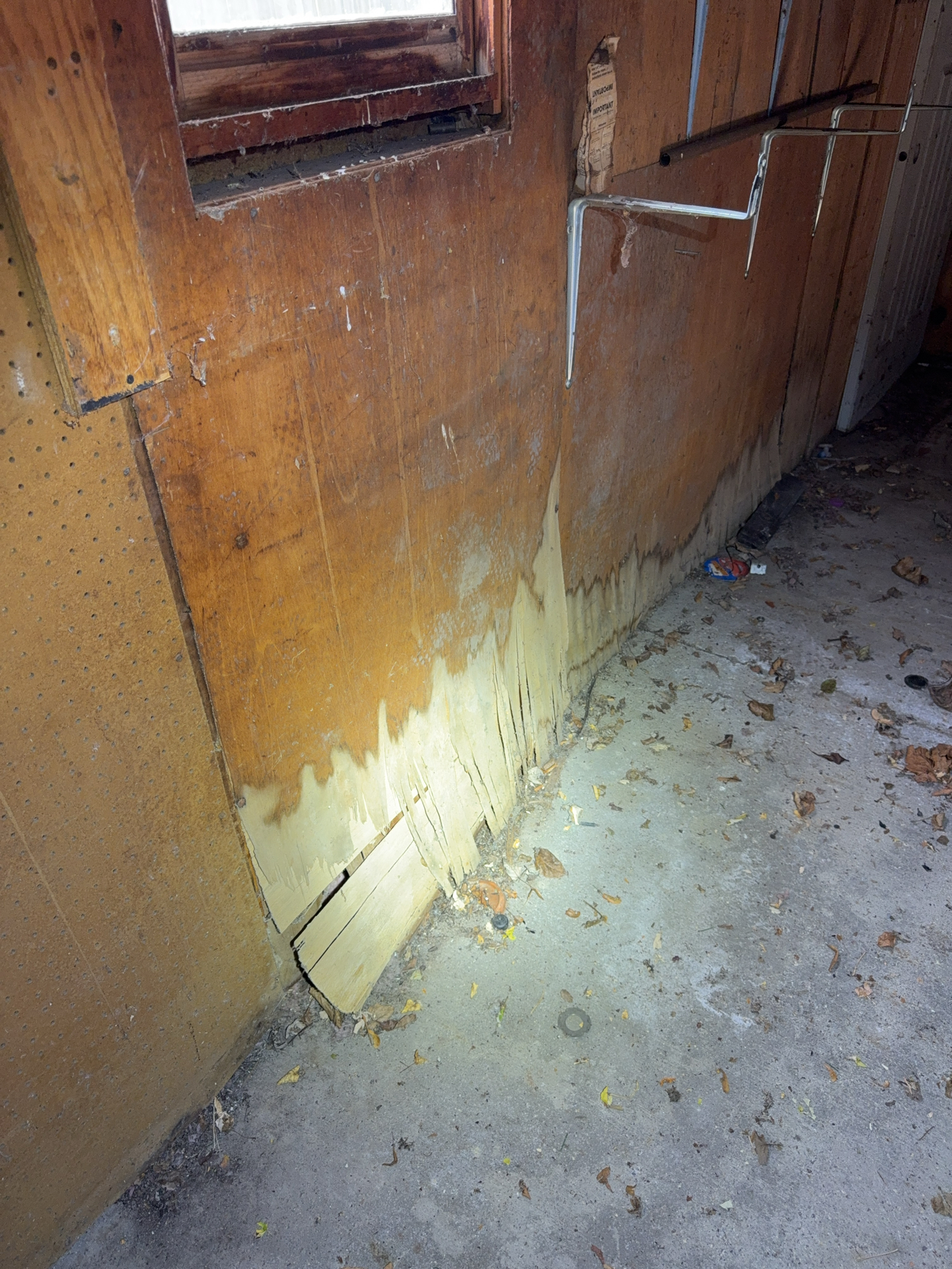 Water entry pipe to home from well enters South foundation wall. When viewed through wall paneling penetration, an active leak was observed within the wall cavity, recommend a qualified plumber repair as needed. Significant water damage was observed at base of this wood paneling wall.