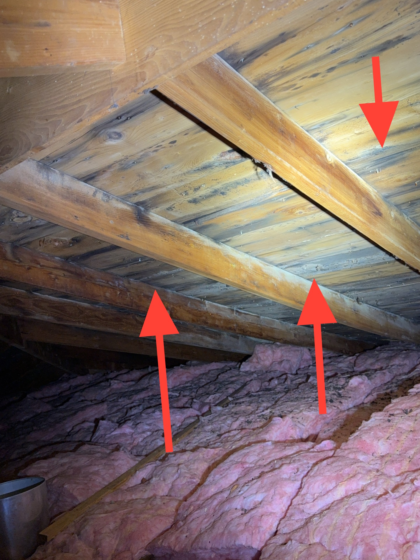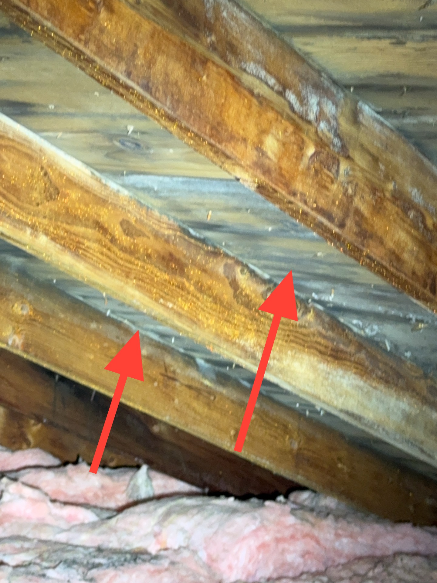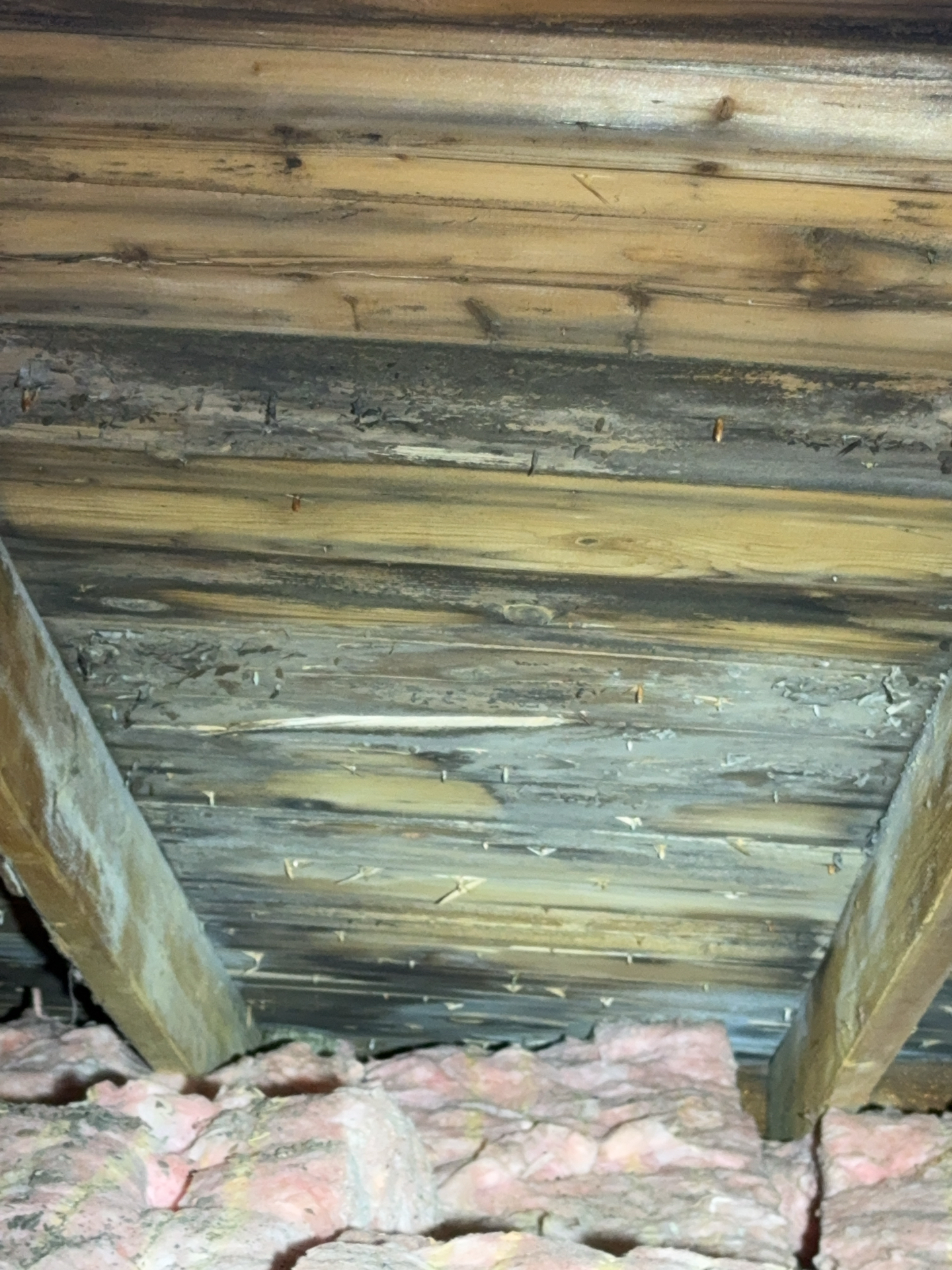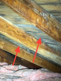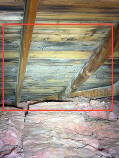 Mold-like growth was observed on multiple areas of the roof decking. This condition is commonly associated with Improperly vented bathroom exhaust fan, inadequate attic ventilation and/or insufficient insulation depth, which can contribute to elevated moisture levels.