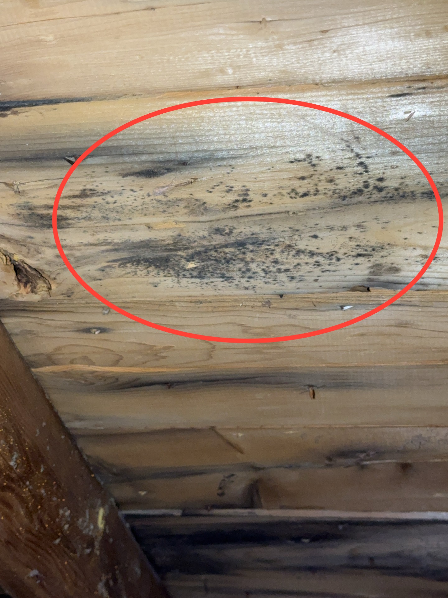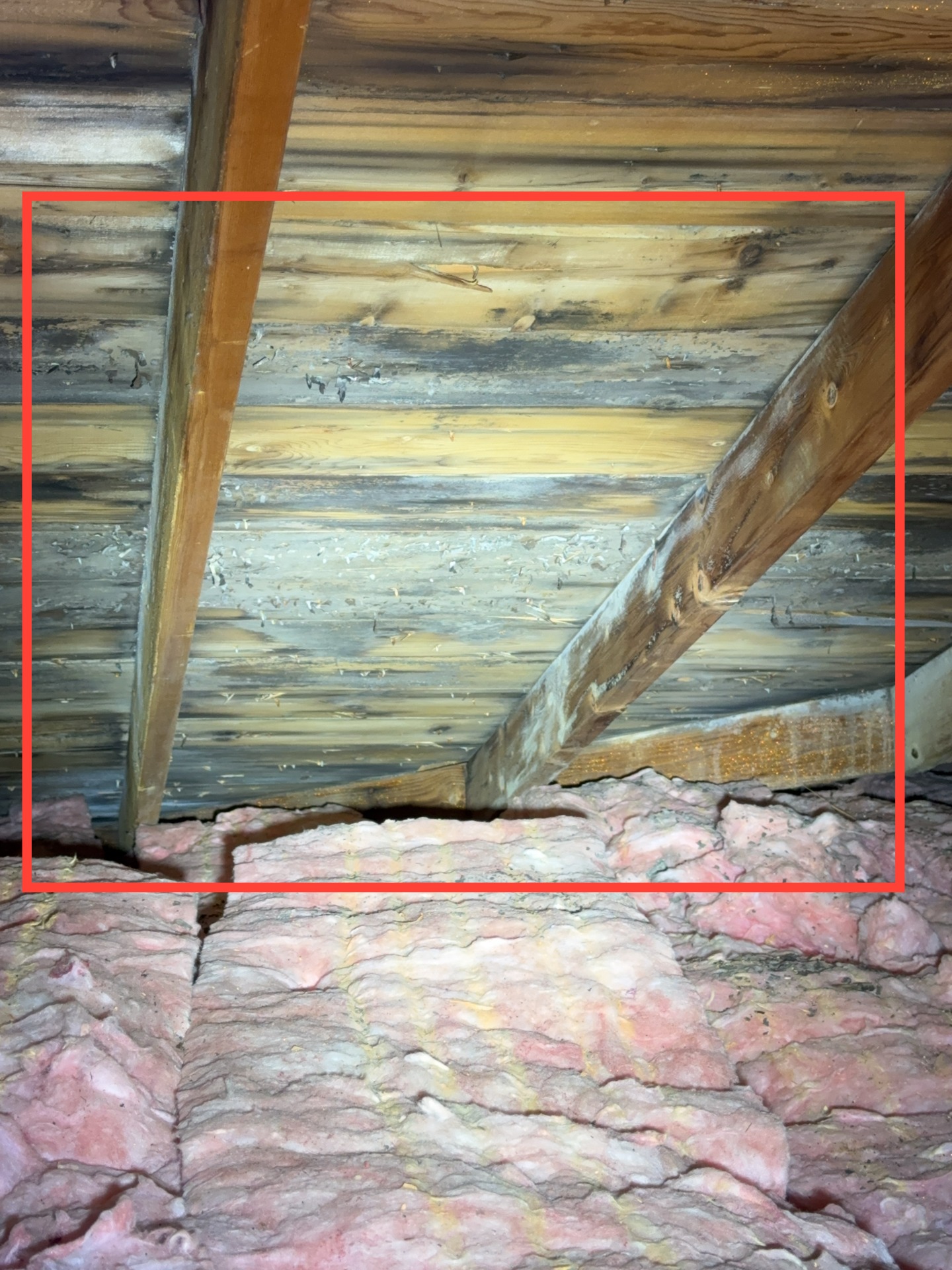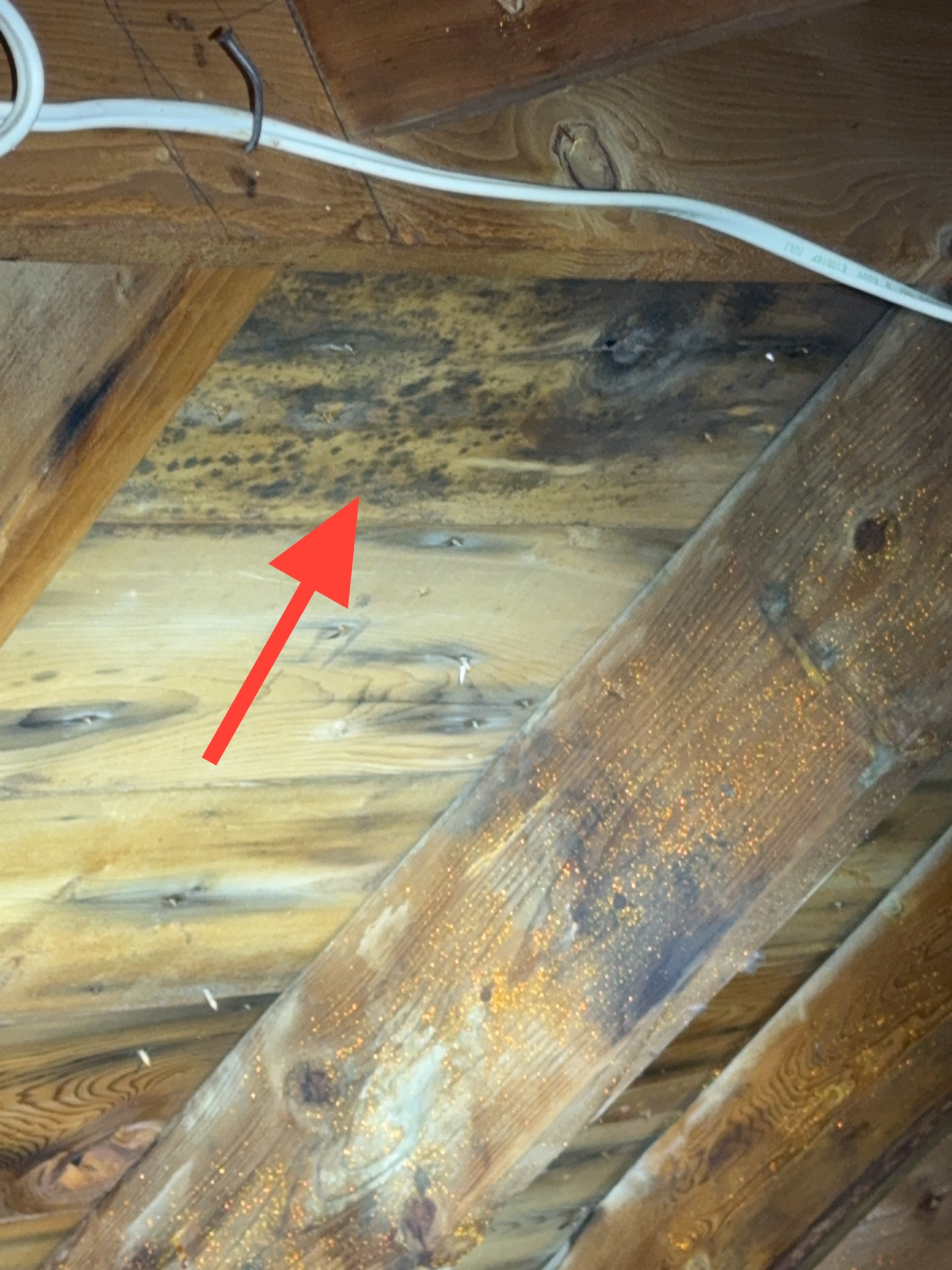 Mold-like growth was observed on multiple areas of the roof decking. This condition is commonly associated with Improperly vented bathroom exhaust fan, inadequate attic ventilation and/or insufficient insulation depth, which can contribute to elevated moisture levels.