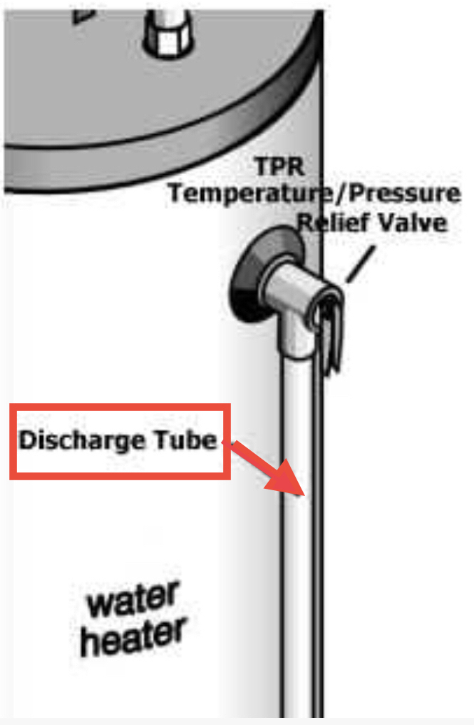 The discharge tube for the water heater temperature and pressure relief valve (TPRV) was missing and requires correction to reduce the risk of scalding. If the TPRV were to discharge, hot water and steam could be released, creating a significant safety hazard. A proper discharge pipe should be installed and terminate within approximately 6 inches of the floor to safely direct water and steam away from occupants. It is recommended that a qualified plumber or contractor install the appropriate discharge piping in accordance with current safety standards at water heater replacement.