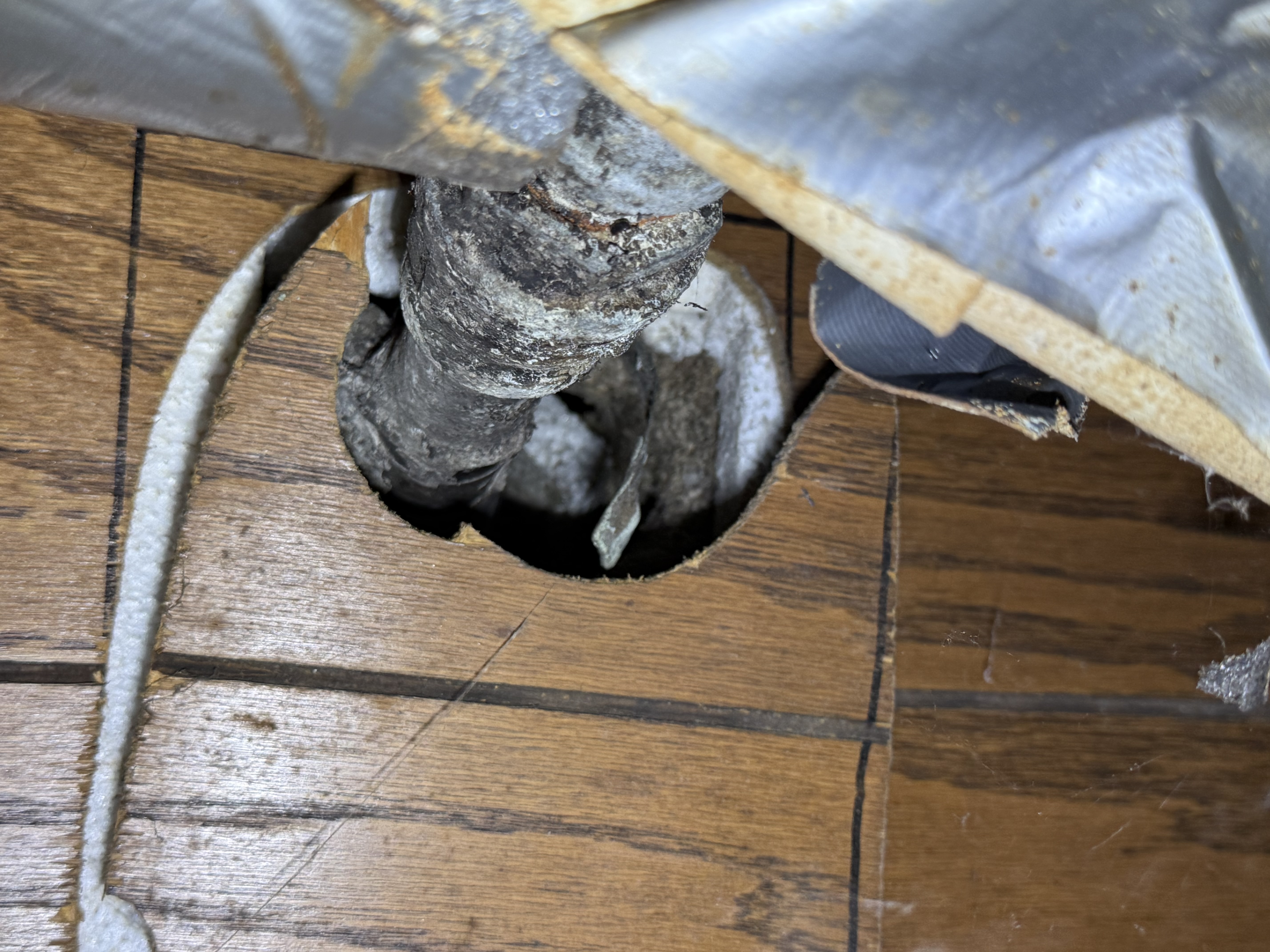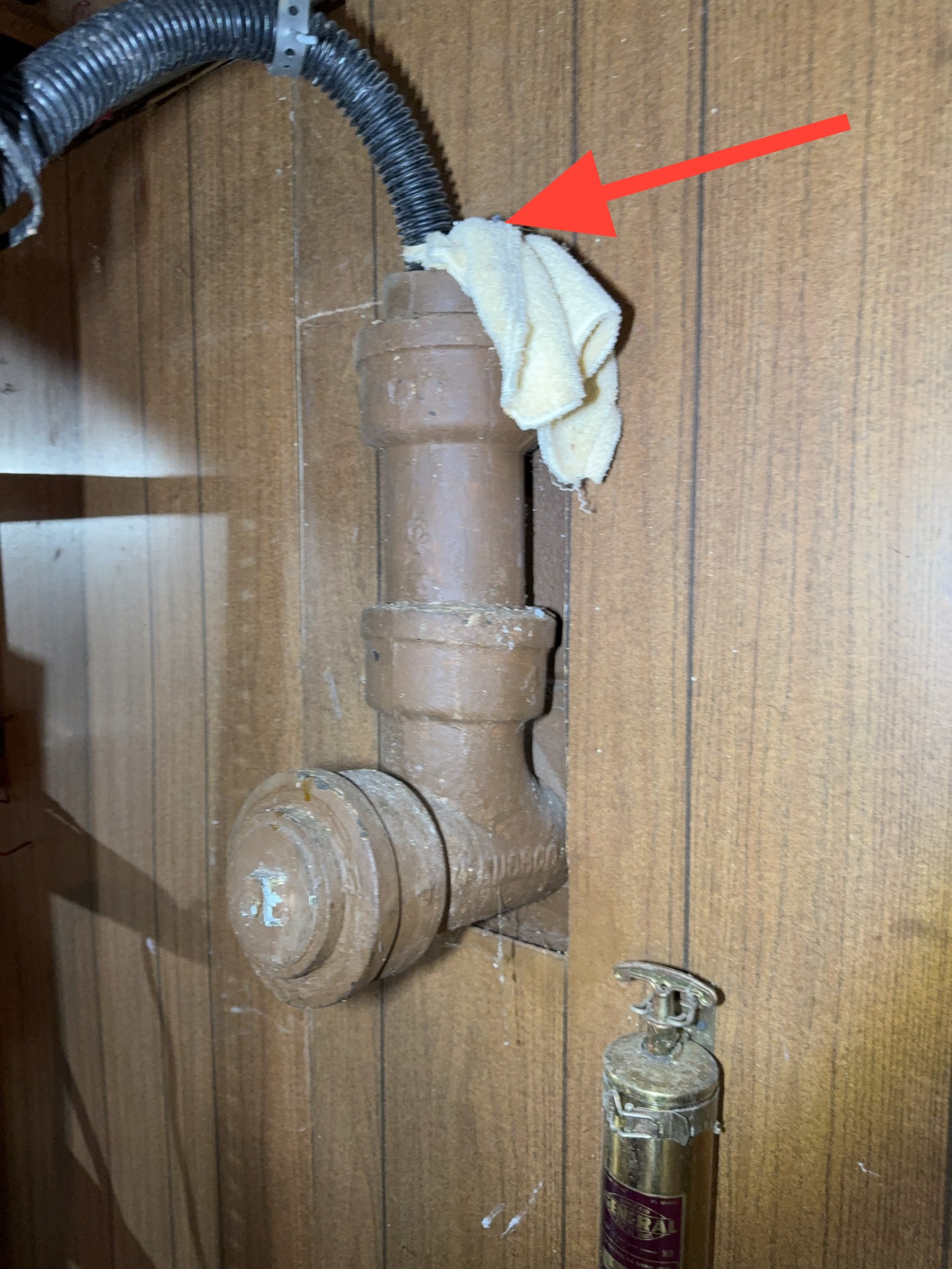 A towel was present at the pipe entry point, which may indicate an attempt to limit air or odor movement. No visible trap or venting arrangement was observed at this location.