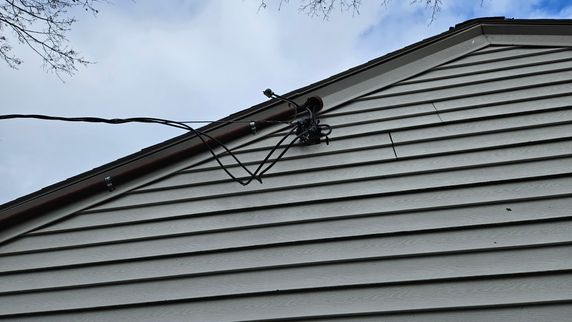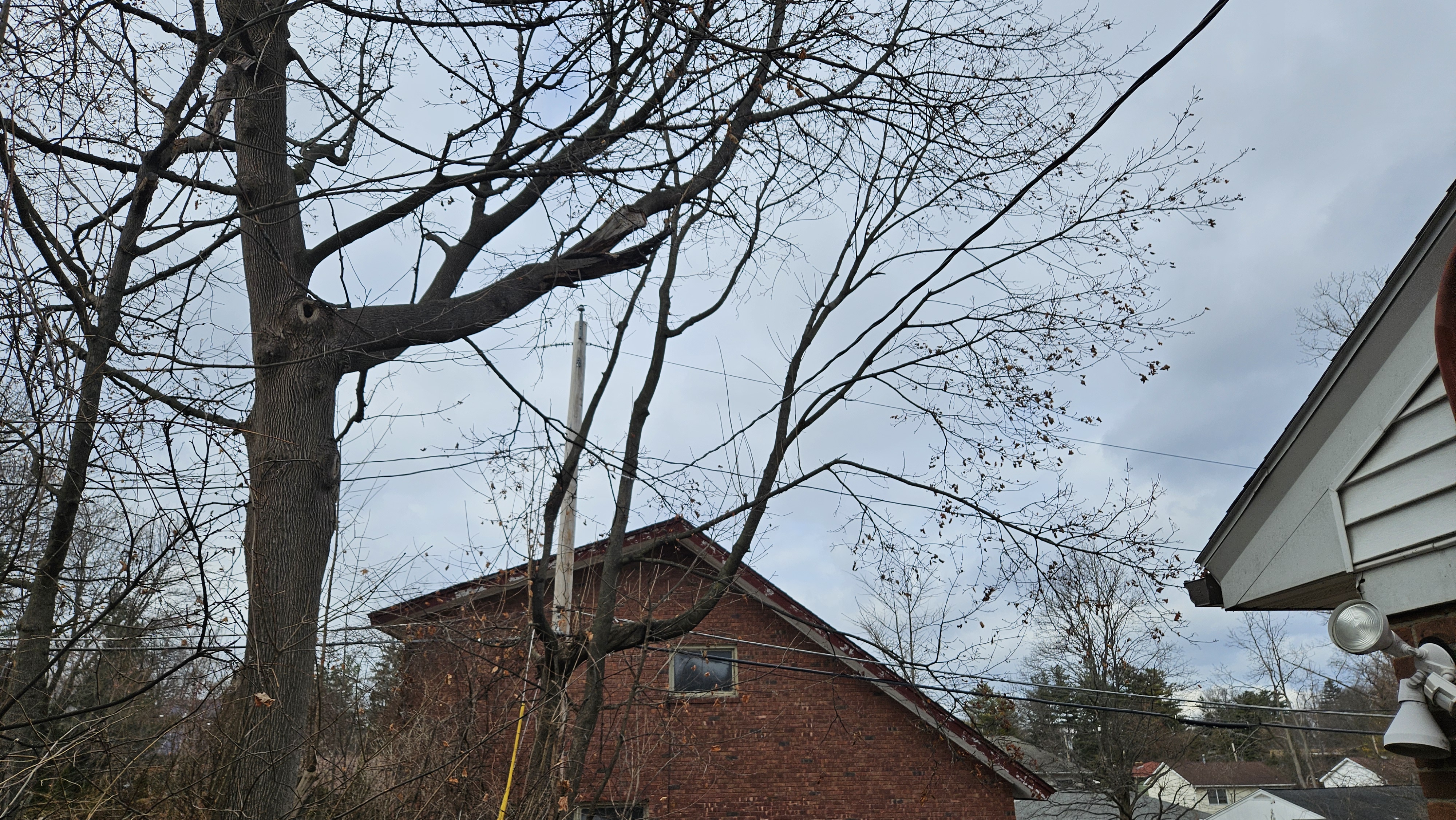 Service wires from pole are threatened by tree overhang and should have Electric Company inspect and provide remedy.