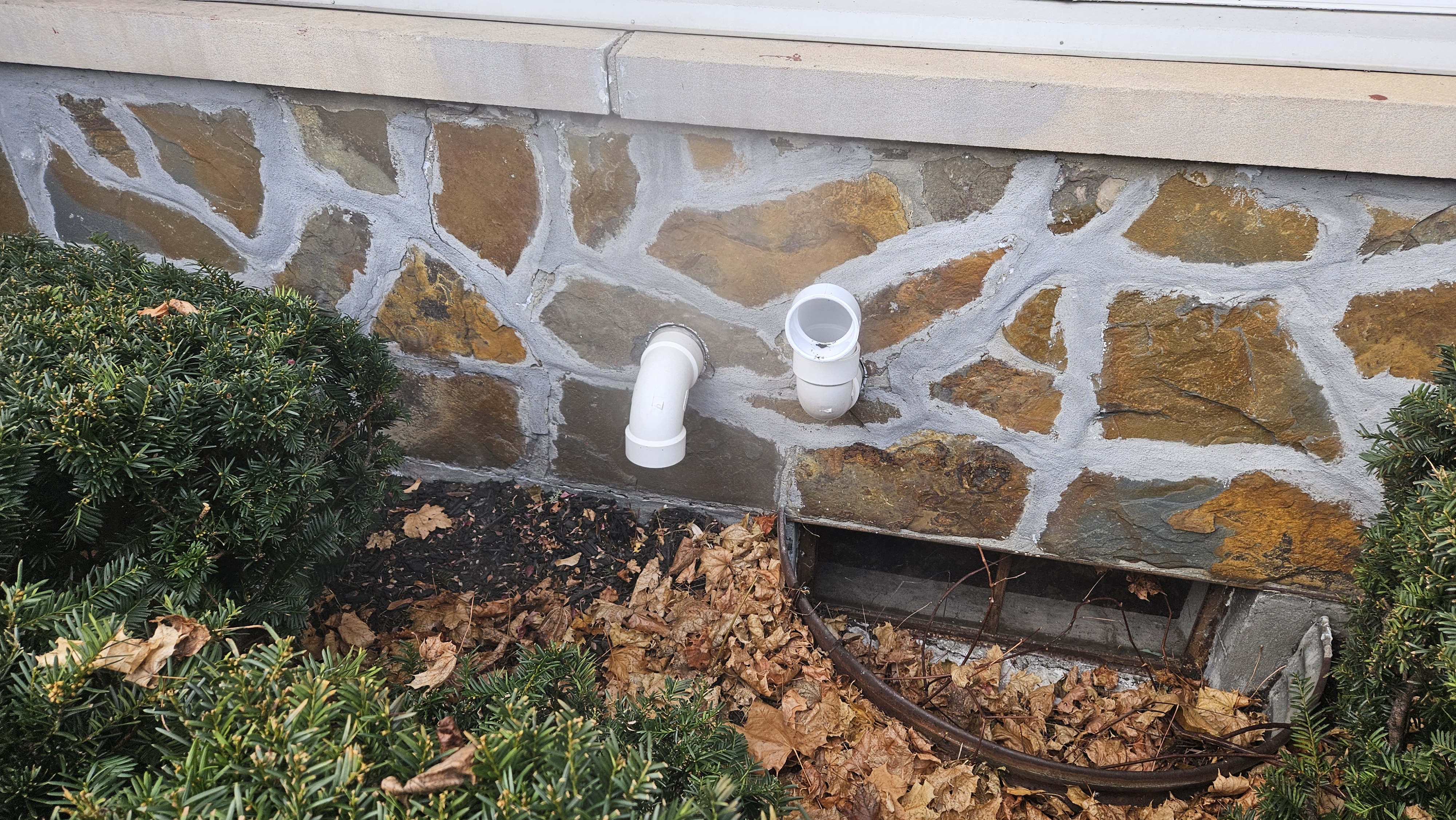 High efficiency vent pipe is too low to grade. This could become blocked by snow or ice buildup and cause a back-draft of carbon monoxide into dwelling. Recommend a qualified contractor repair as necessary.