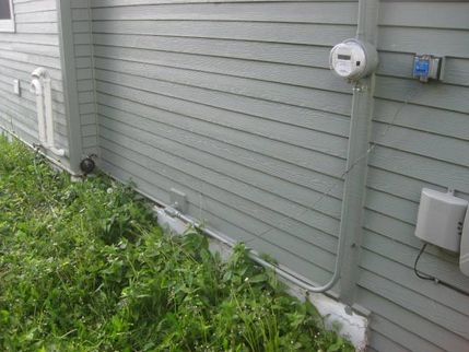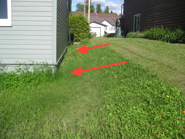 The grade of the yard slopes toward the building. In order to control surface water drainage, building practices recommend a minimum slope of one quarter-inch / foot away from the building . Negative grading, as this current condition is called, can lead to water leakage into the basement and structural problems with the foundation.