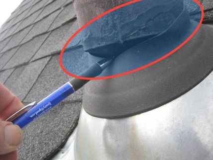 DAMAGED SEWER VENT BOOT The plumbing boot was damaged and is subject to leakage. Water stains were observed on the 2nd floor that appear to be associated with this condition. Contact a licensed building contractor for repair. One option is to replace the entire boot. Another is to utilize a repair boot that slips over the existing plumbing boot.