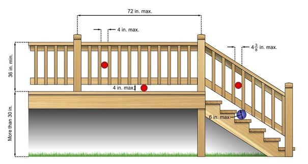 MISSING GUARDRAIL A guardrail is needed for all decks more than 30-inches above the ground. The railing should be at least 36-inches tall with vertical openings no larger than 4-inches. No guardrail has been installed here and one is required where the deck is more than 30-inches above the ground.