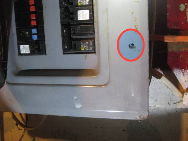 The main panel is missing a screw to secure the dead front cover. Install missing screw as needed for improved safety. Note that screws with sharp ends are a safety hazard and not allowed. Proper, blunt end screws are available at local hardware suppliers.