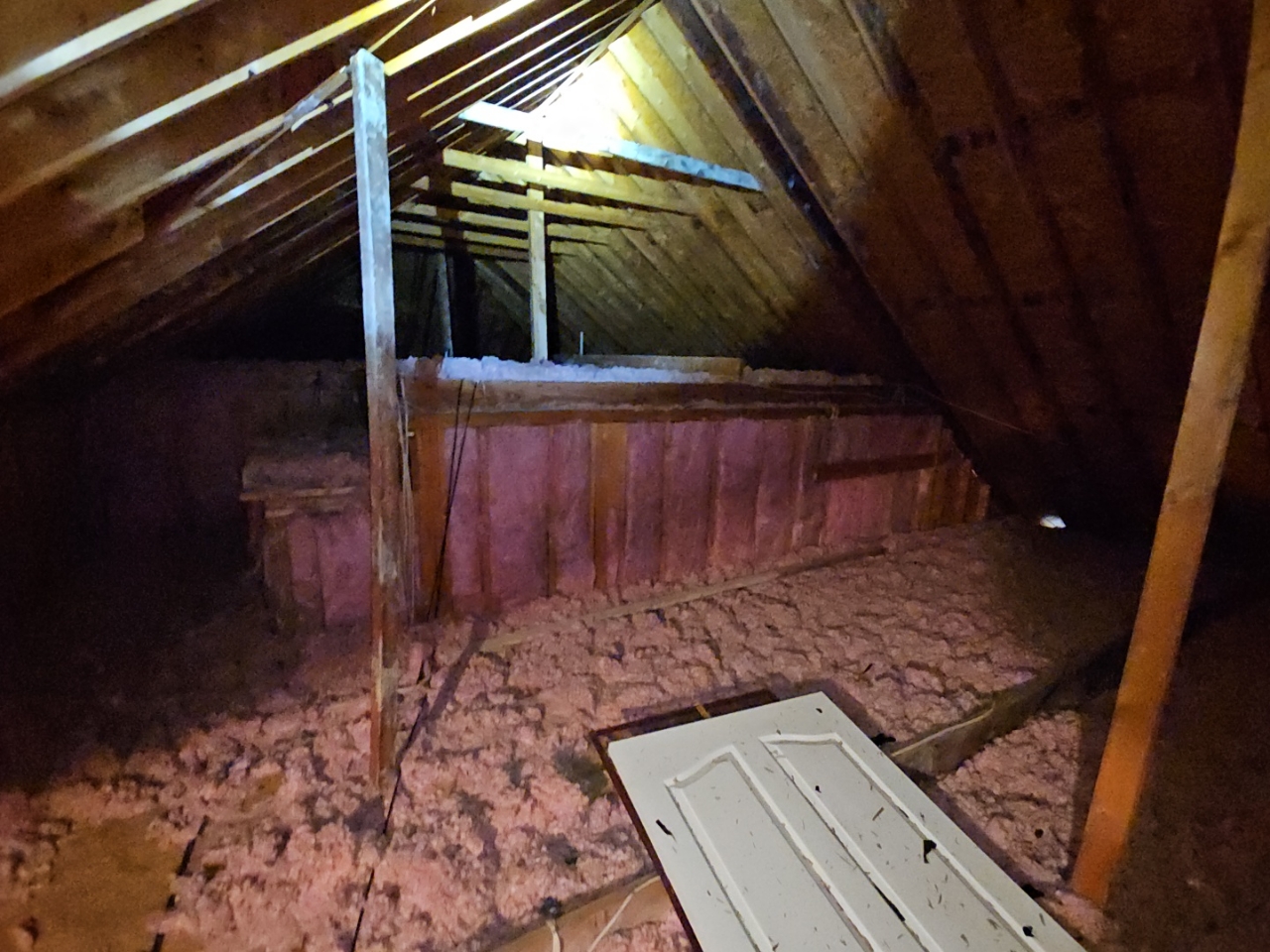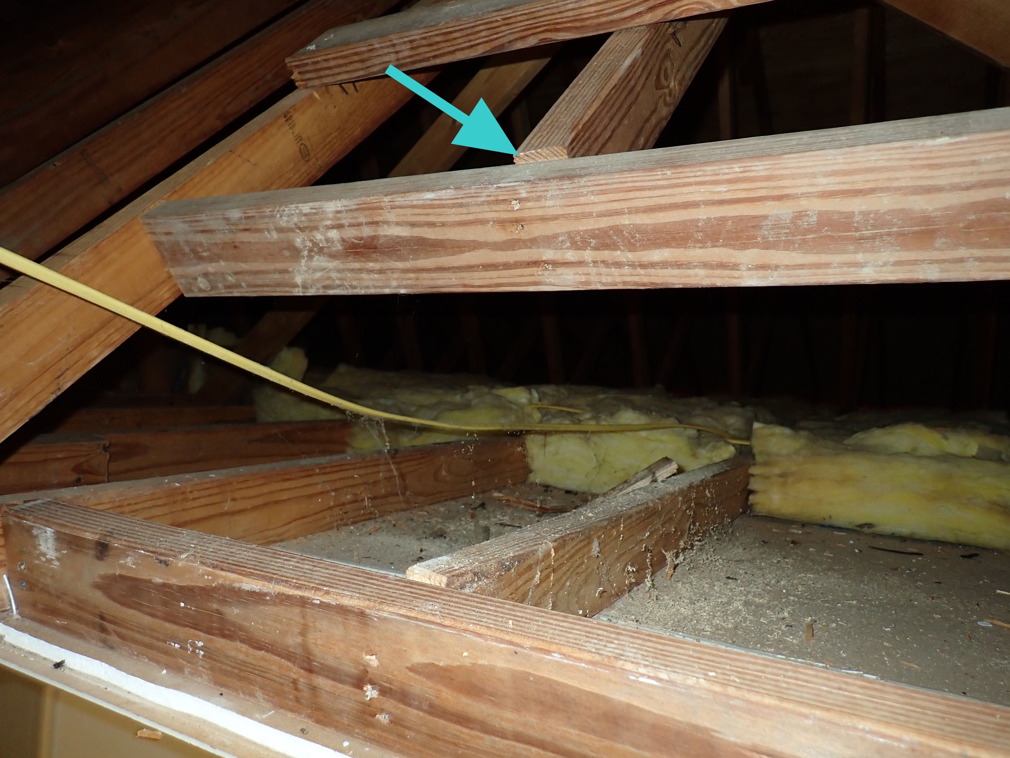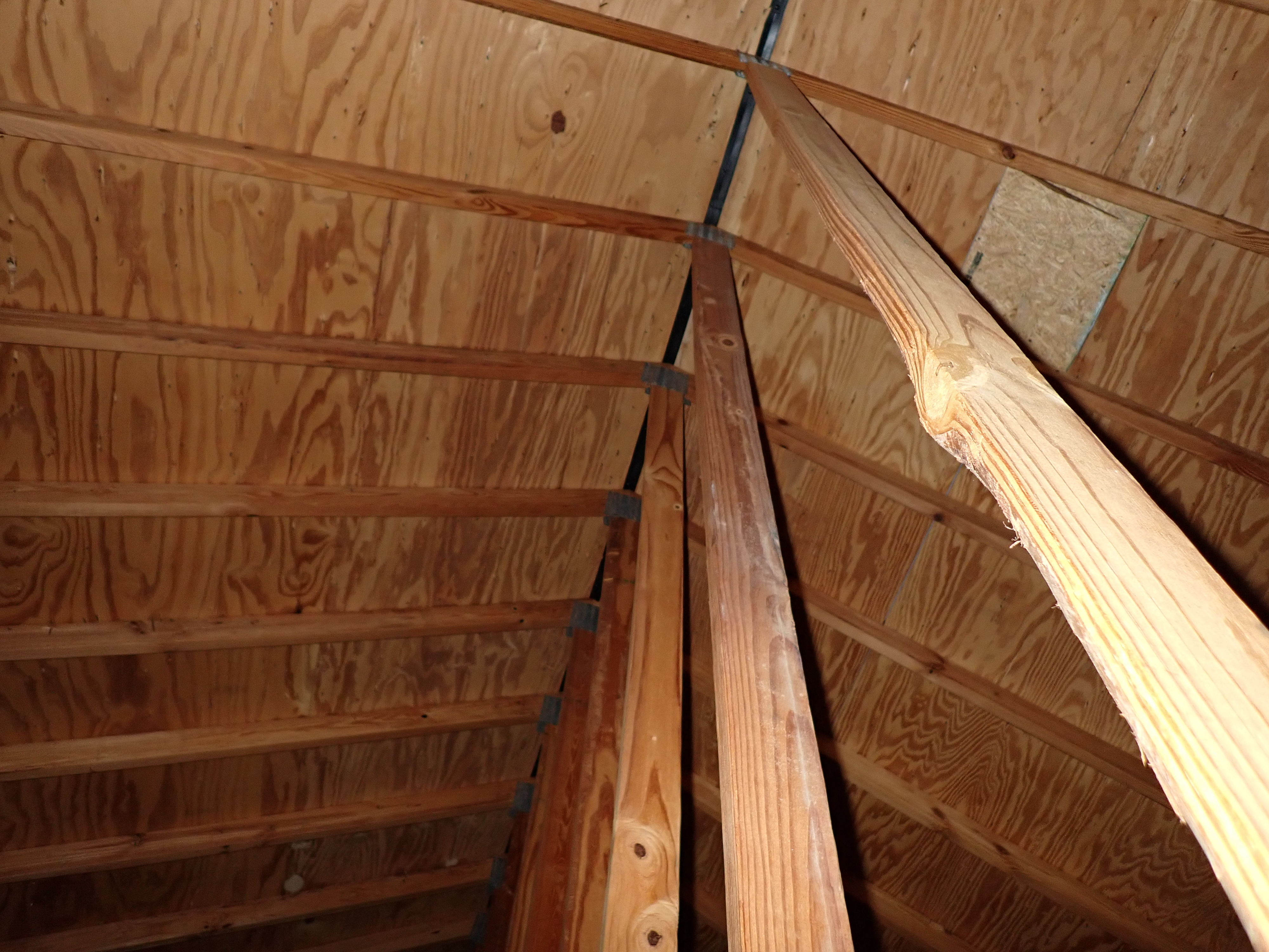 Pull down attic ladder stairway appeared damaged. Do not climb attic ladder stairway when it is damaged. It may collapse unexpectedly. For safety, properly replace or remove damaged pull down attic ladder stairway, including the box frame.