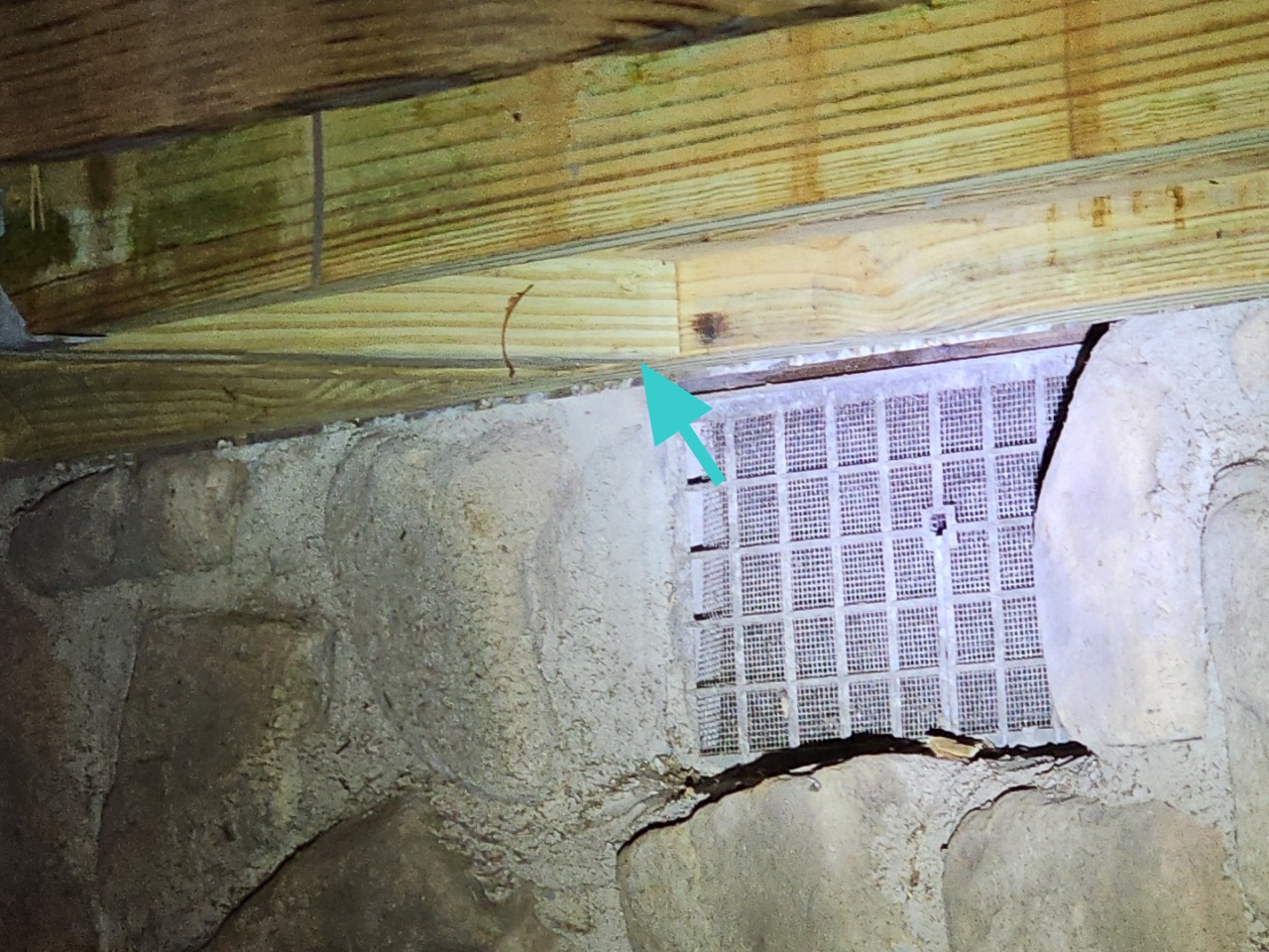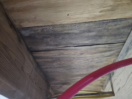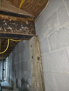 - Dry moisture stains observed at floor framing visible at basement front. Previous repairs observed. Both areas shown in photos were sampled for mold determination.