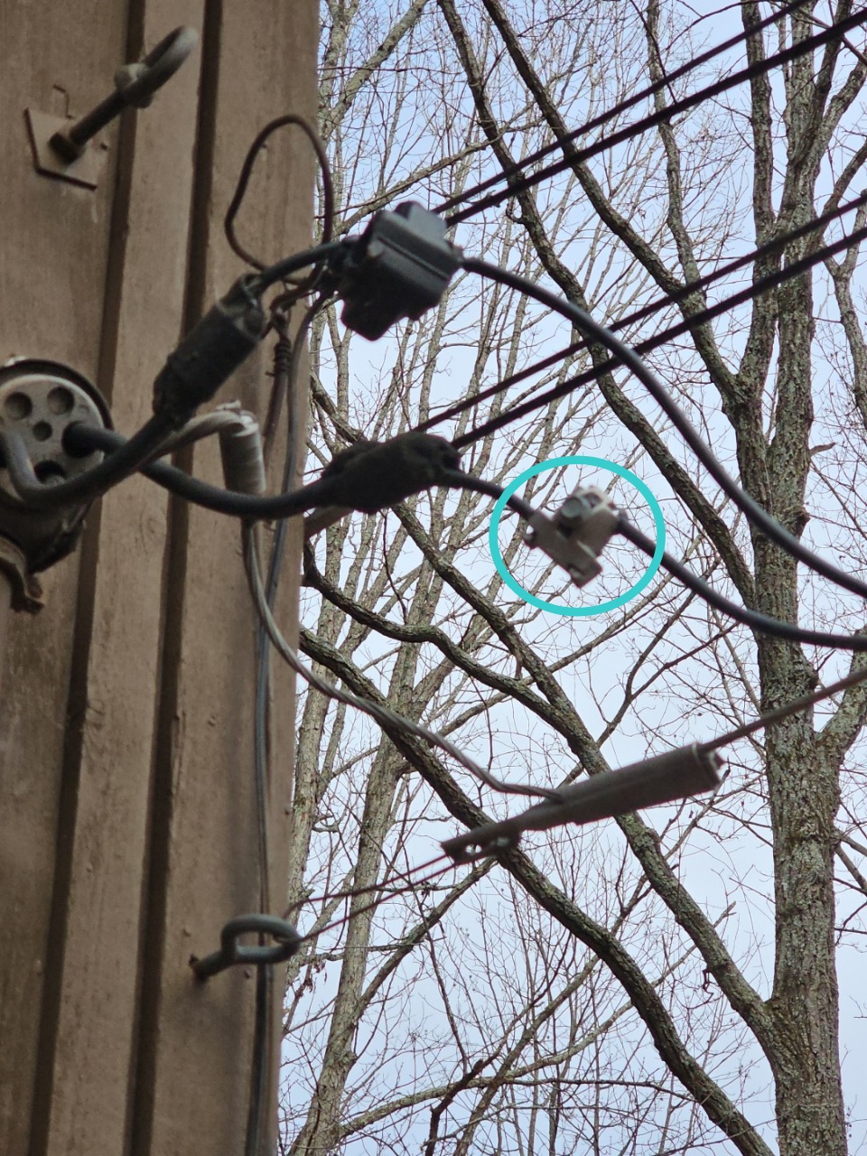 The electrical utility-owned splice for the overhead electrical service near the building was exposed to one or more ungrounded conductors.