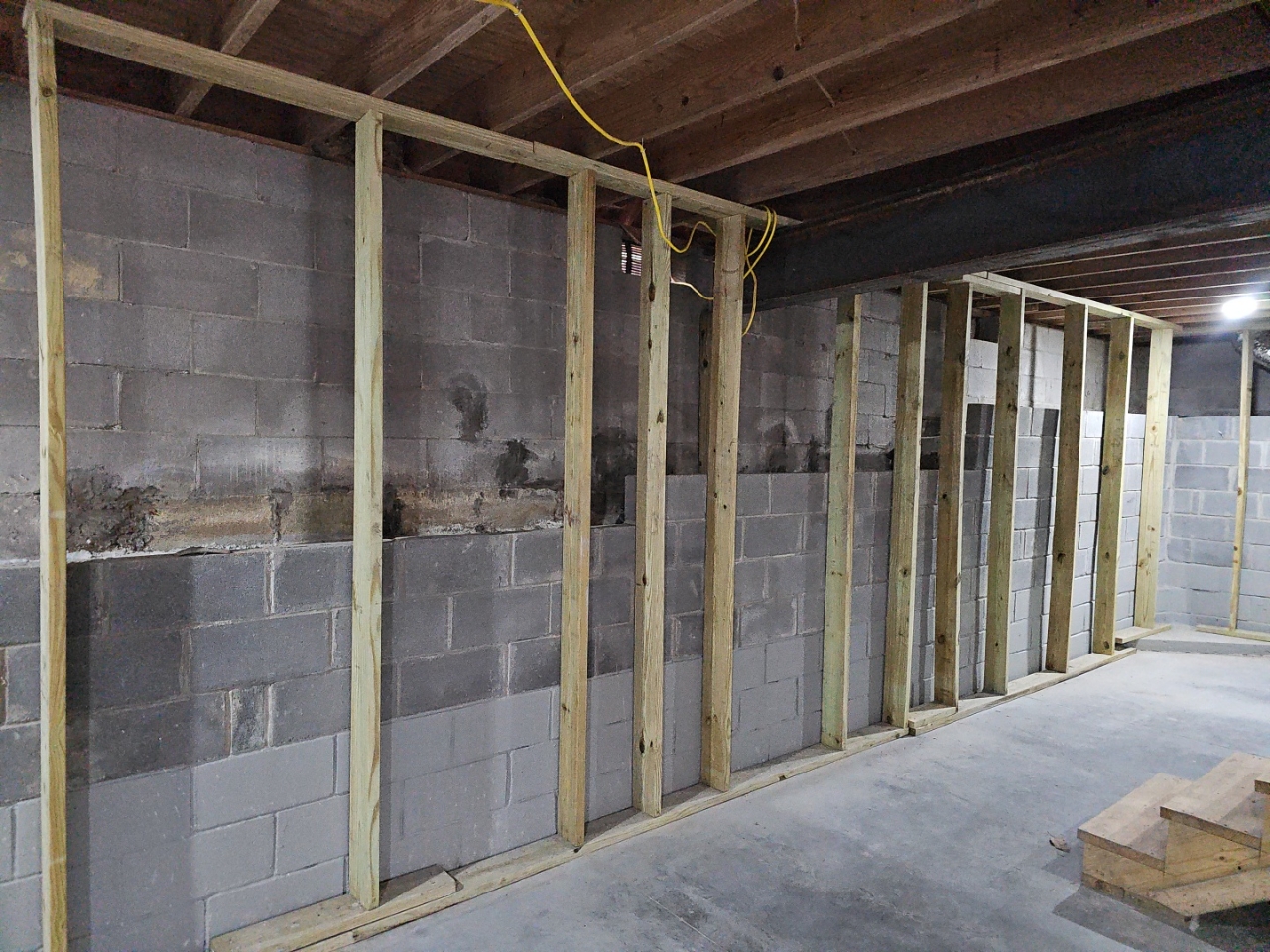 Basement: Practical Steps Basement Moisture, Dehumidifier Present, Interior Damp Proofing Observed, Moisture Stains Observed Dry