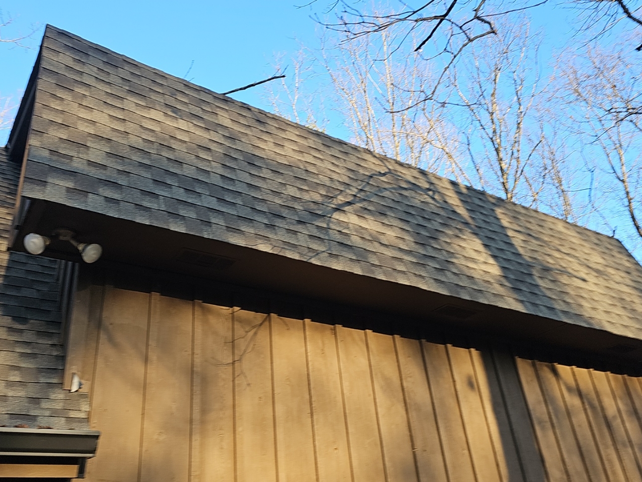 Overhanging tree branches appeared too close above roofing. Air circulation and sunlight help prevent deterioration of roof components. Branches should be properly trimmed back to alleviate this condition.
