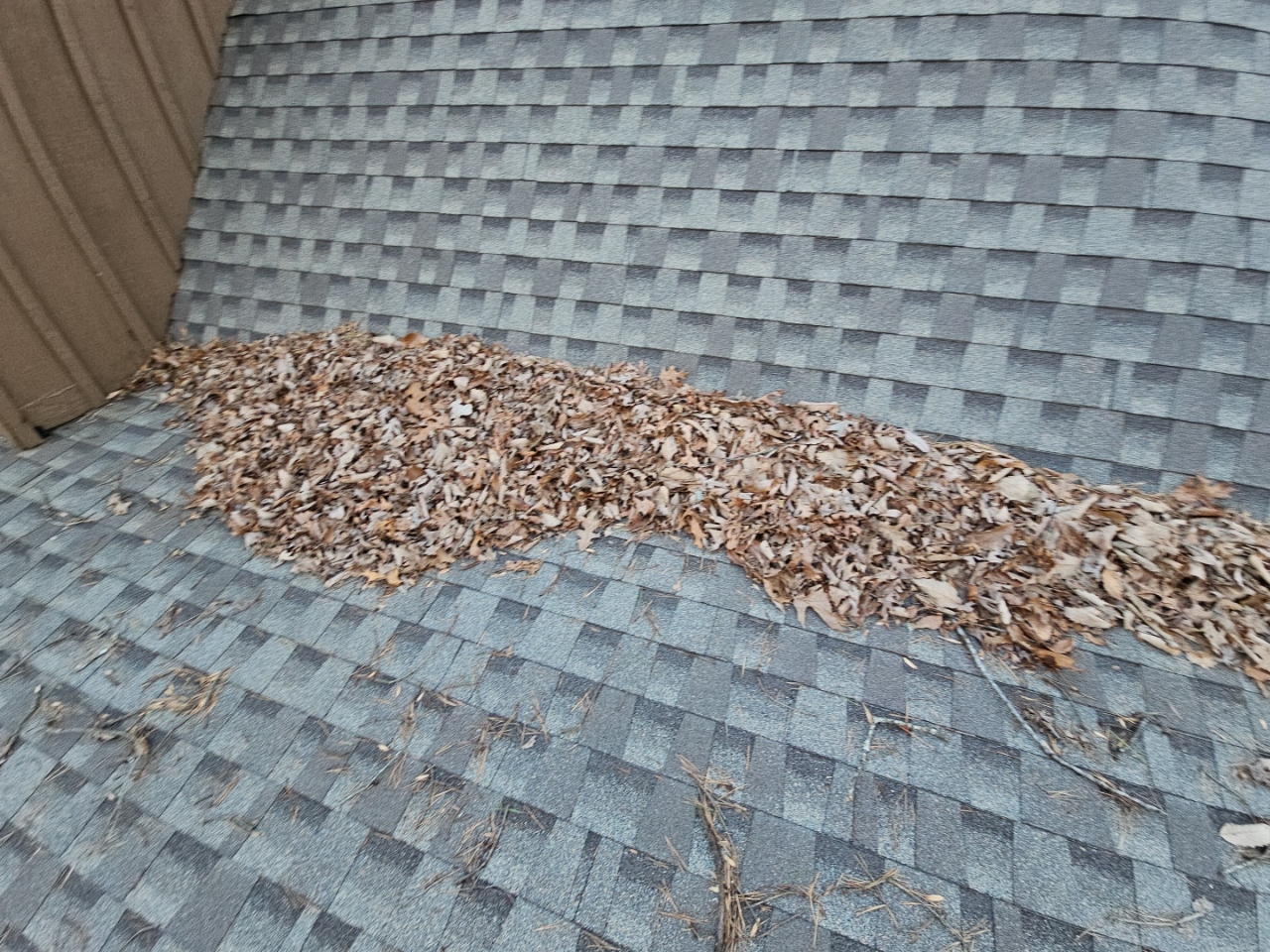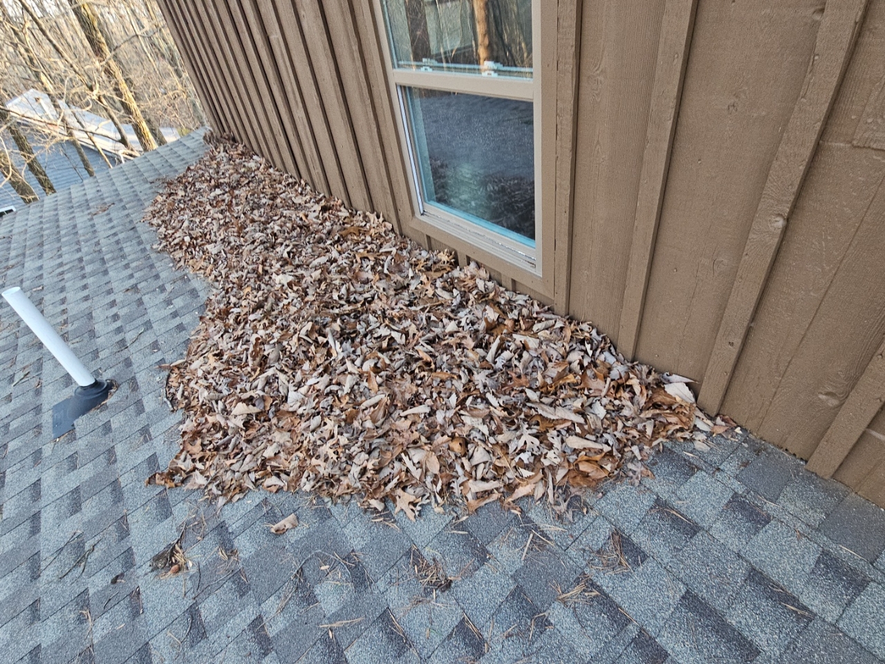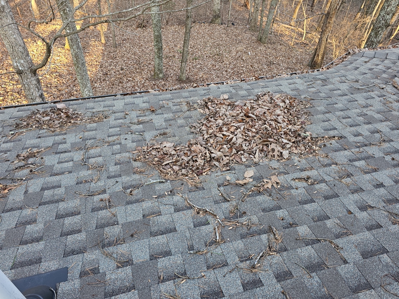 - Vegetation debris on roof covering concealed view of areas.