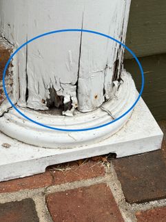 There is damaged wood on the porch columns, recommend a qualified contractor evaluate and repair/replace any damaged wood/columns.