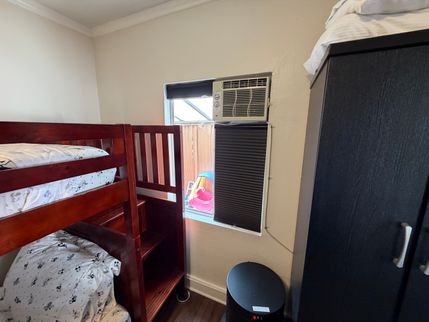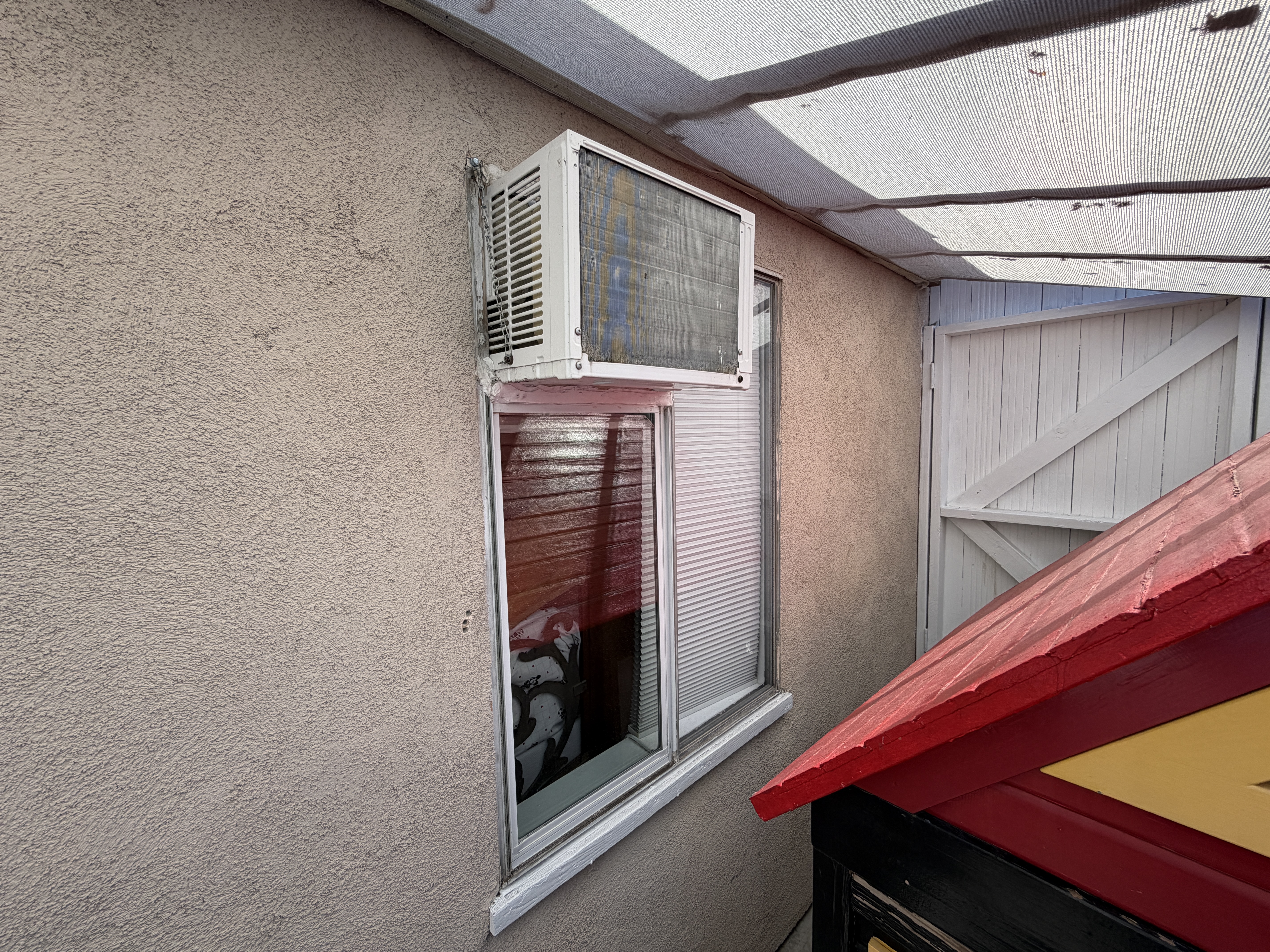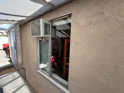 The only bedroom window also has a permanently installed air conditioner in the frame. Replacement of the window is required. The window opening appears to be 3 x 4 feet, which would suffice if a casement window were installed.