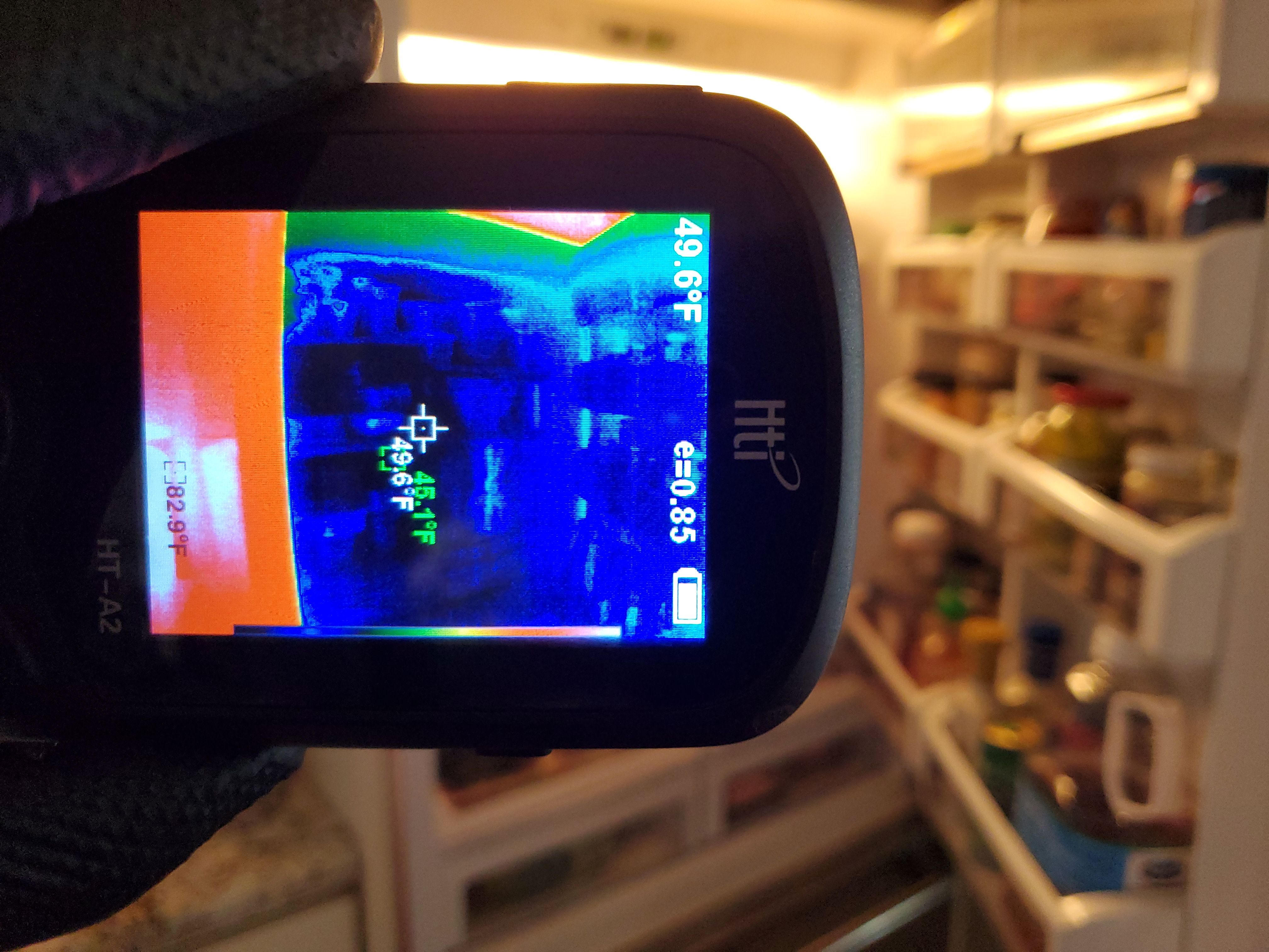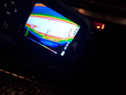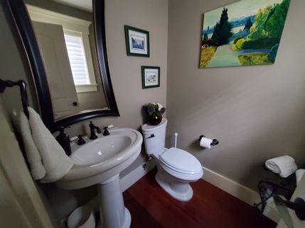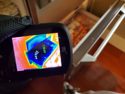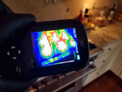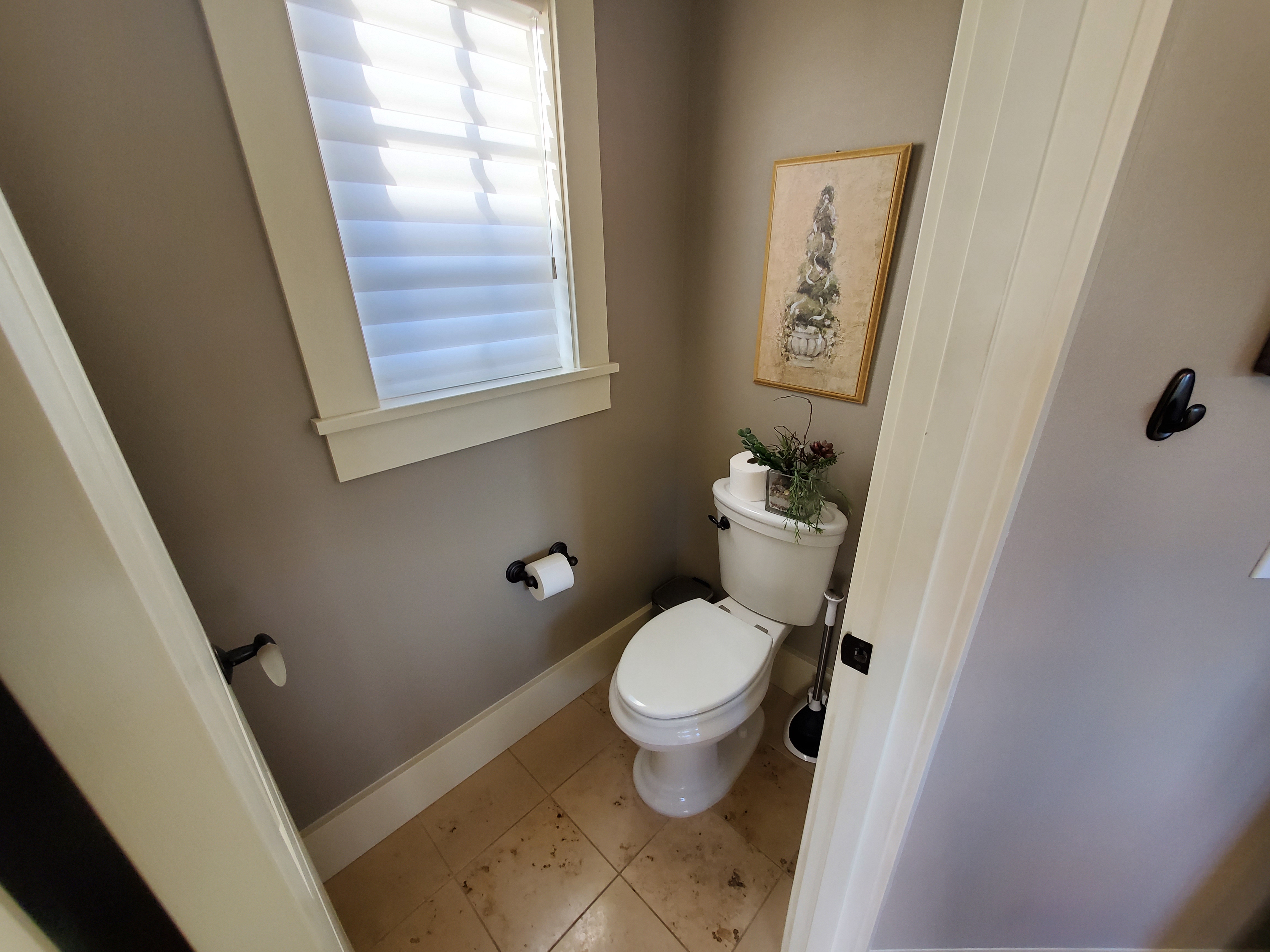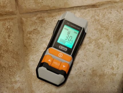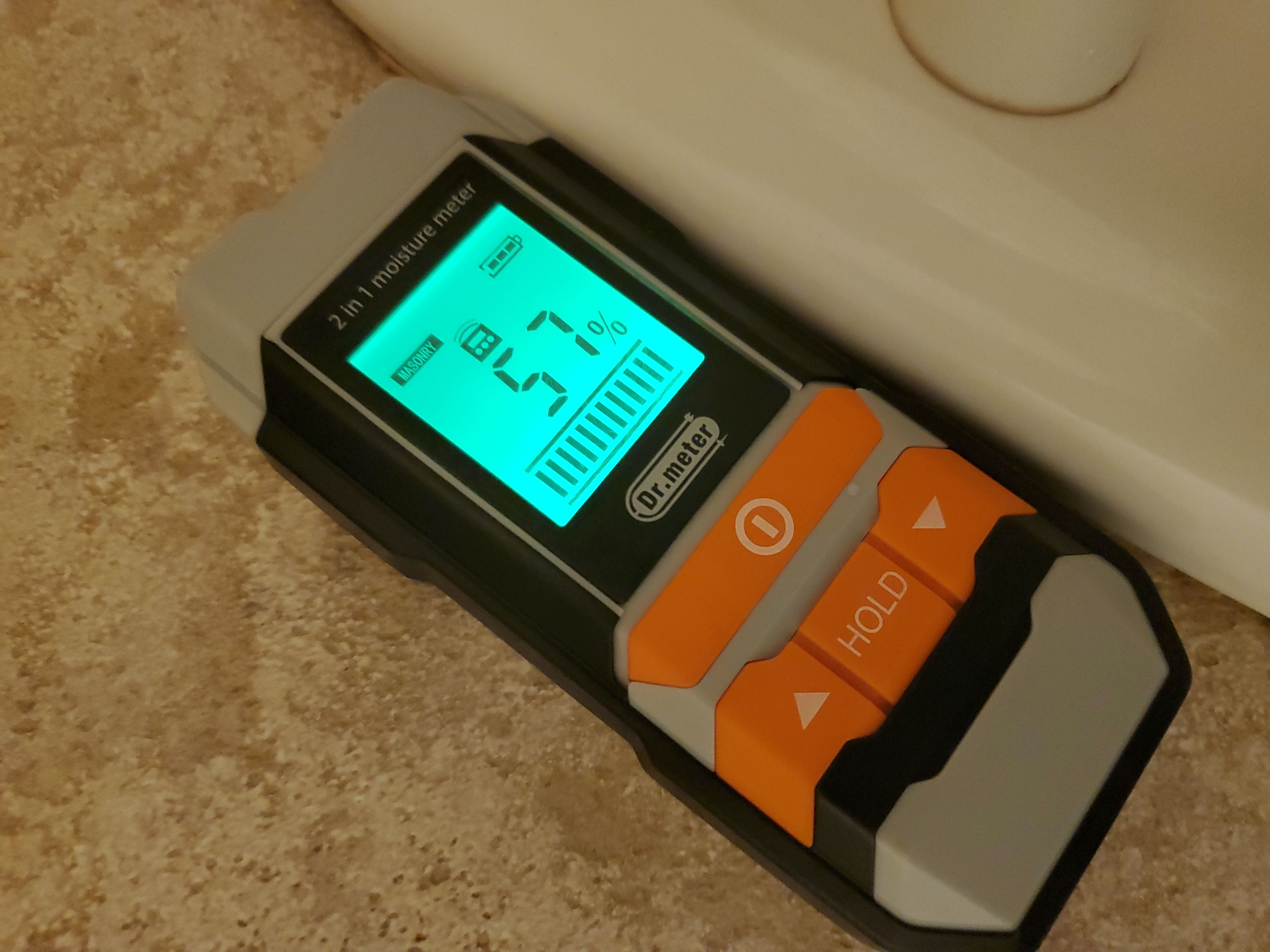 A suspected leak was detected at the toilet drain in the Second Level Hall Bathroom. Moisture meter readings showed high moisture content next to the toilet drain. This most commonly means the wax ring seal, used to create a seal between the toilet and drain pipe, has failed. Photos of moisture meter readings are included in the report. The first photo is of a moisture meter on the floor in a known dry spot, and is used as a control/baseline measurement. The second photo is in the area with the suspected leak; the increased moisture levels suggested an active leak. Recommend repair by a qualified contractor.