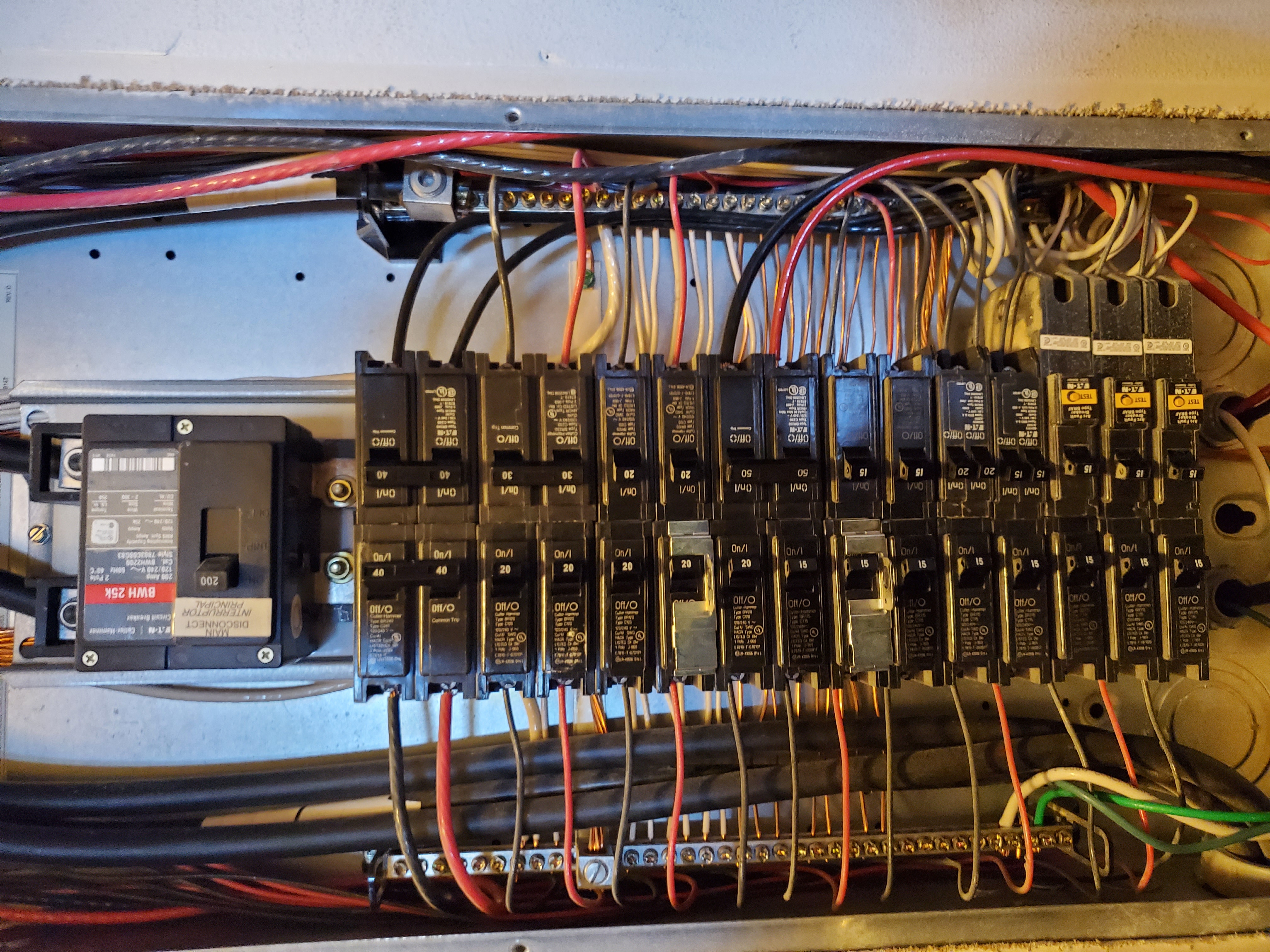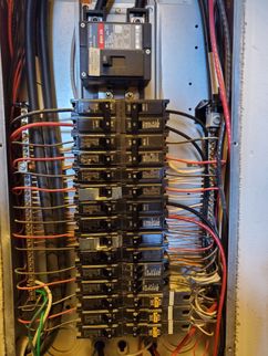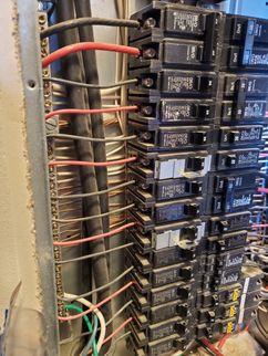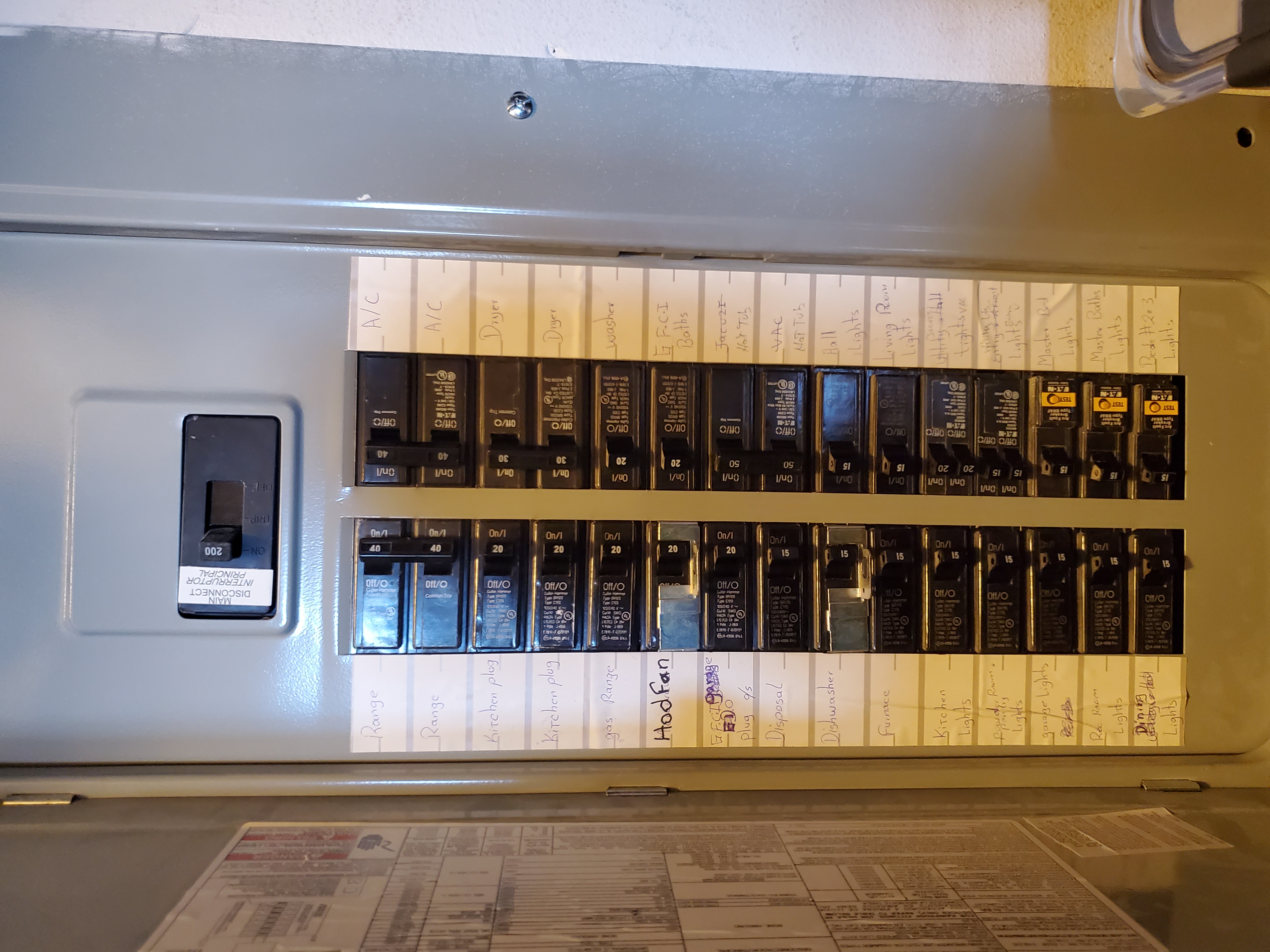 This section is about the electric system in the house. It includes the amperage rating of the service, the location of the main disconnect, the location of any sub panel(s), the presence of solid conductor aluminum branch circuit wiring, and wiring methods. Inspectors are required to inspect the visible portions of the service drop from the utility to the house, the service entrance conductors, cables and raceways, the service equipment and main disconnects, the service grounding, the interior components of the service panels and sub panels, the conductors, the over-current protection devices (fuses or breakers), ground fault circuit interrupters, and a representative number of installed lighting fixtures, switches, and receptacles.
