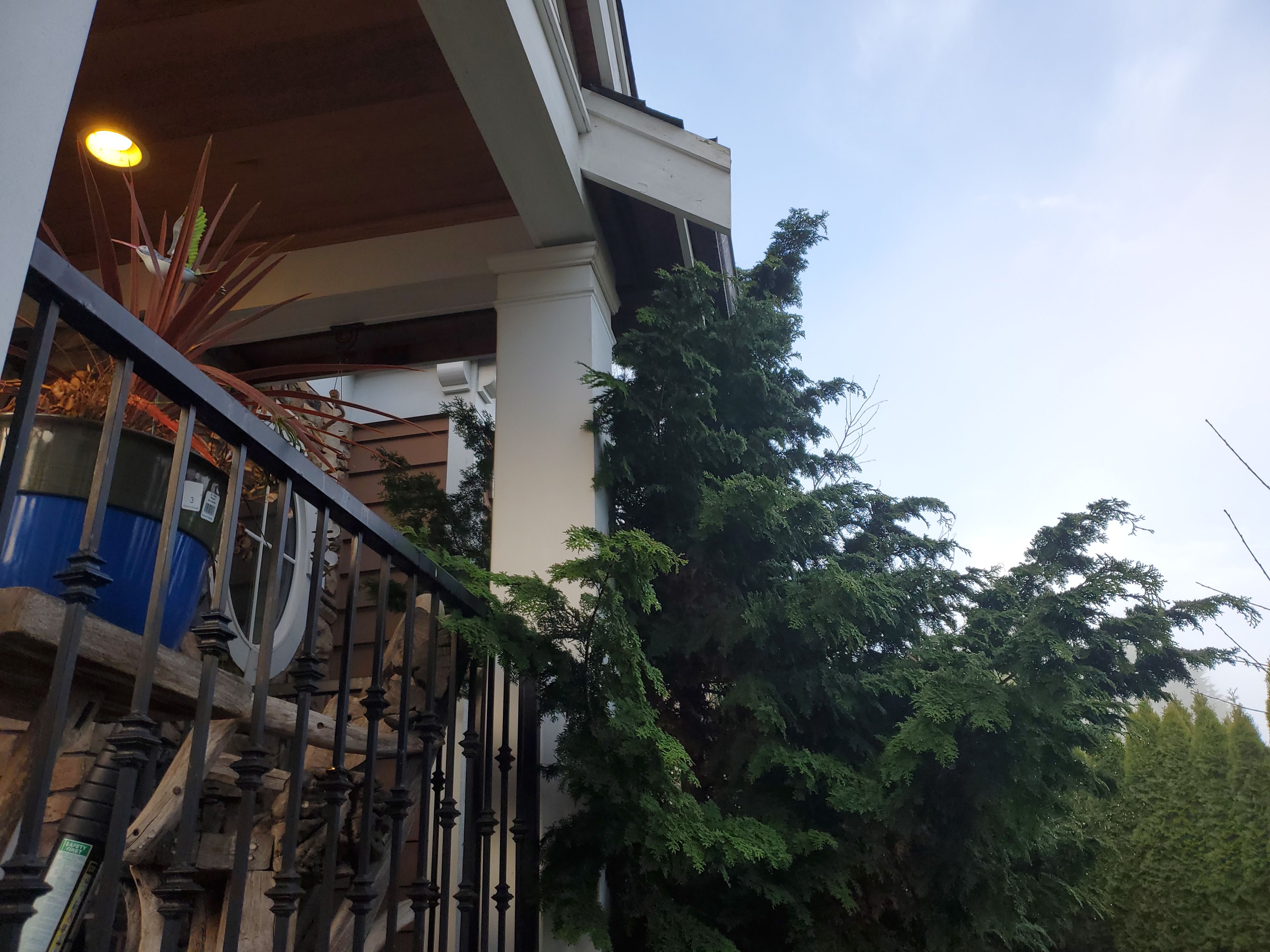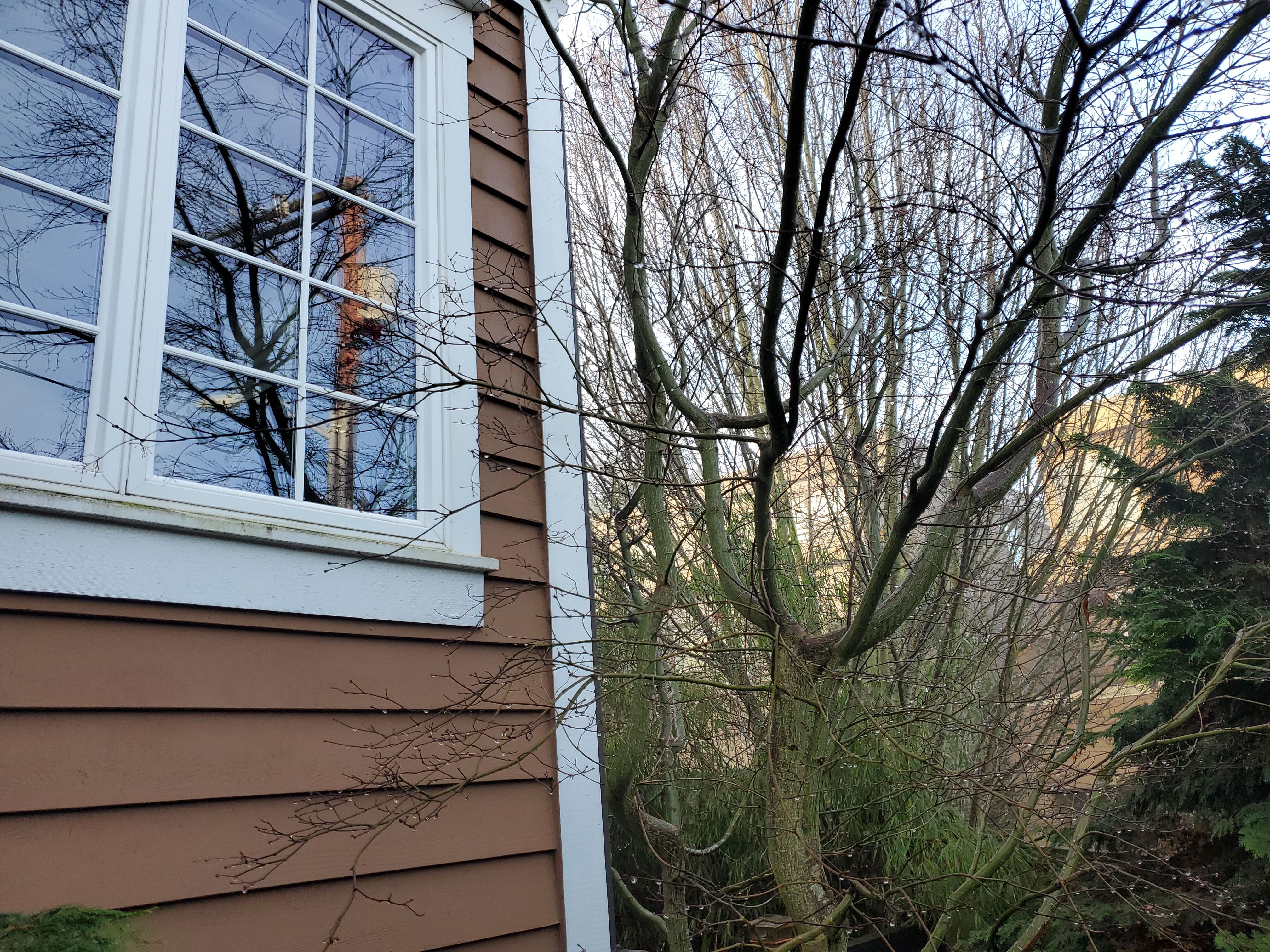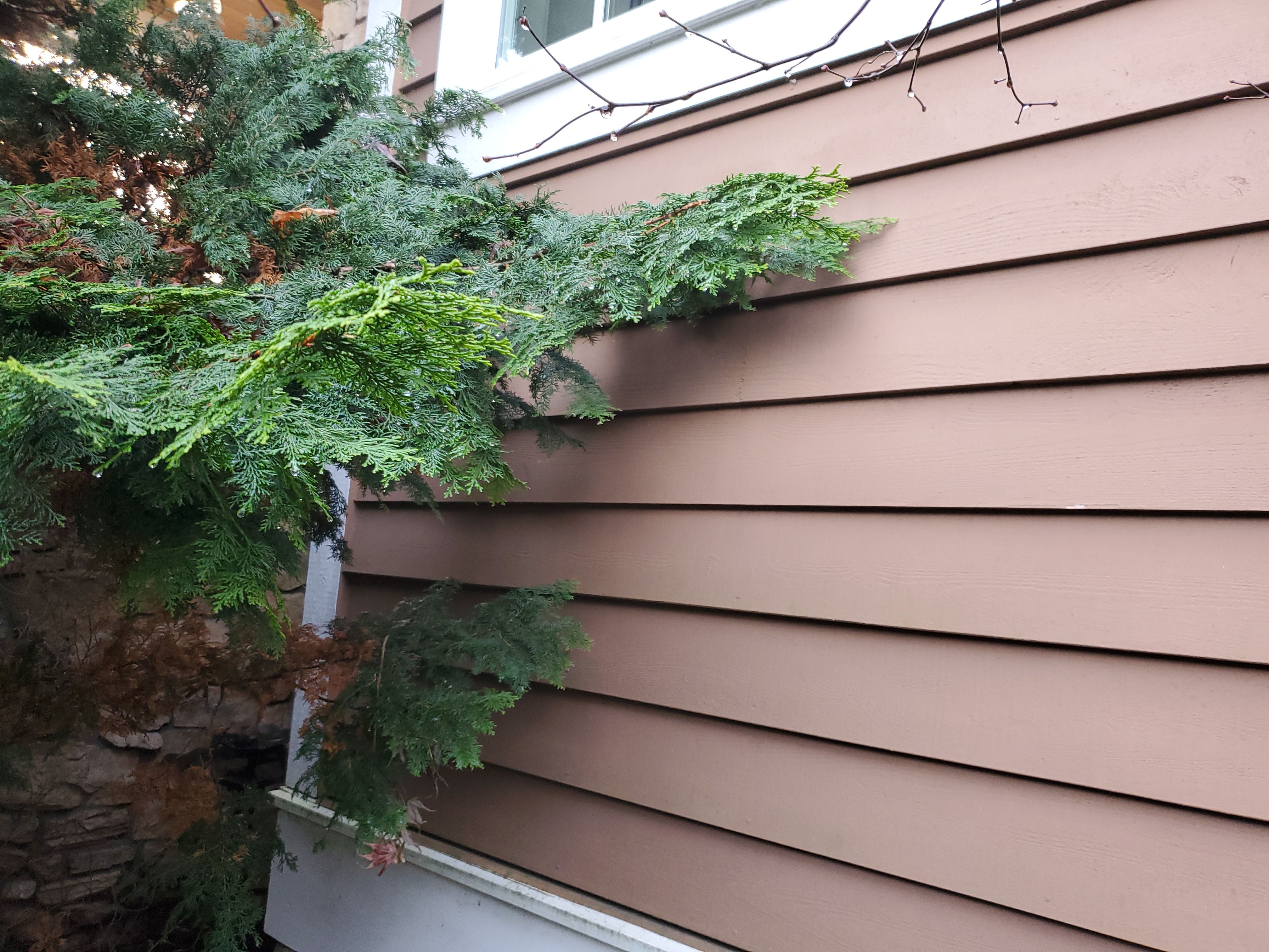 Vegetation was touching--or was in close proximity--to the siding, see photo(s.) This can trap moisture against the siding which is a conducive condition for rot, or allow a pathway onto the roof/into the attic for rodents. Recommend pruning all vegetation back to give at least 12 inches of clearance to the siding. DIY repair.