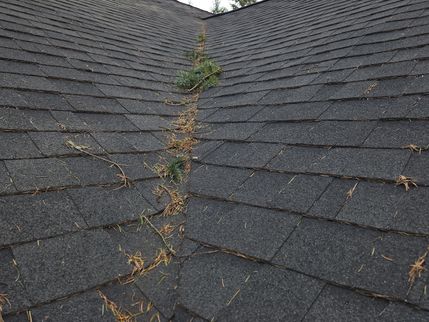 The gutters are clogged with organic debris and require cleaning to ensure proper control of roof runoff. Clean the gutters and ensure they are unobstructed, leak-free and properly sloped to drain. This is routine house maintenance; I would expect the need to clean gutters and downspouts regularly.