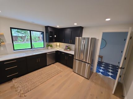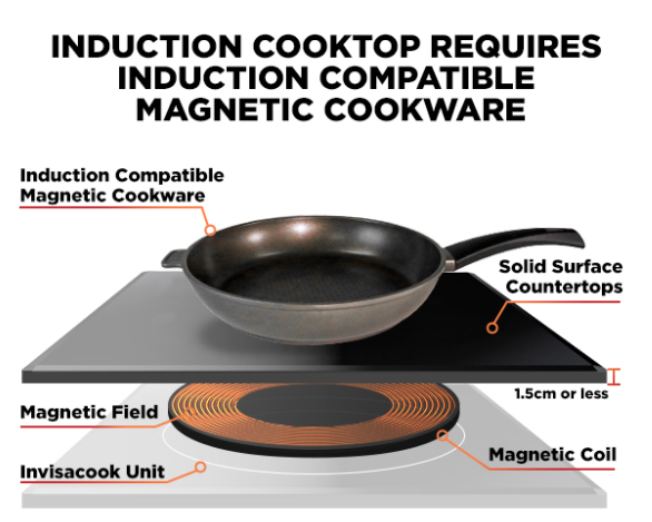 This kitchen has an induction cooktop. These are unique cooking systems and are very energy efficient. Induction cooking uses induction heating to directly heat a cooking vessel, as opposed to using heat transfer from electrical coils or burning gas as with a traditional cooking stove. For nearly all models of induction cooktop, a cooking vessel must be made of a ferromagnetic metal, or placed on an interface disk which enables non-induction cookware to be used on induction cooking surfaces.