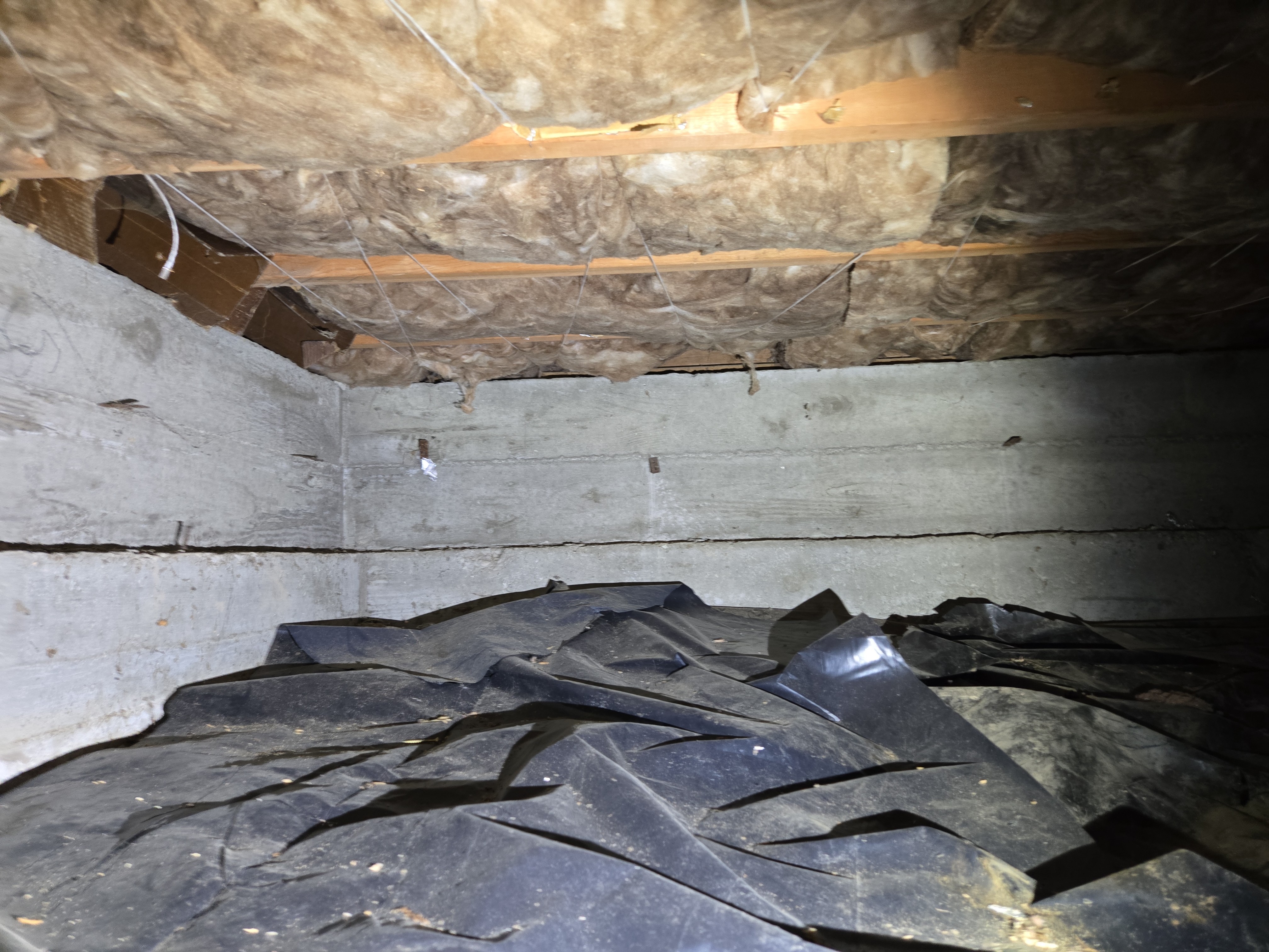 The subfloor insulation in the crawl space requires tune-up repair. Secure all loose and sagging insulation.