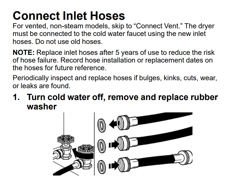 Proper dryer exhaust venting is critical for safe and reliable performance from the dryer. Here are some basic rules of thumb for dryer exhaust duct installation: Unless a vent-free appliance is being used, the dryer exhaust vent must terminate outdoors. It should be no more than 25 feet long and for every 90 degree turn subtract 5 feet and for every 45 degree bend subtract 2.5 feet. Use only smooth-wall metal vent pipe @ 4 inch pipe diameter. Do not use plastic pipe and plastic flex pipe. If a flexible connector is needed behind the dryer use a short amount of corrugated metal pipe. If the exhaust duct is getting pinched behind dryer, consider use of a dryer vent box, pictured here. Flex and corrugated pipes should never be used in concealed spaces such as through walls or in attic or crawl spaces. Insulate dryer exhaust duct where it passes through unconditioned spaces to prevent condensation that could hasten lint build-up inside the pipe. Do not use screws to connect pipe as these can trap lint. Secure duct with foil tape as needed. Be sure duct is sleeved properly so that it will not trap lint and clean the vent regularly, especially if it is a long exhaust run.