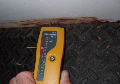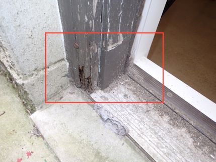 The lower portion of the doorframe on the exterior side entry door are deteriorated and elevated moisture levels were measured. In order to reduce the potential for further moisture related damage, it is recommended that a qualified carpenter evaluate and replace the deteriorated portions of the doorframe, possibly with materials that are less affected by moisture like PVC lumber.