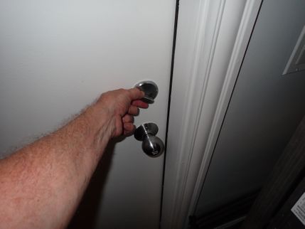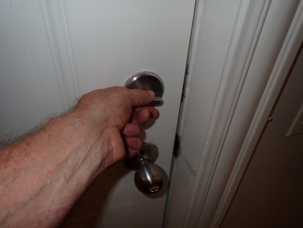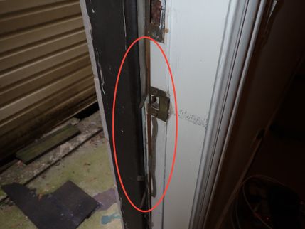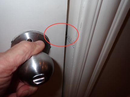 The door latch on the exterior entrance door is damaging the doorframe. In order to prevent recurring disfigurement and damage to the doorjamb(s), the installation of an extended strike plate by a qualified carpenter or handyman is recommended.