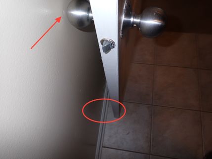 Damaged finishes were noted on the walls adjacent to many of the doors. In order to protect the adjacent finishes and components from damage, door stops (hinge mounted, floor mounted, or wall mounted) should be installed by a qualified handyman.