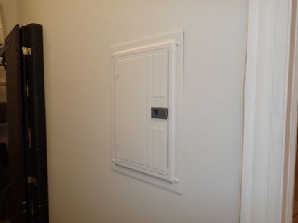 The cover for the electric service panel has been painted. This makes the cover difficult to remove and although the inspector took measures like scoring the paint along the edges of the cover with a utility knife, the painted surfaces were damaged in the process of removing the cover. It is highly recommended that the panel cover not be re-painted and that an appropriate piece of art or other wall covering be used to cover the panel.