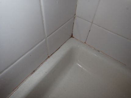 Portions of the caulk between the bathtub and tub/shower wall tile appear to have a mold like substance in/on it. Once mold has penetrated into the body of the caulk it typically cannot be successfully eliminated and for proper appearance the caulk should be removed and replaced by a qualified contractor.