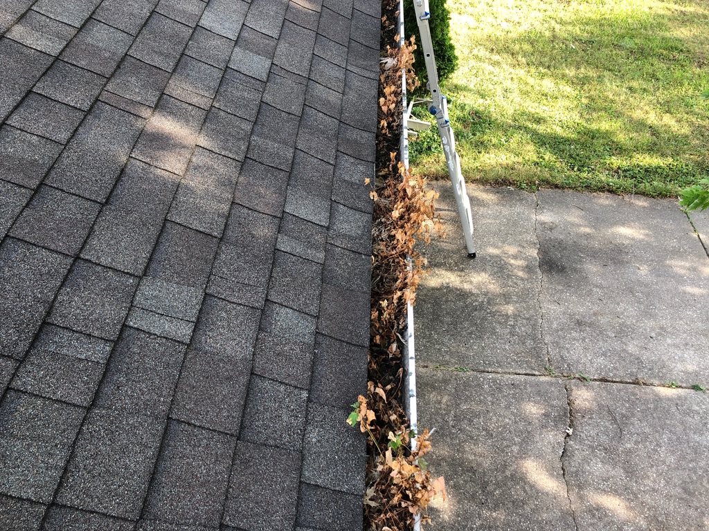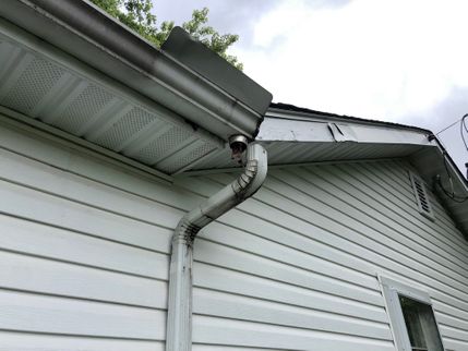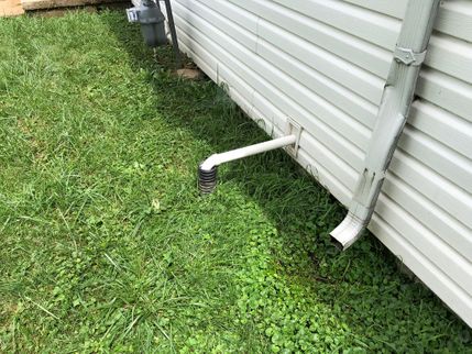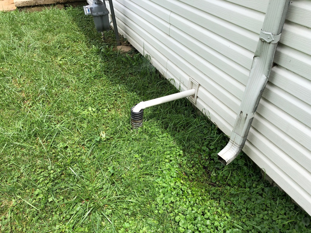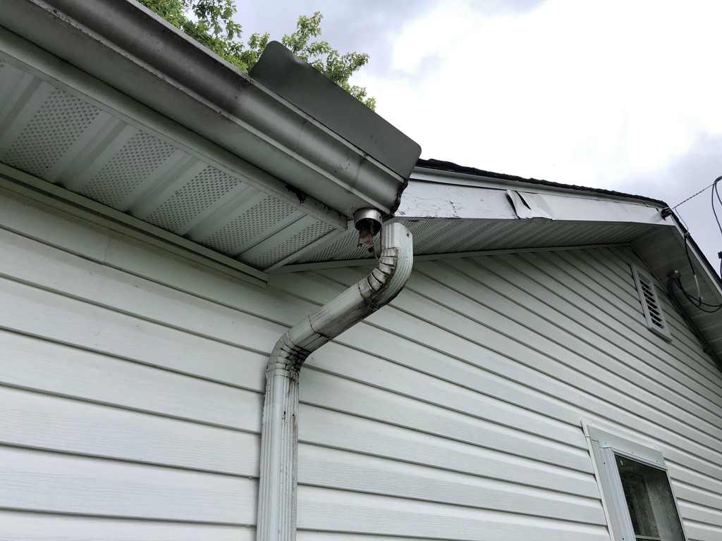 The disconnected downspout requires immediate repair to prevent water damage to the side of the building.