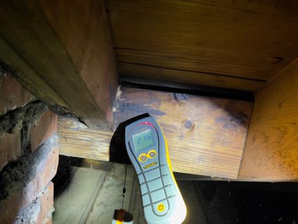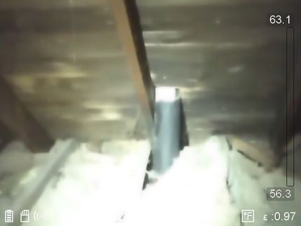 Indications of a roof leak around the chimney are evident by the staining on the rafters/sheathing. Additional staining/damage is noted on the insulation below this area. This is also observed with the IR camera and a moisture meter. This would typically be due to poor or missing flashing. Roof tar is observed at the base of the chimney (photo is not taken). Have a qualified roofer evaluate and repair the flashing around the chimney as needed.