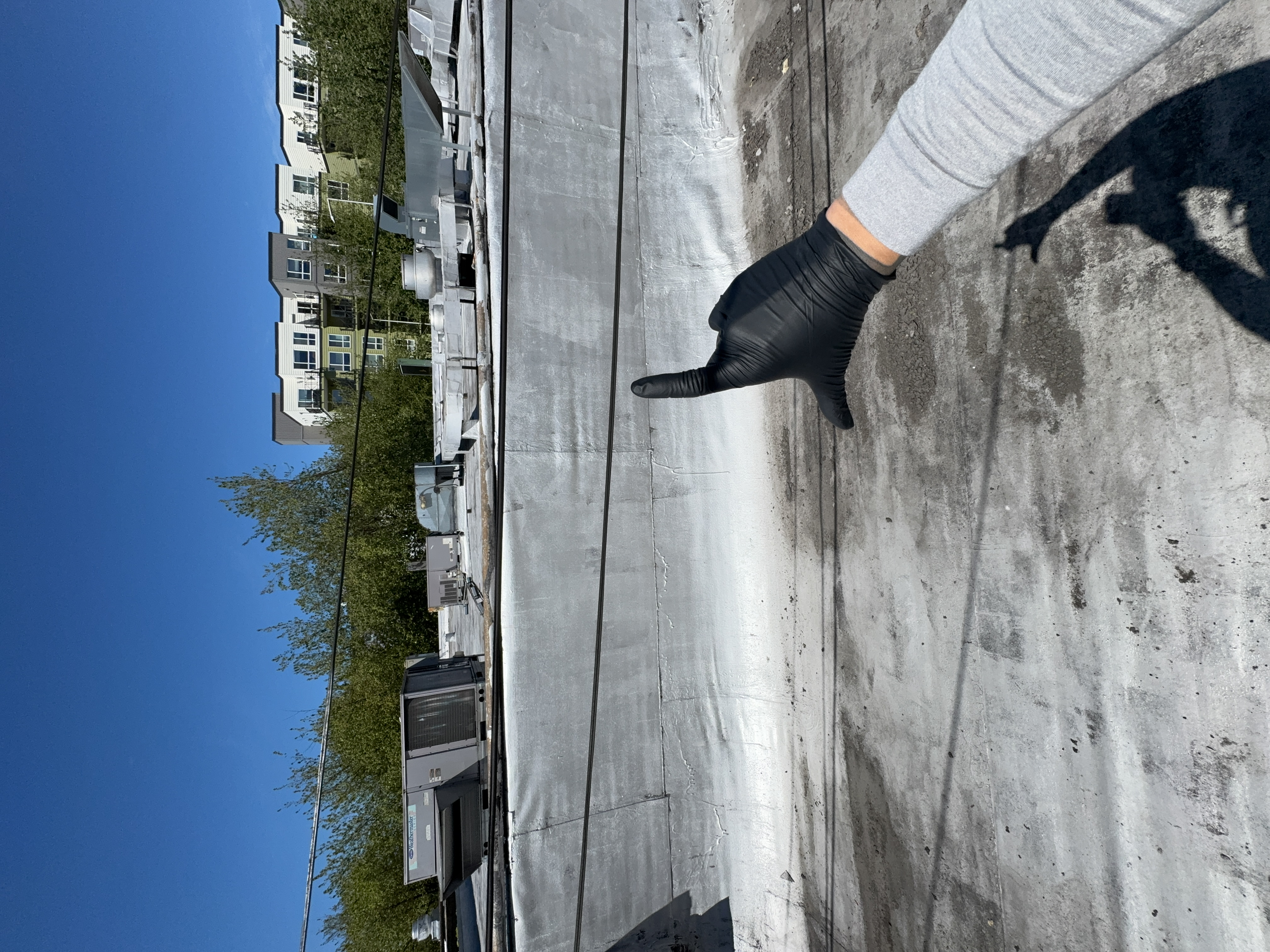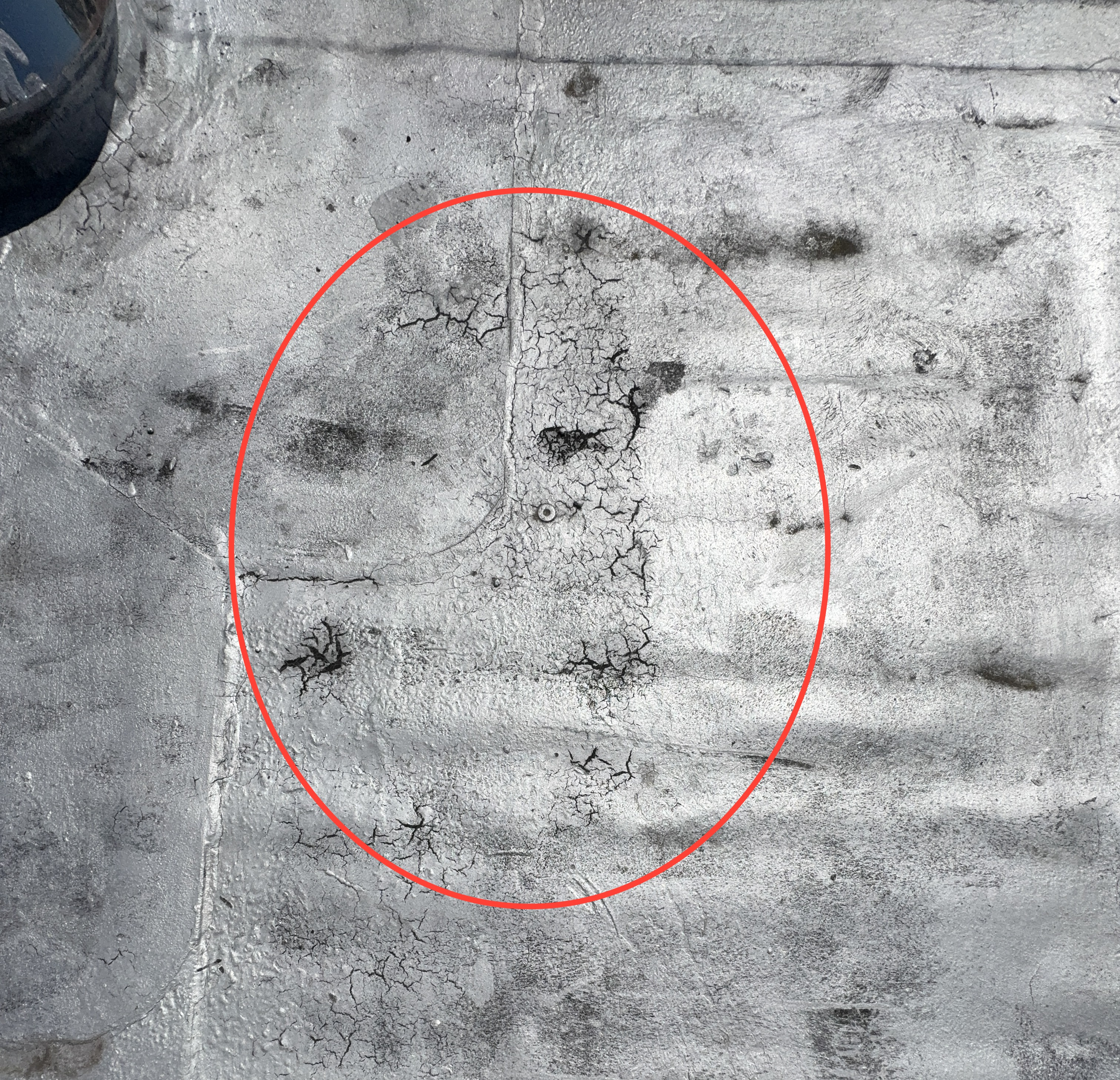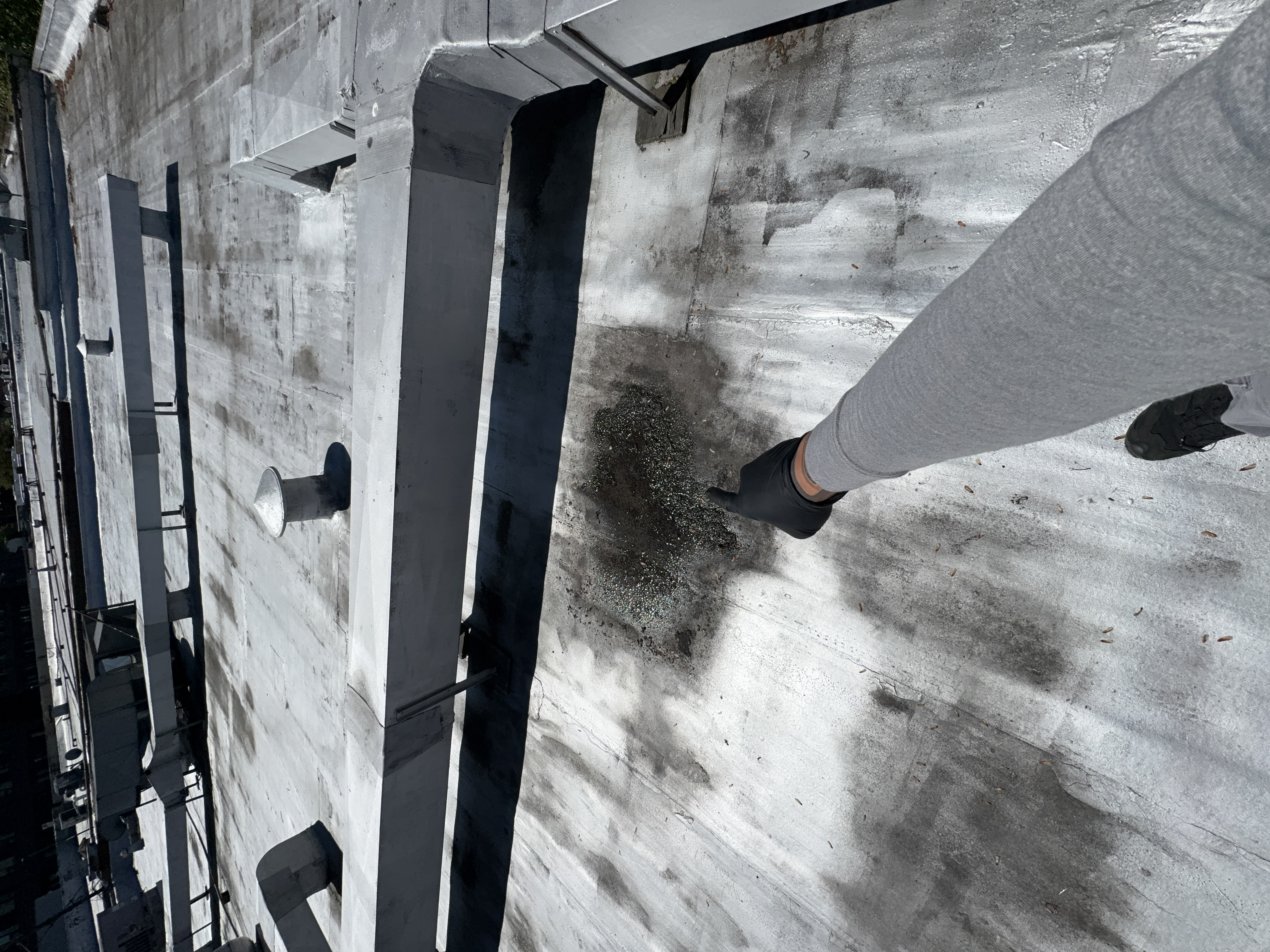- The roof currently has a silver coating, which indicates that the underlying original roofing material is no longer in good condition. The coating is showing signs of blistering in several areas, which suggests deterioration and I’m recommending reapplication if a full roof replacement is not planned at this time. However, it may be more effective and cost-efficient in the long run to replace the entire roof instead of adding another layer of coating.