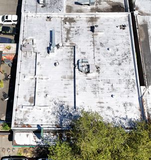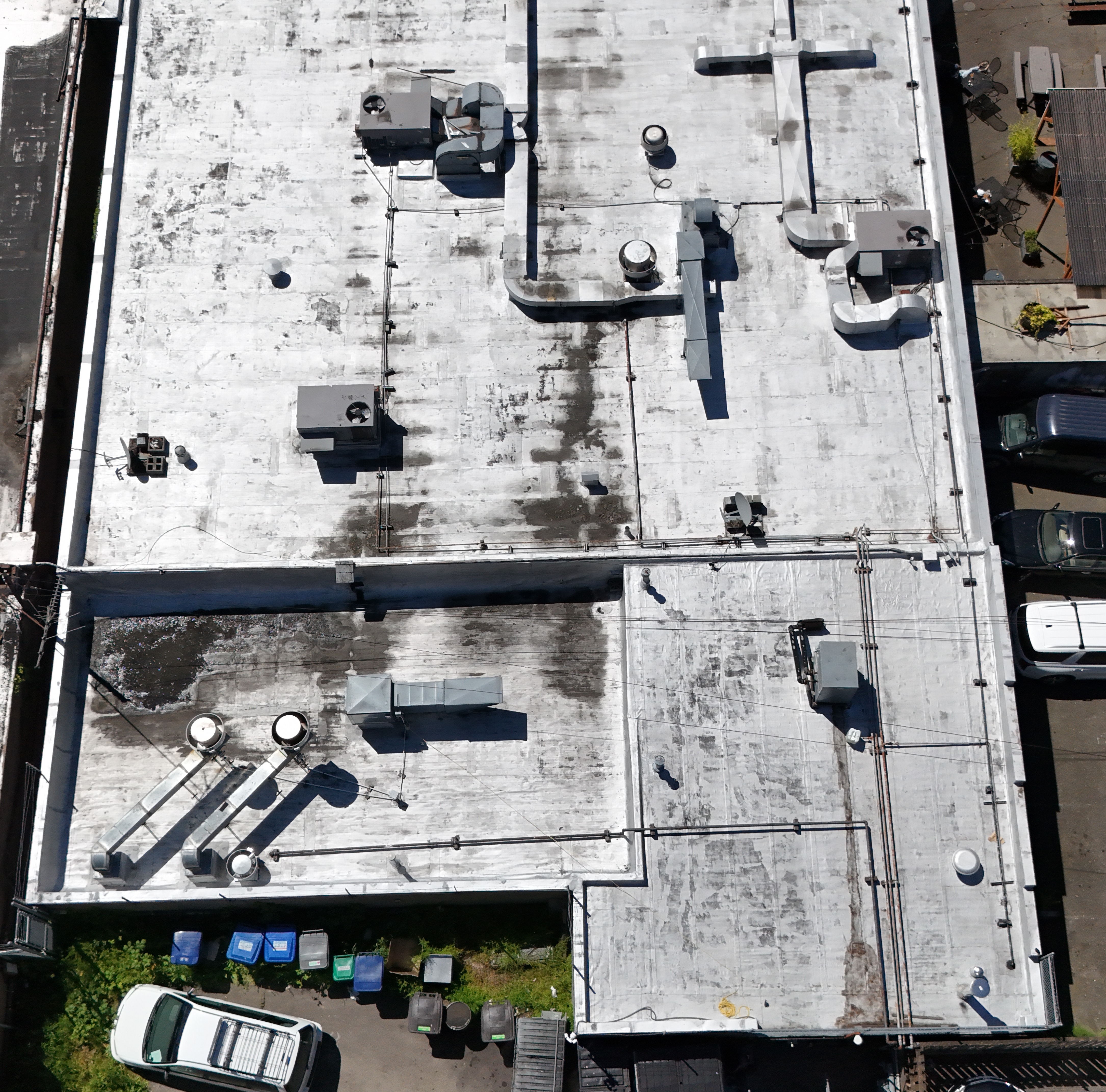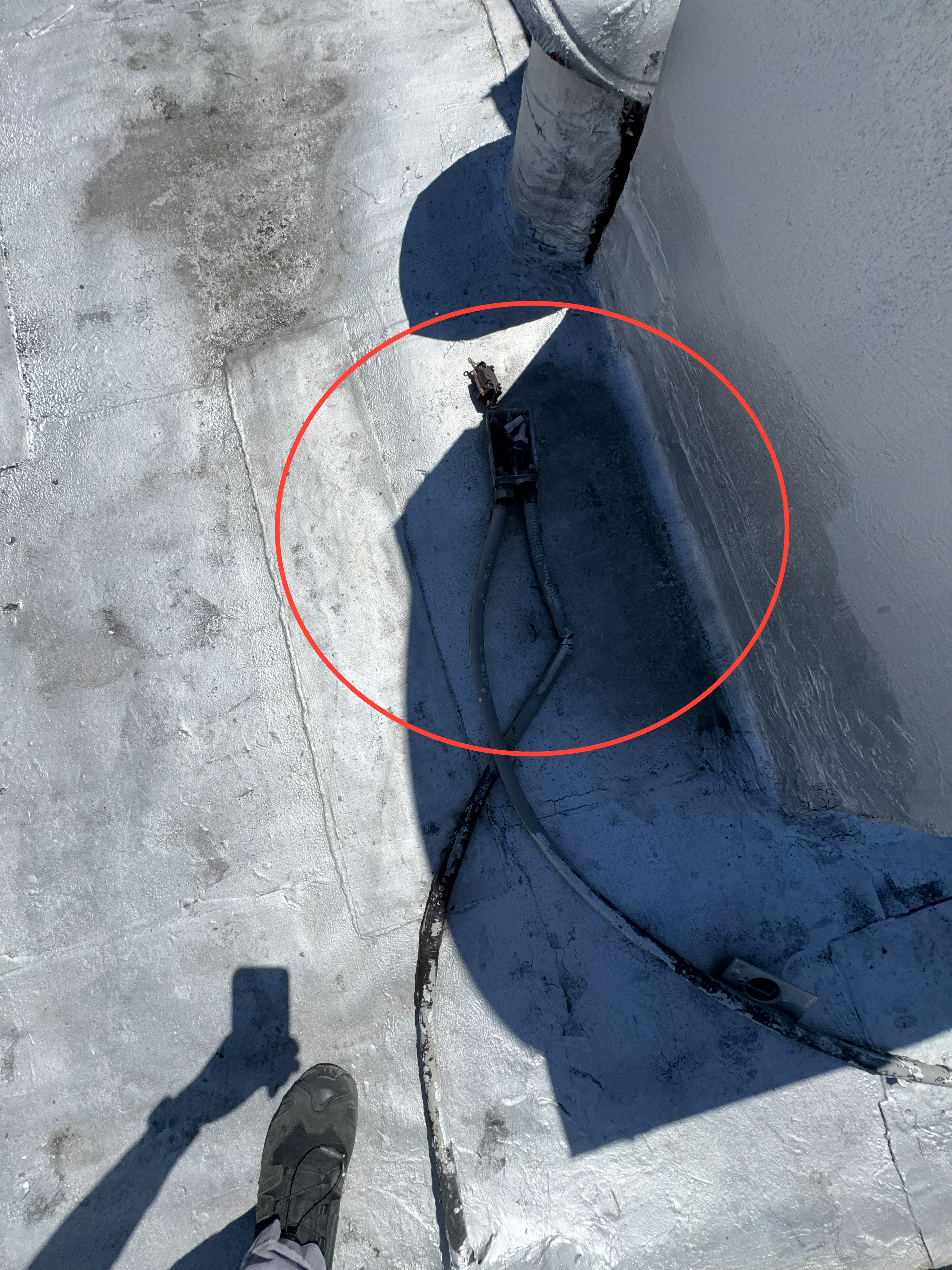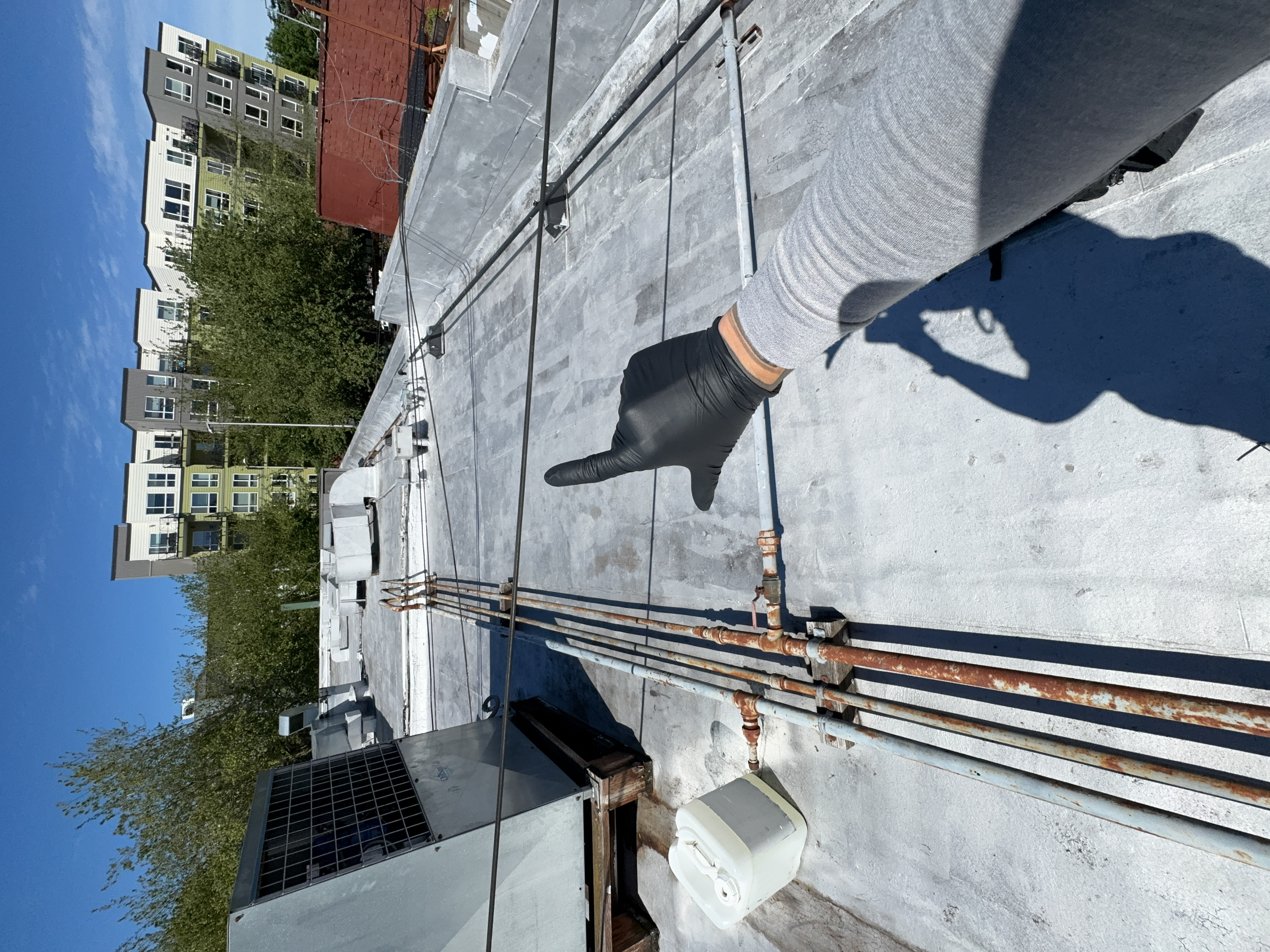 - The roof currently has a silver coating, which indicates that the underlying original roofing material is no longer in good condition. The coating is showing signs of blistering in several areas, which suggests deterioration and I’m recommending reapplication if a full roof replacement is not planned at this time. However, it may be more effective and cost-efficient in the long run to replace the entire roof instead of adding another layer of coating.