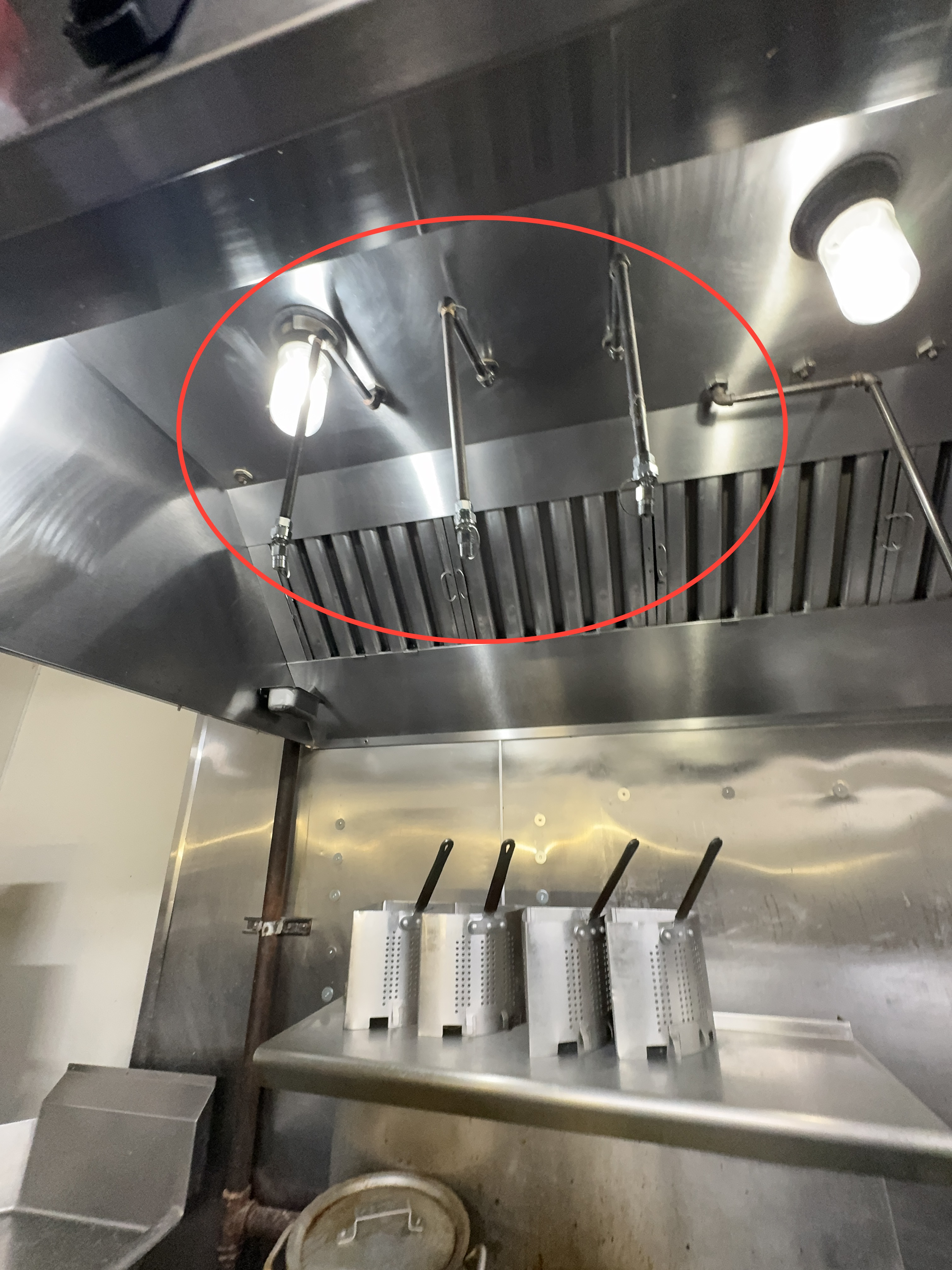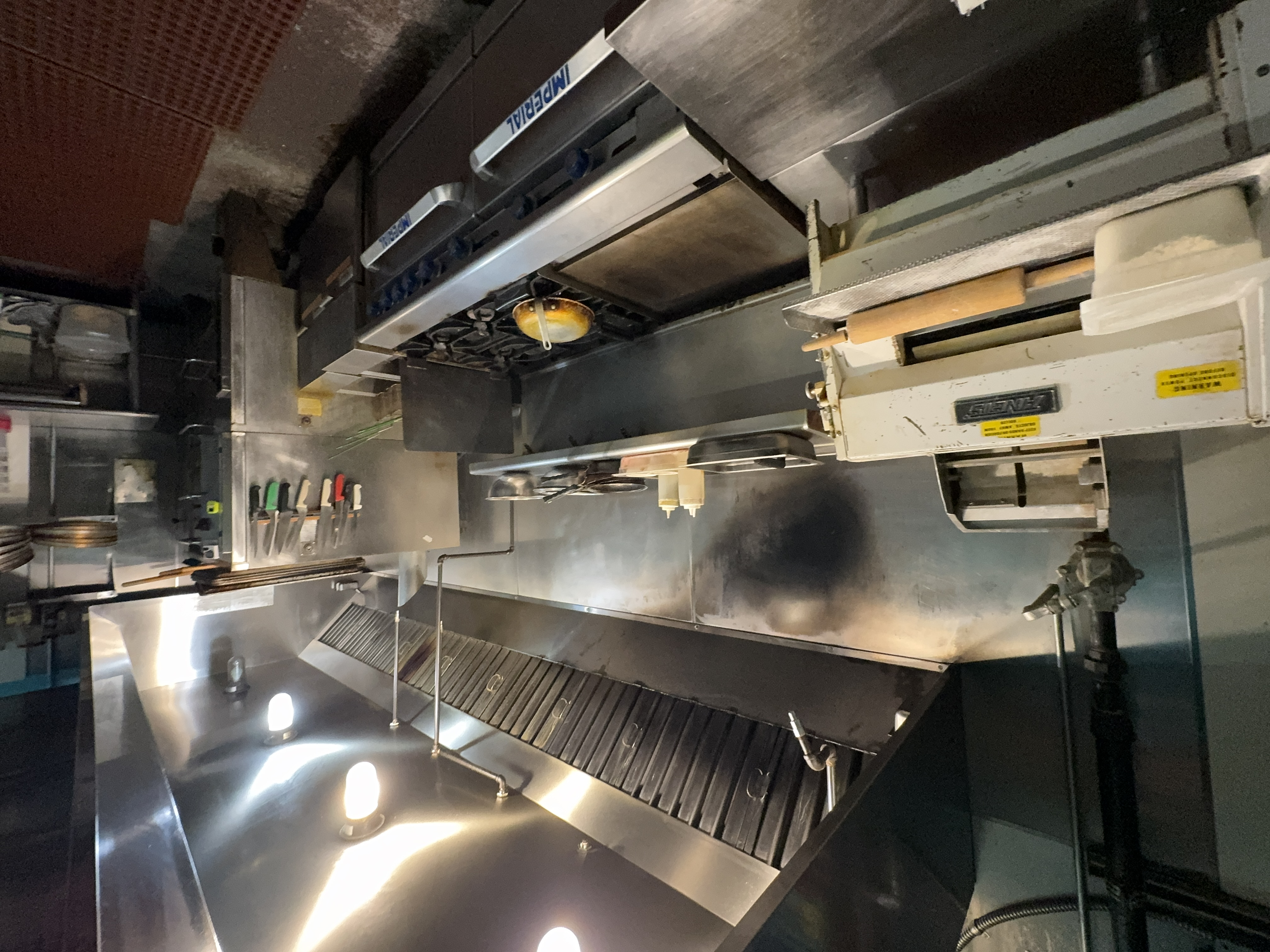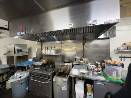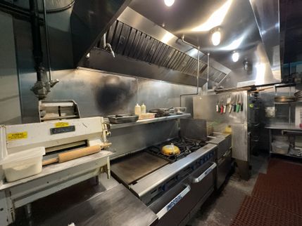 The kitchen is equipped with a Type 1 hood designed to exhaust grease, steam, and heat from the kitchen and bar area. During the inspection, these systems were operational. Regular cleaning and maintenance of the hood and exhaust filters are necessary to ensure proper performance, prevent grease buildup, and comply with fire safety standards.