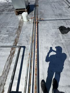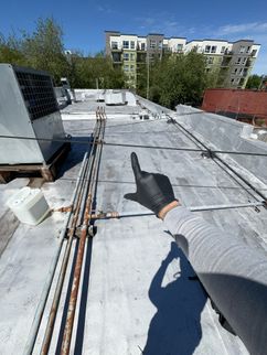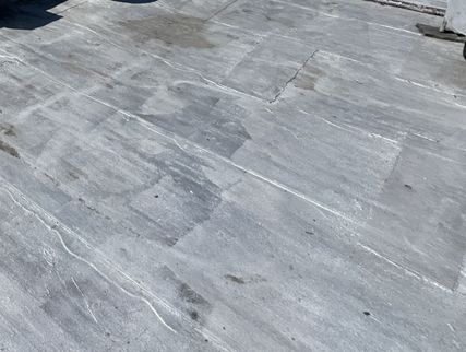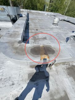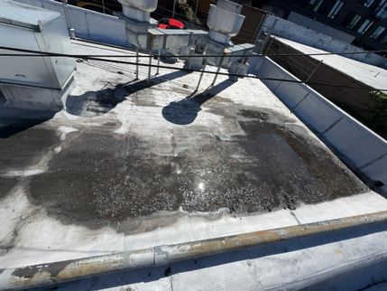 - There is significant water ponding observed in multiple areas of the roof, indicating poor drainage design or inadequate slope. This standing water can accelerate deterioration of the roofing materials and is likely to lead to leaks or structural damage over time if not addressed.