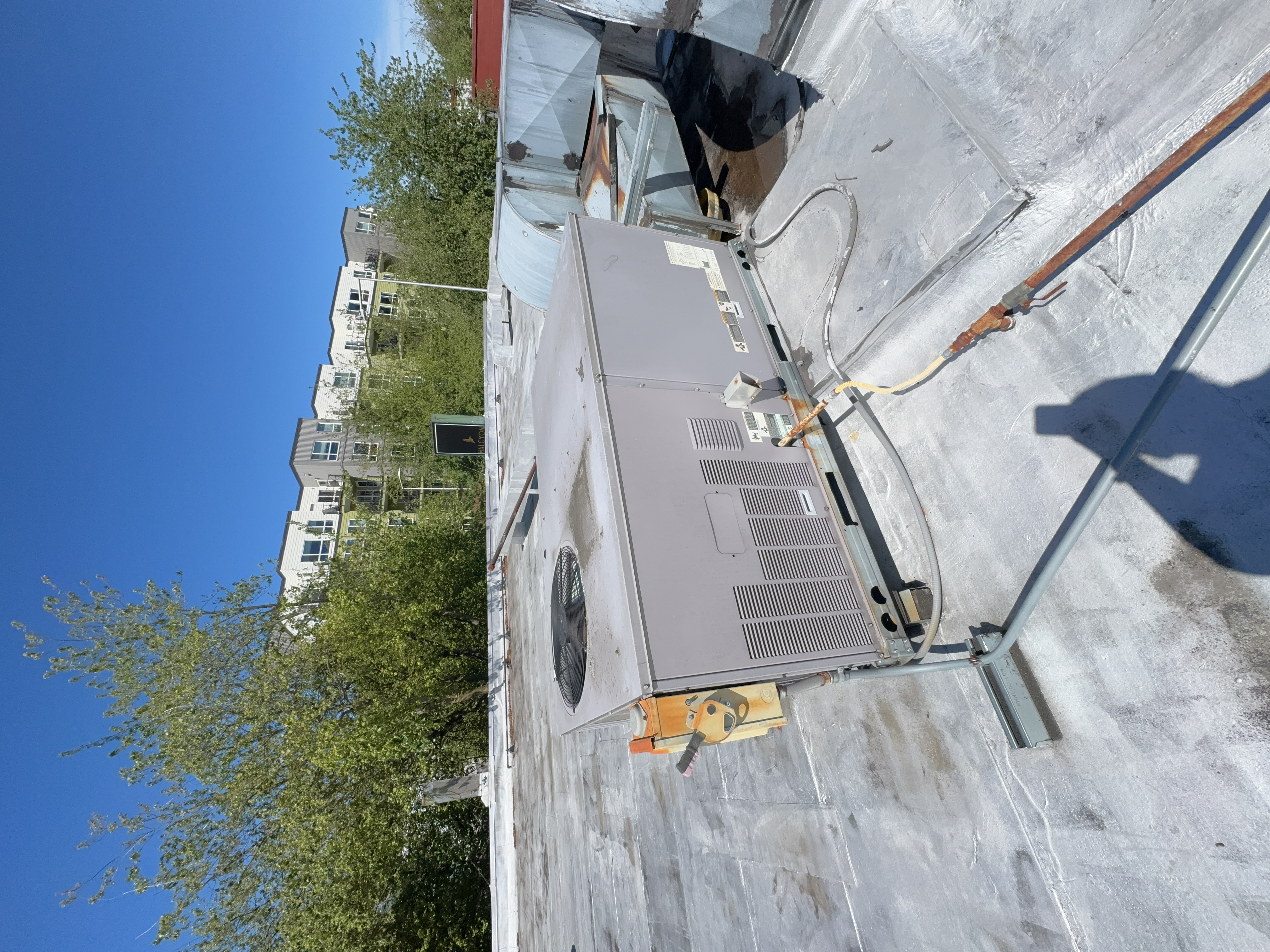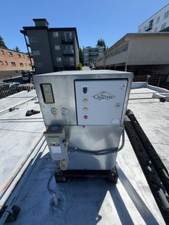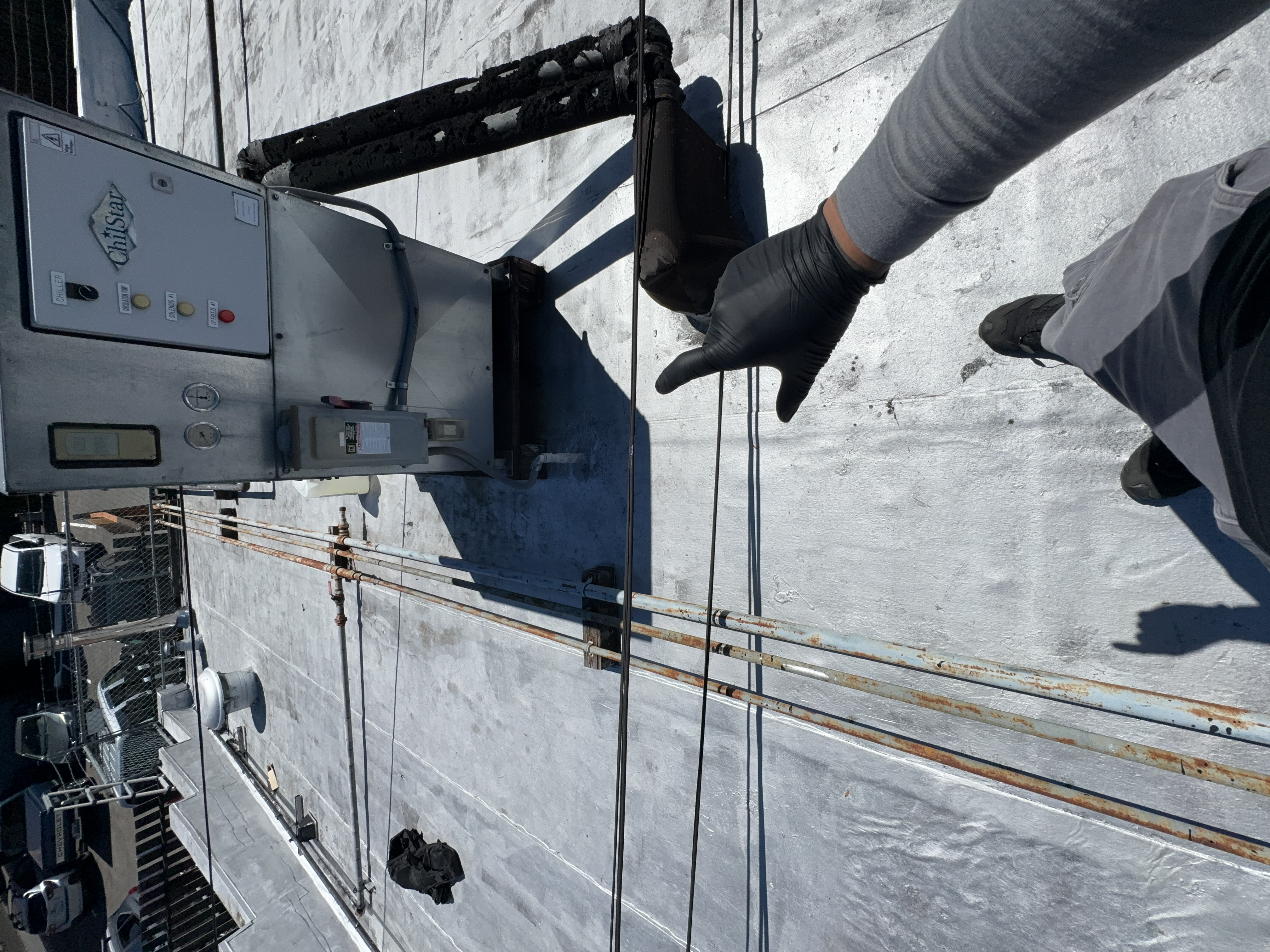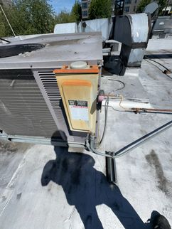 The chiller on the roof has worn out insulation. It is recommended to add insulation to improve efficiency and prevent energy loss.