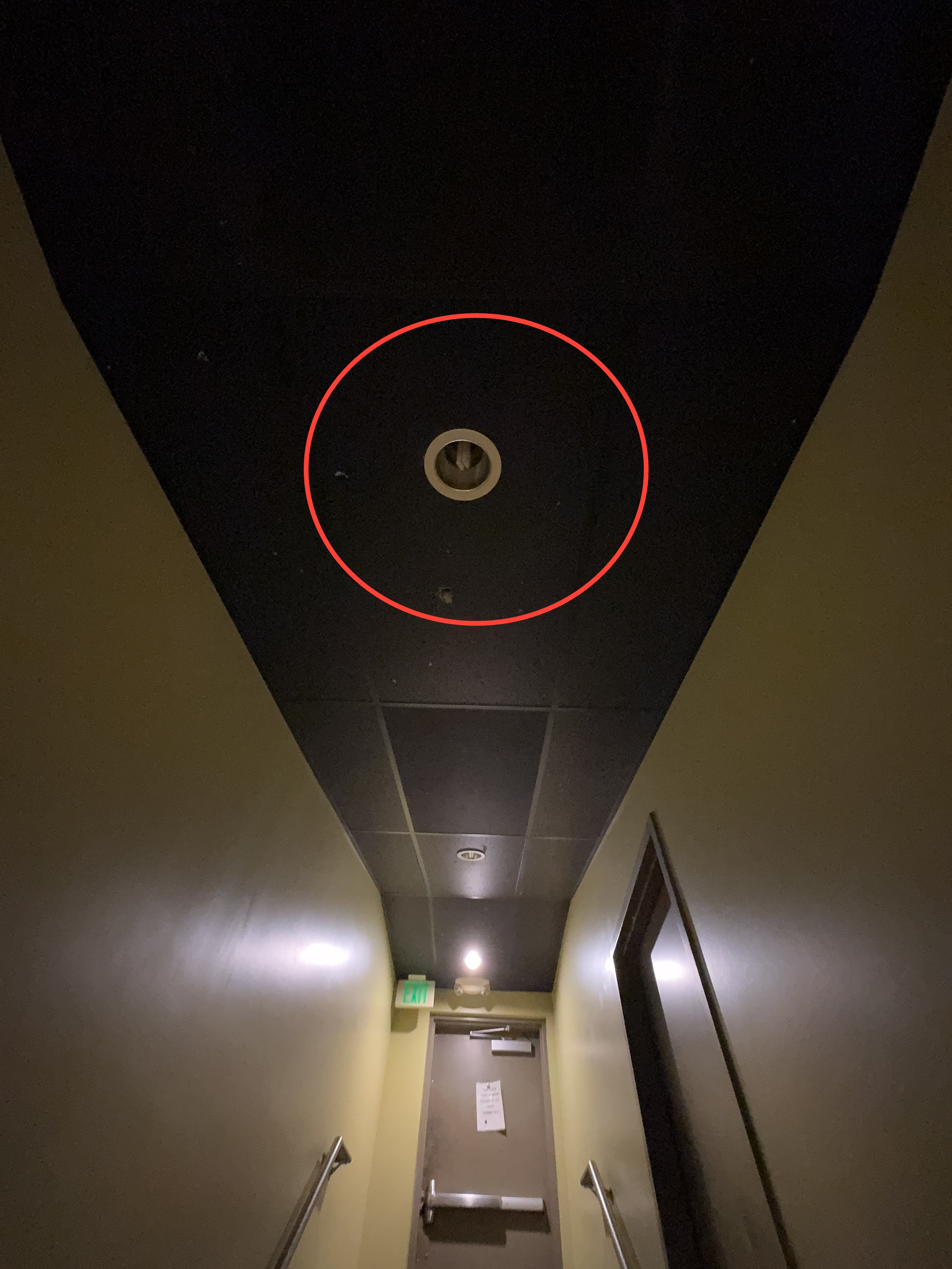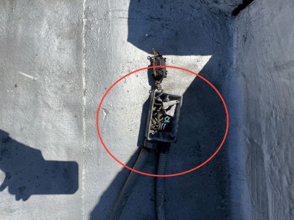 The open electrical junction box needs to be covered for improved safety - see roof top. This is as simple as installing a cover plate over the box to protect the wiring. Sometimes, an extension ring is needed if finishes are covering the box. Repair as needed for improved safety.