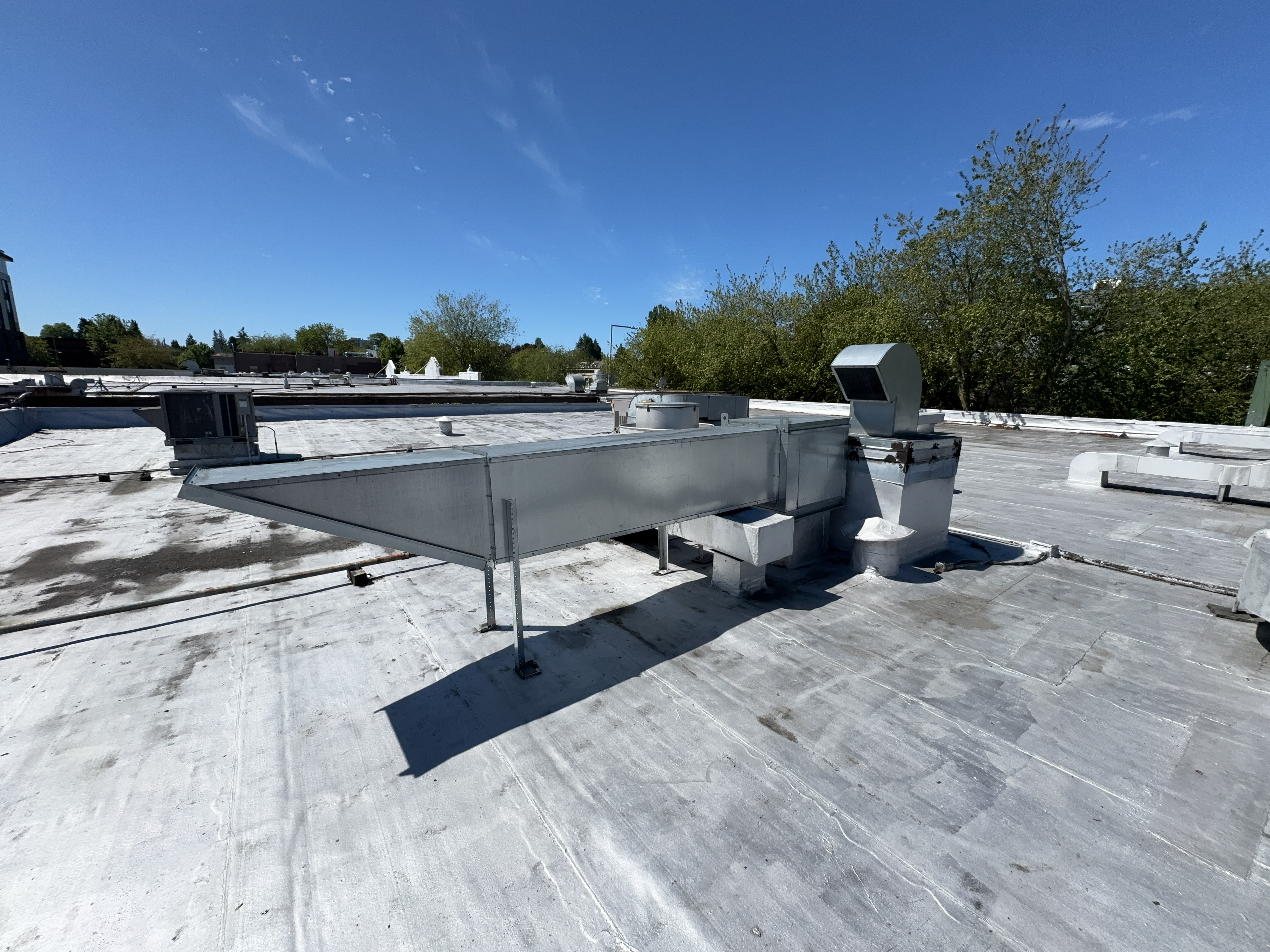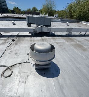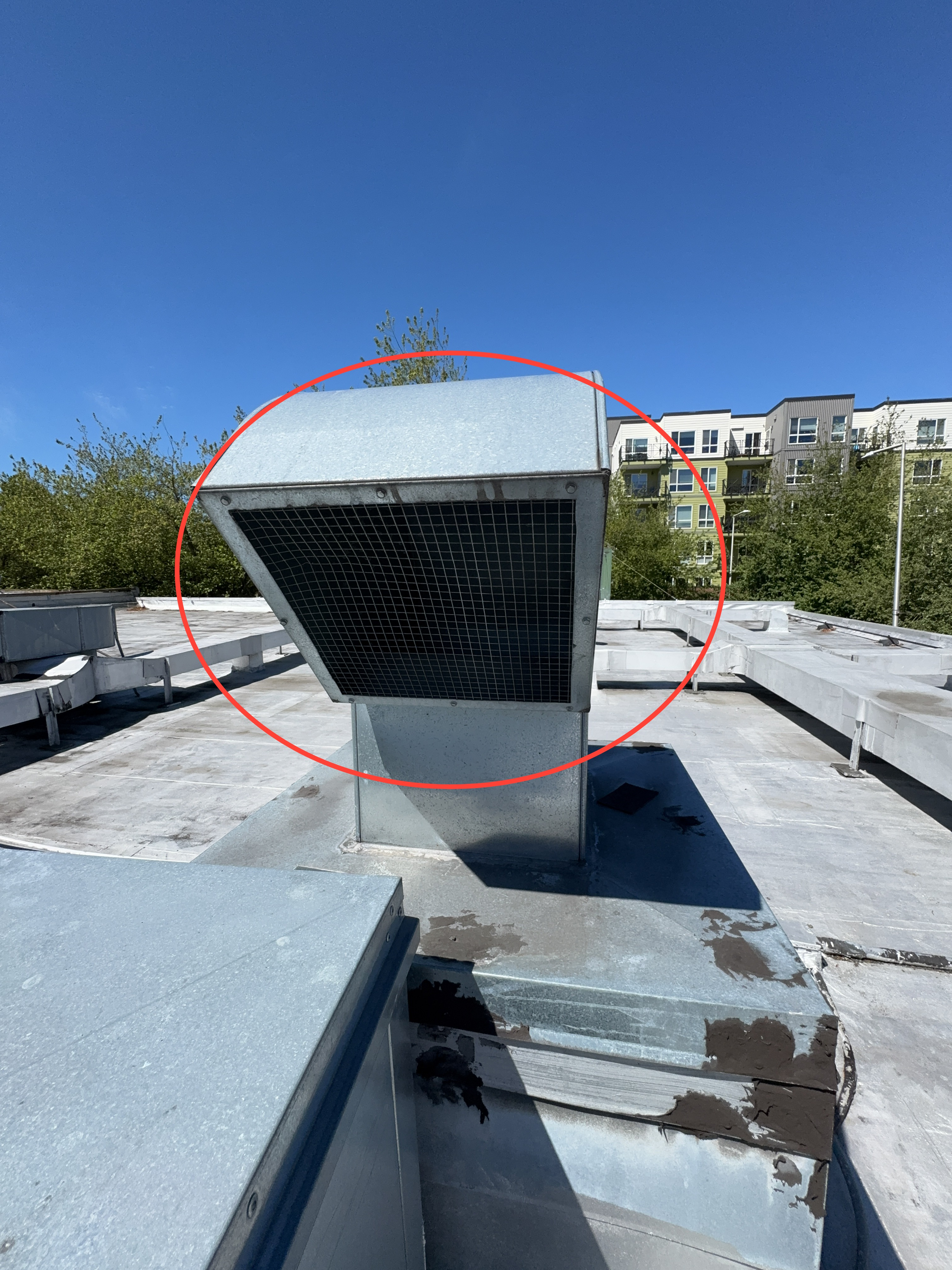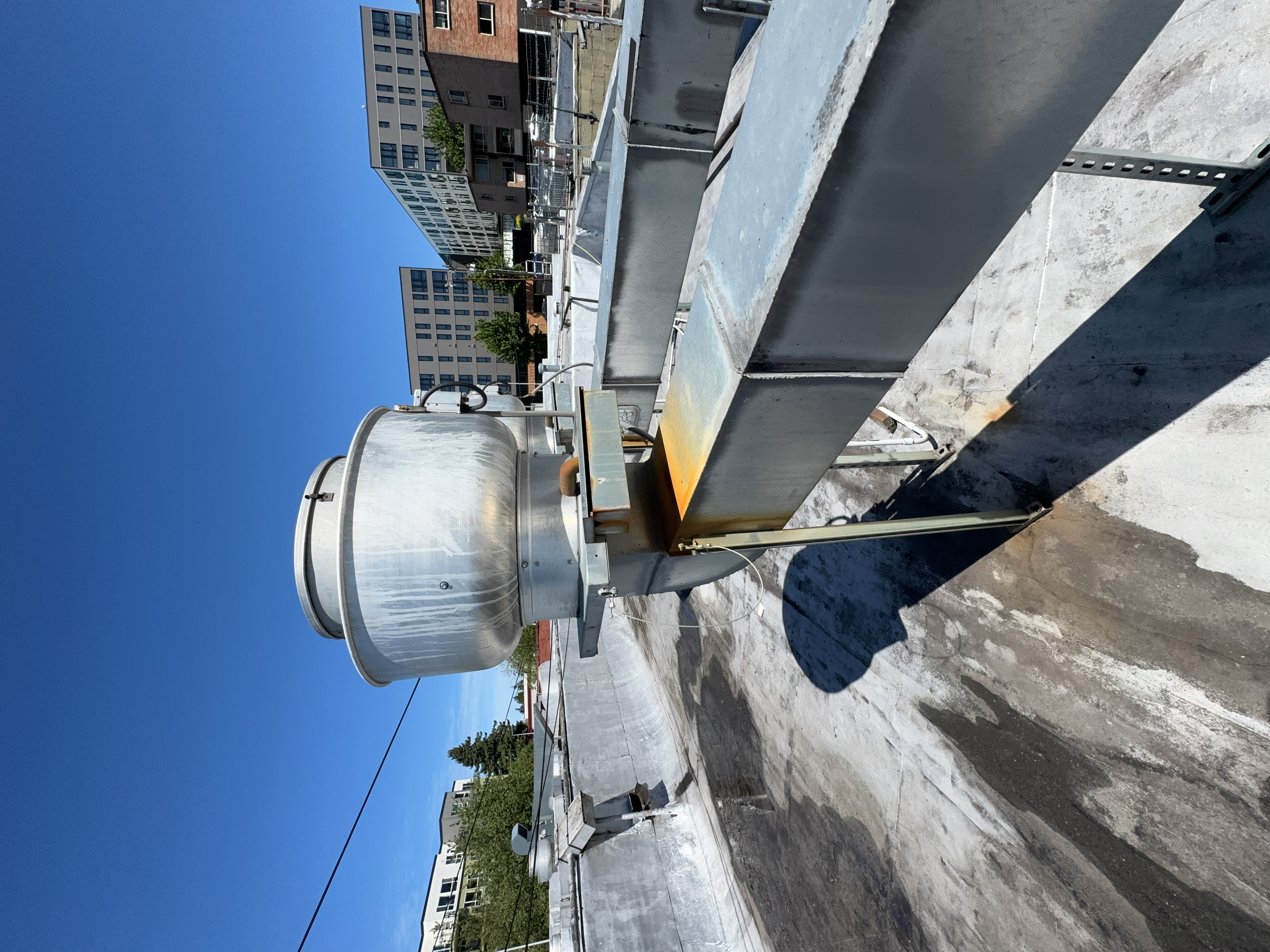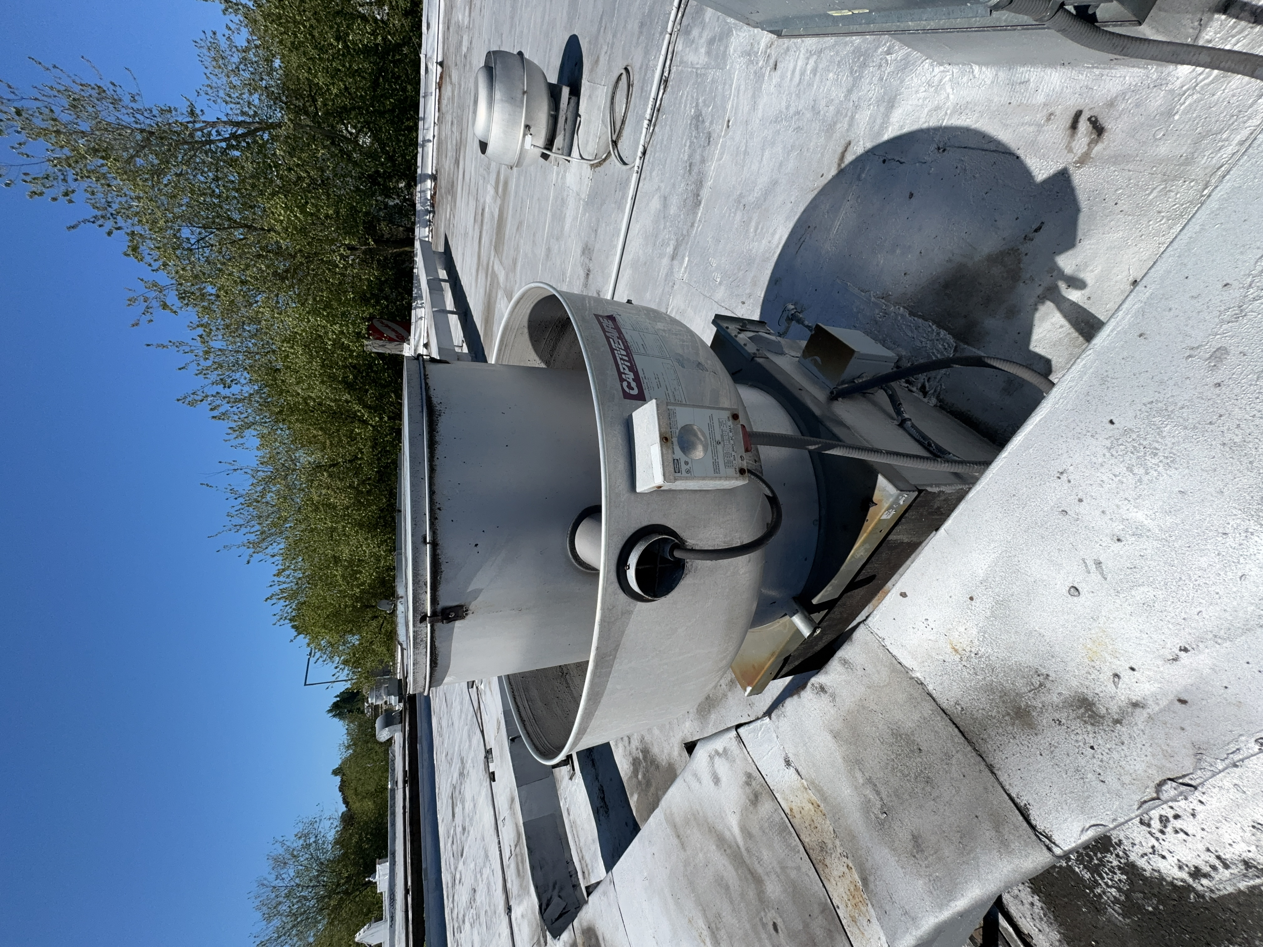 During our inspection, we noted that the up-blast exhaust system on the roof is excessively vibrating during operation. This could affect system performance and safety. We recommend consulting a professional HVAC technician for further diagnosis and necessary repairs or replacement of components like fan blades, bearings, or mounts. Regular maintenance is also advised to prevent future issues.