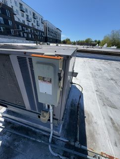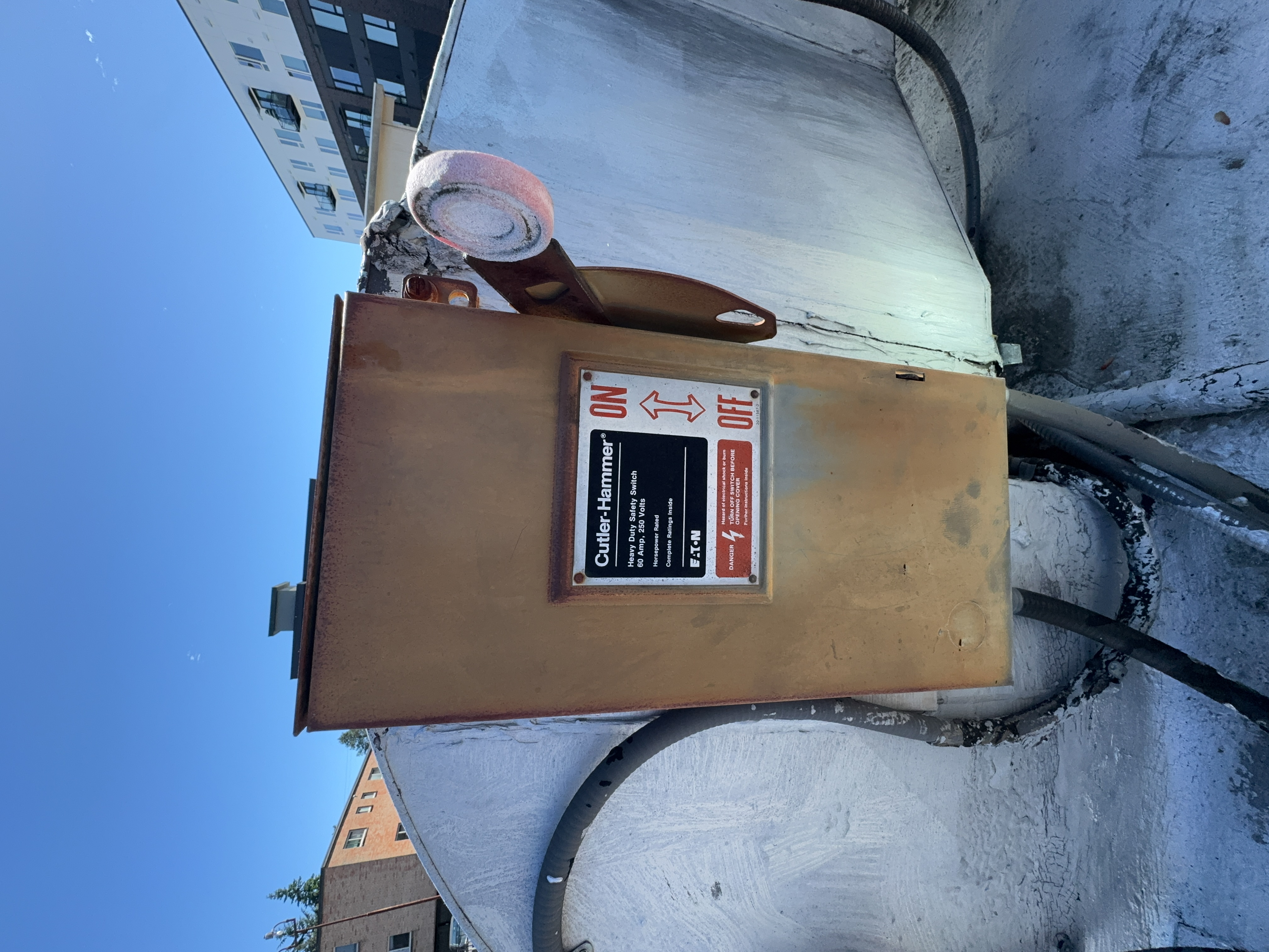 Rust noted at the exterior electrical disconnect. Repair and treatment are recommended to prevent further corrosion and ensure safety.