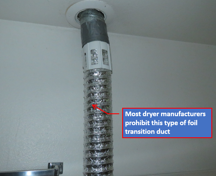 - The short piece of duct that connects the dryer to the pipe that runs to the exterior of the building is called the dryer transition duct or connector. This connector is required to be UL-2158A listed and be constructed of smooth wall metal, corrugated metal, or foil types that are UL-2158A listed. Dryer manufacturers do not recommend foil type connectors, and most “common” foil type air connectors do not meet the required standard. Under extreme heat (during field testing) aluminum ducts of all kinds do poorly as connectors (even when UL-2158A listed), but the common foil types perform much worse and should never be used as transition duct. All of these types of transition ducts are extremely vulnerable to mechanical damage, which results in either leaks or restriction of air flow. There is one foil type dryer transition duct, that exceeds UL-2158A standard that holds up much better under extreme heat than either smooth wall metal or corrugated metal and is the one I recommend as best practice. DryerFlex™ type of transition connector typically cannot be purchased from your local big-box stores and is sold by duct cleaning and maintenance companies--or can be ordered on line.