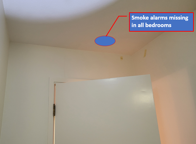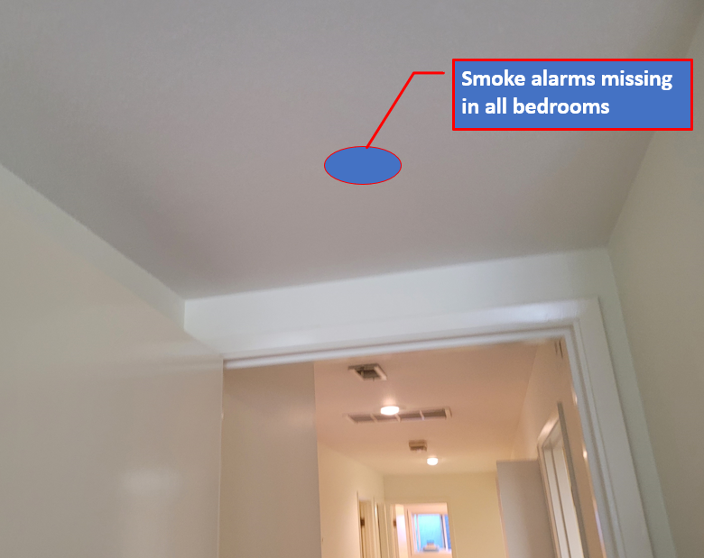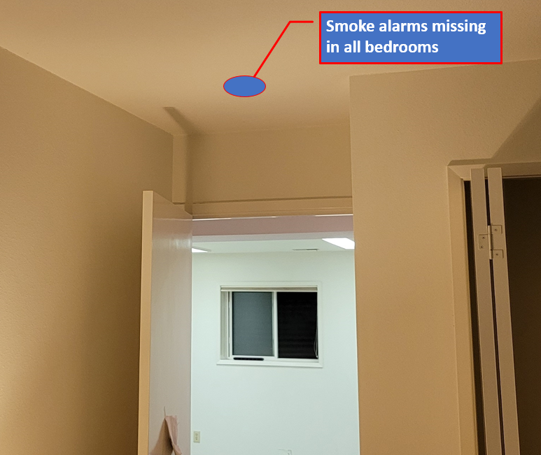 - 🚩None seen. I recommend installation of smoke alarms for improved safety. Smoke alarms were not found in the sleeping rooms or other rooms that could be sleeping areas or at other required locations around the home: